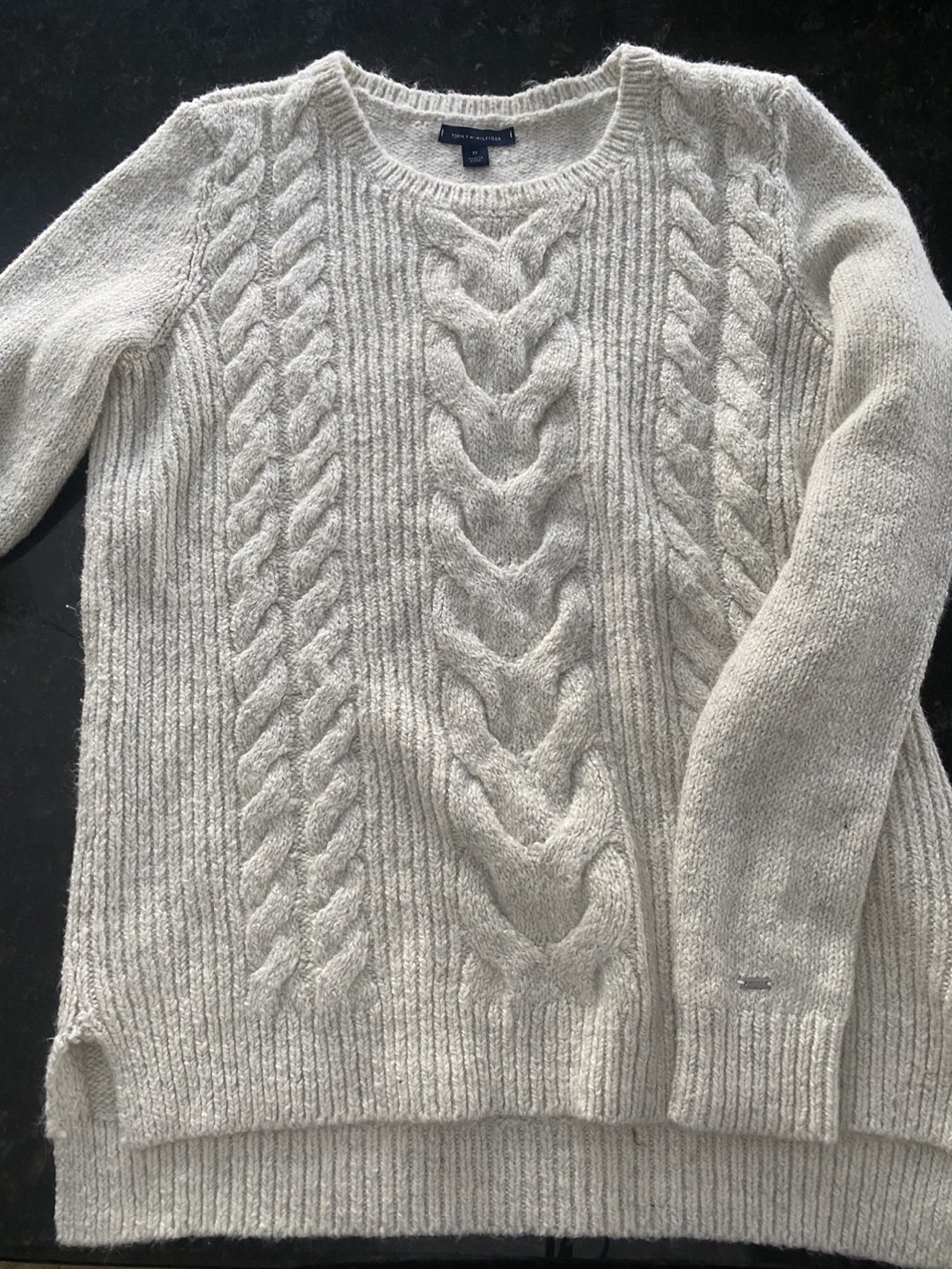 Super soft yet warm sweater by Tommy Hilfiger, size M. Great quality, not worn by me, 58% cotton, 26% acrylic 13% polyester 1%elastane 2%other fiber. Not worn at all, after purchasing at thrift store. Size is on the large size