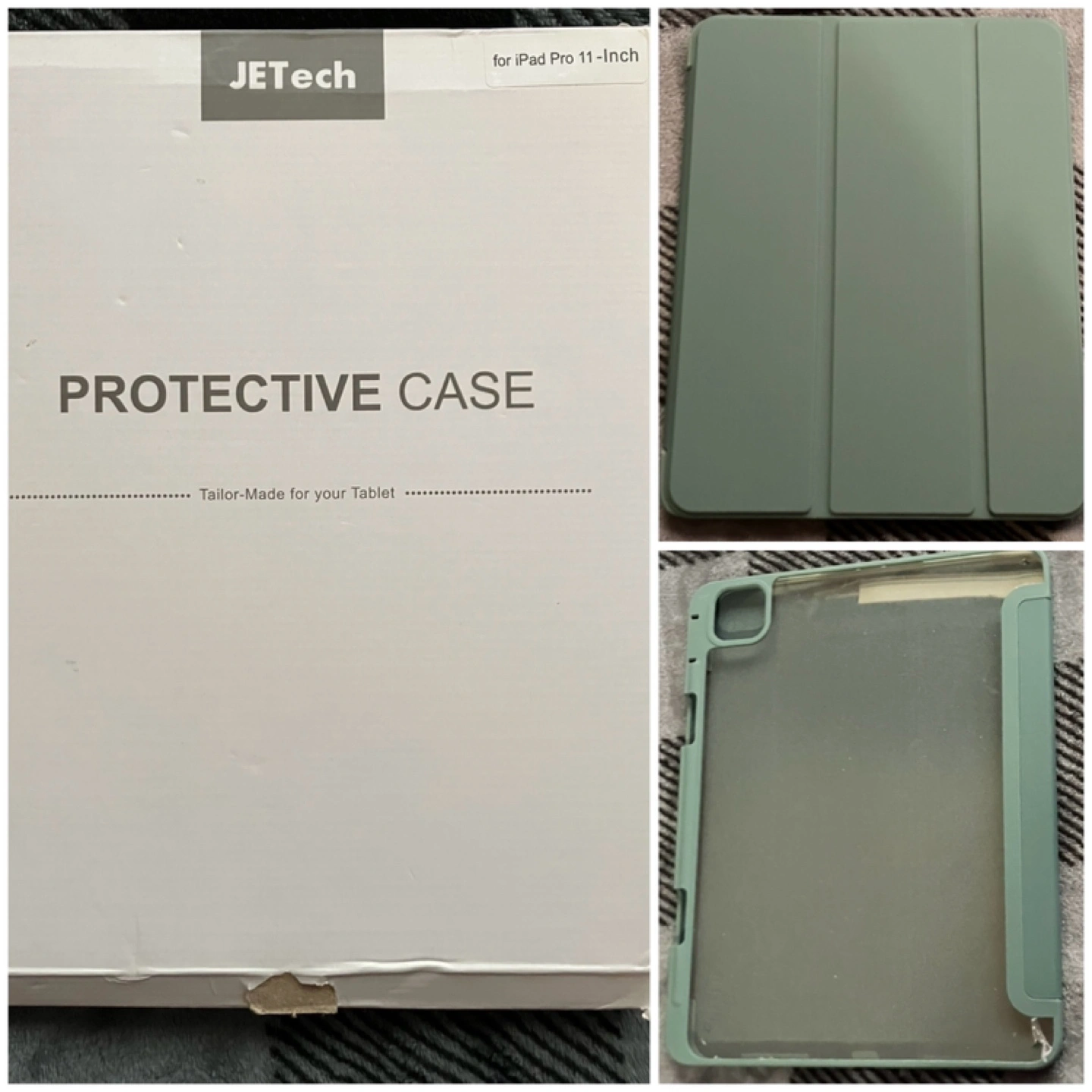 Hello, I am selling a brand new Protective Case for the 11-inch iPad Pro by JETech, featuring a stylish sage green finish. This case includes a tri-fold cover that allows for multiple viewing angles, making it perfect for watching videos or typing. Additionally, it has a convenient compartment designed to securely hold your Pencil. Please note that this item is available for pick-up only, and the location is in Scarborough. Thank you for your interest!