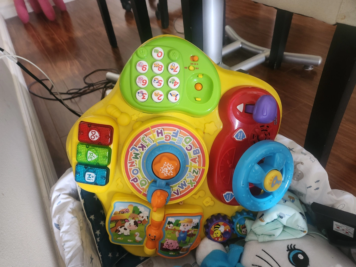 Interactive learning toy. Features lights, sounds, and activities. Includes a steering wheel, number pad, and alphabet ring. Suitable for toddlers.