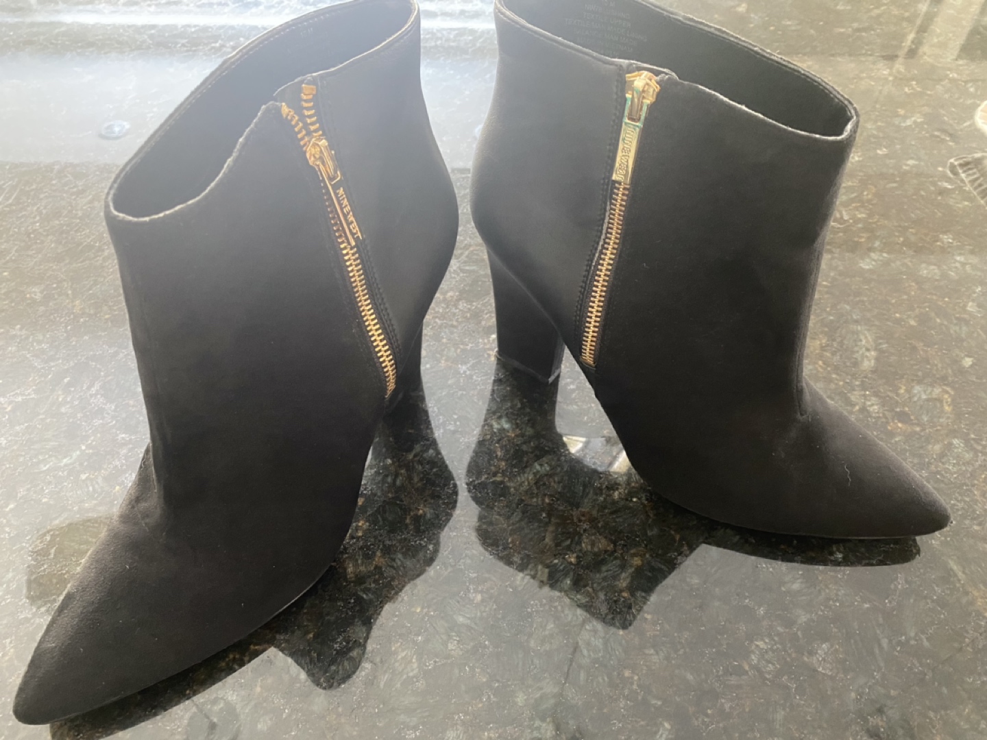 Brand new, never worn, NineWest boots size 10M, black with gold-like zipper on the side. Material all men-made, so look-alike leather and suede. Very stylish!