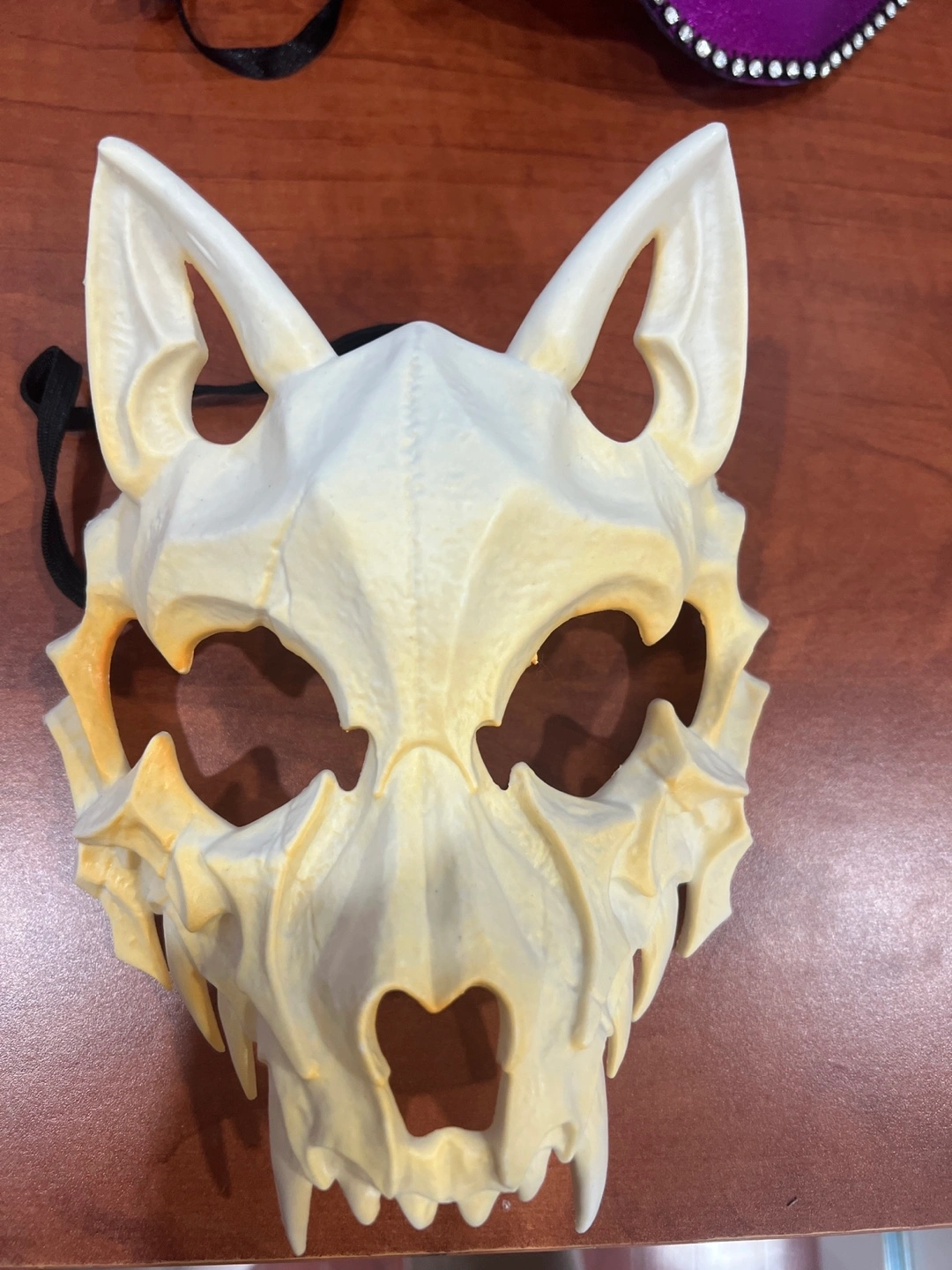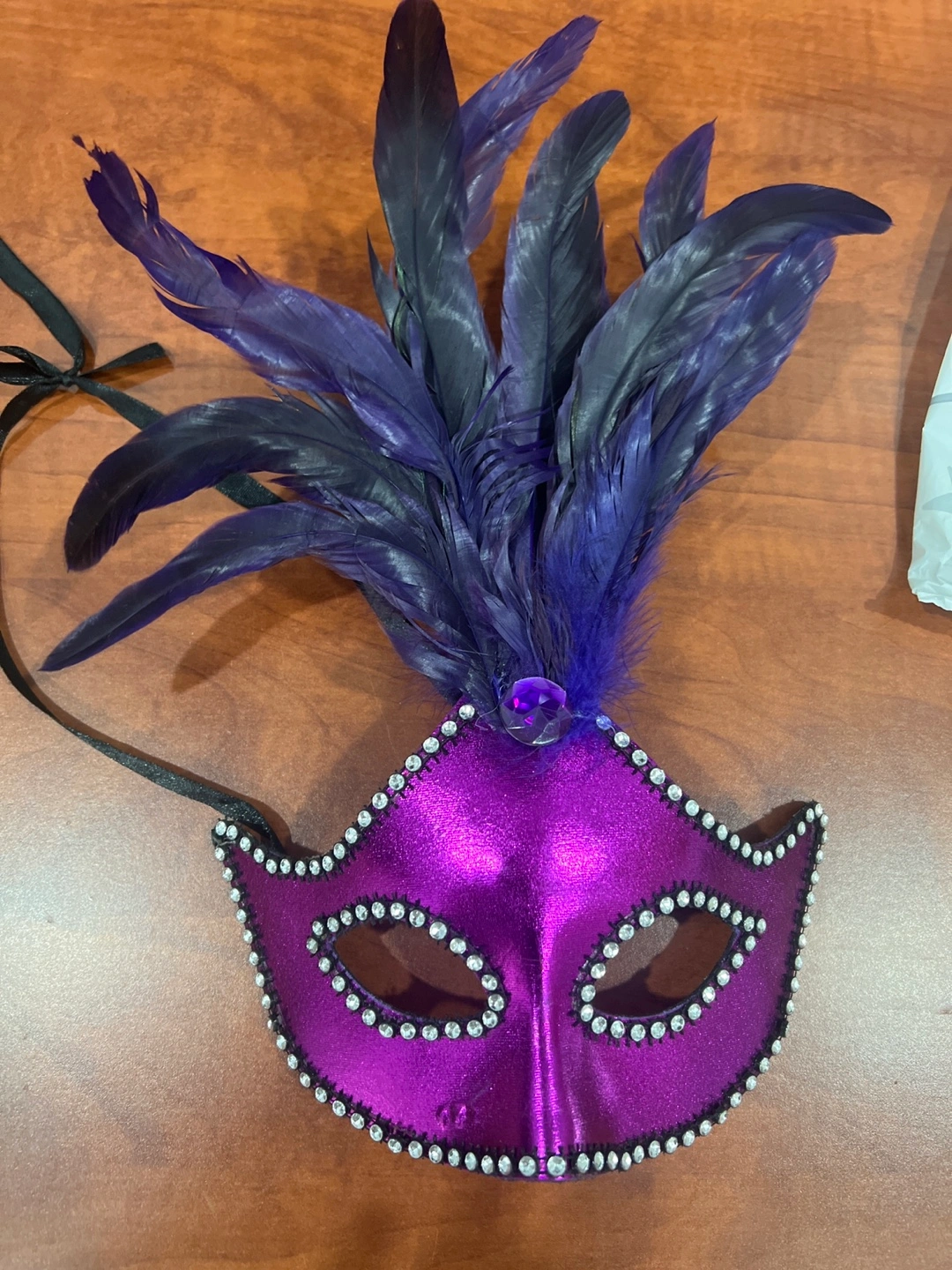Lot of three Halloween costume accessories. Includes a purple masquerade mask with feathers and rhinestones, a wolf mask, and a plastic toy axe. Great for parties or trick-or-treating. Sold as a bundle.
