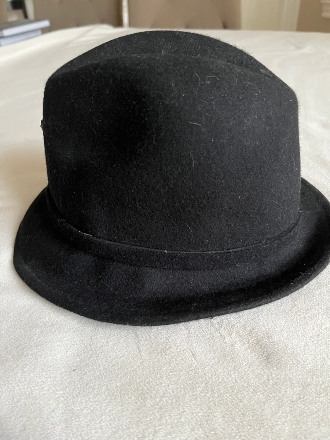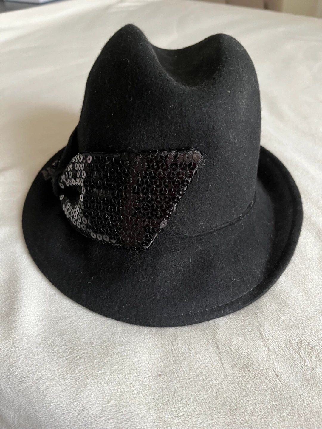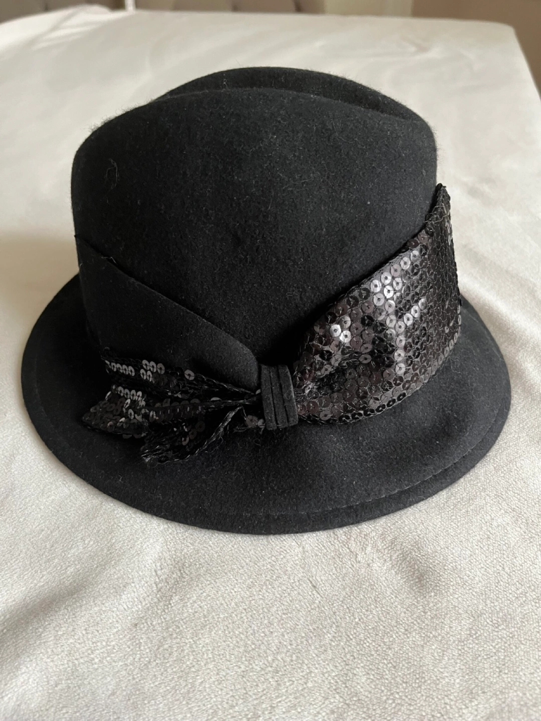 Stylish black felt fedora. Features a sequined bow detail. Perfect for adding a touch of glamour to any outfit. Cash only Bathurst And Steeles Pick up