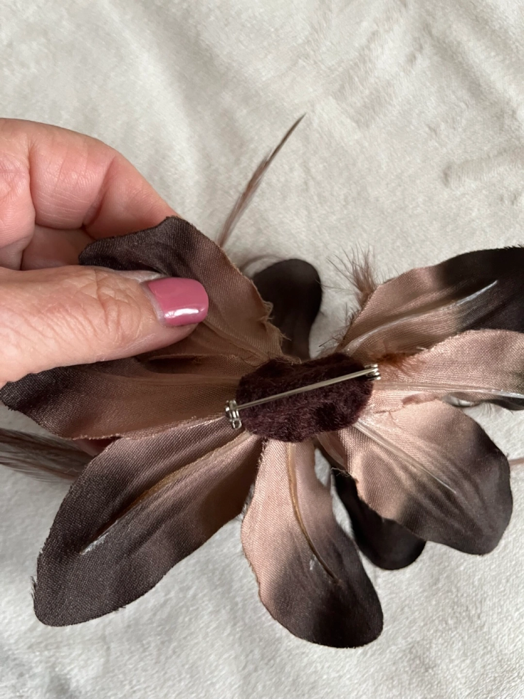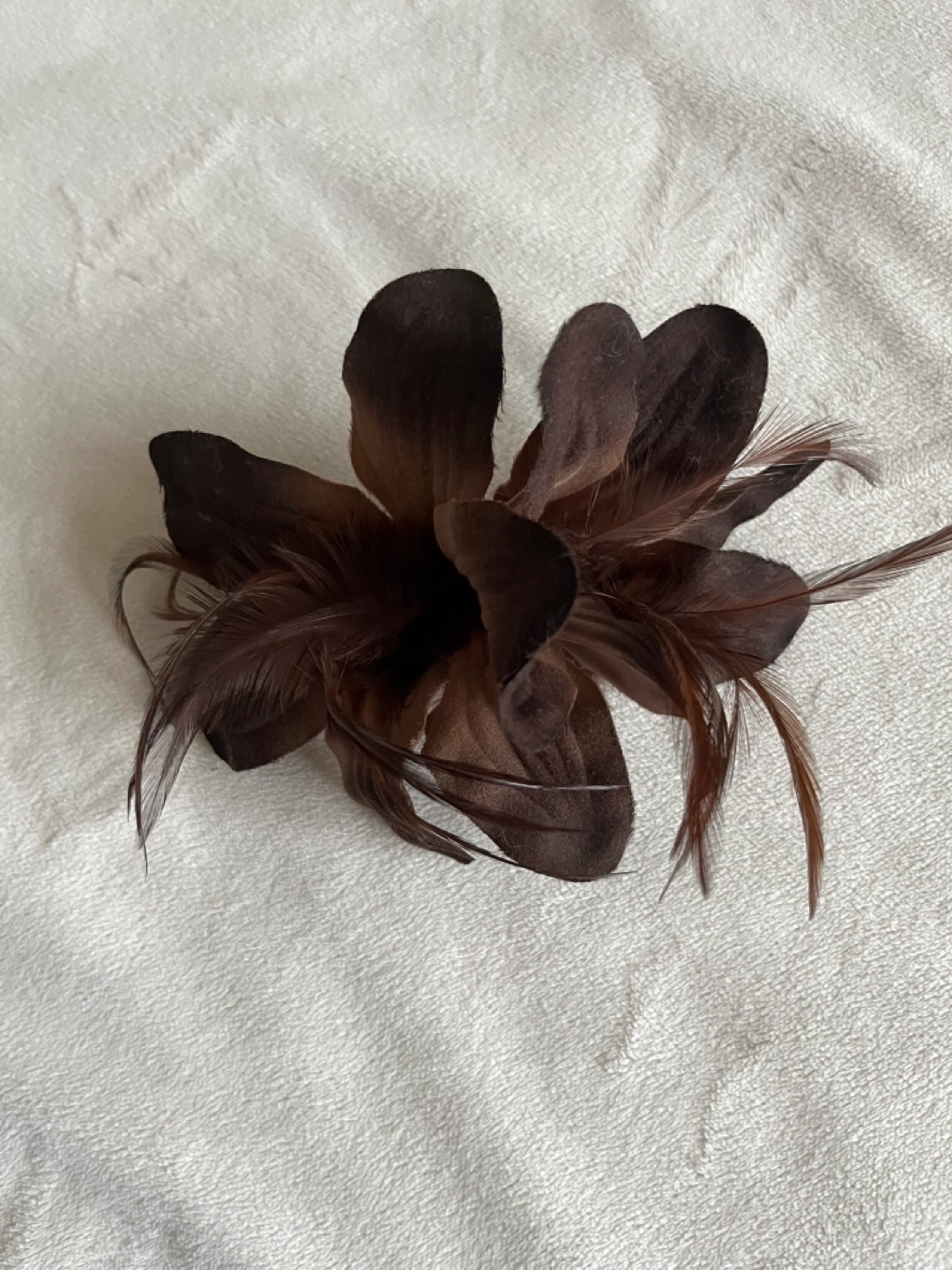 Beautiful brown feather flower brooch. Perfect for adding a touch of elegance to any outfit. Features a pin fastening. Cash only Bathurst And Steeles Pick up