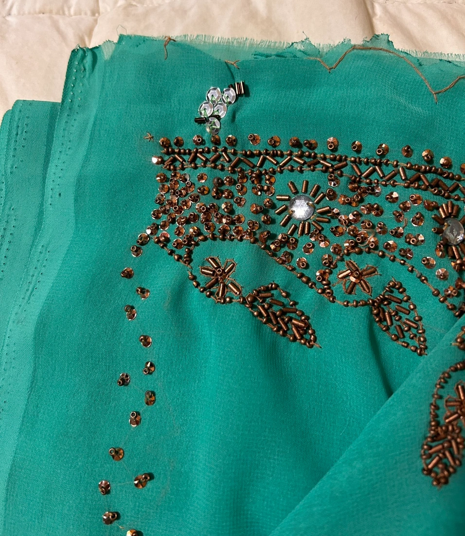 🏀 Beautiful Green Indian Saree $20 Has blouse piece Yayyy In very good condition Has beautiful contrast of rusty colour beading Polyester chiffon fabric Simple not too busy design on Saree except for the dupatta has Most bling Has a couple of tear but it’s fixable- I have hemmed extra sequins in the place. Please see last pic. Ty Letting go for very good price Pickup near wonderland