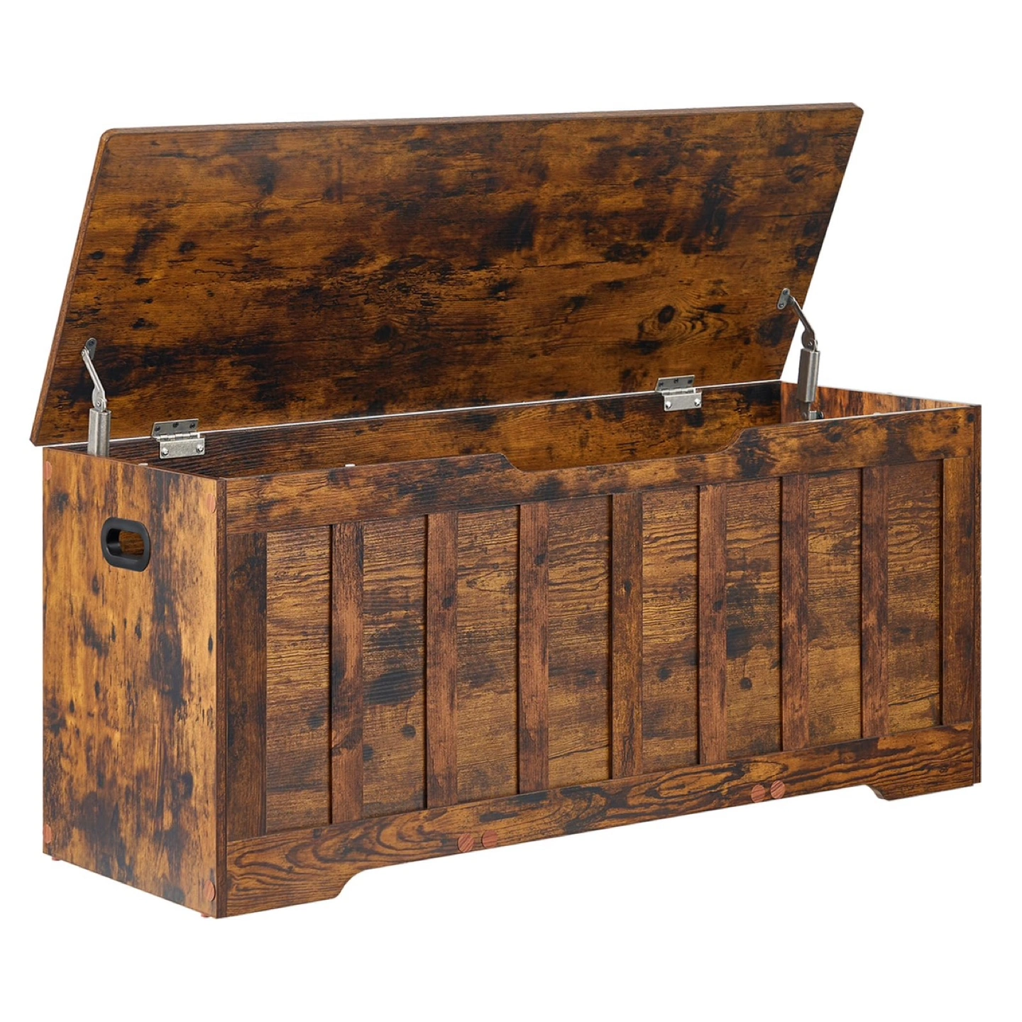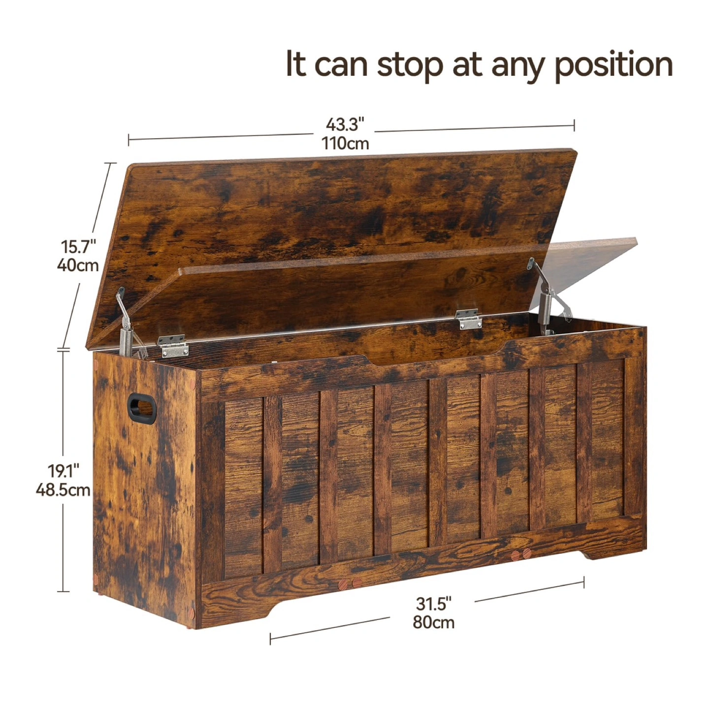 Product Dimensions 15.7"D x 43.3"W x 19.1"H Material Engineered Wood Frame Material Wood Color Rustic Brown Style Vintage Size 43.3x15.7x19.1 【Extra Large Storage Space】- Size of the storage chest is 43.3"L(110cm)x 15.7"W(40cm)x19.1"H(48.5cm).This large storage box boasts an enormous interior, effortlessly accommodating a wide range of items, from clothes to blankets to books, catering to your diverse storage needs. 【2 Safety Hinges】- This entryway storage bench is different from other ordinary storage trunks, it has longer use time because it is equipped with 2 advanced safety hinges that can stop at any position, allowing you to open and close it slowly without closing suddenly and pinching your fingers. 【Rounded Top Corners, Safe and Secure】-The specially crafted rounded top corners not only present a sleek and streamlined aesthetic, but also prioritize safety during use. They eliminate the potential harm posed by pointed edges, offering a worry-free storage solution for your home. 【Multifunctional Storage Chest】- This blanket storage fits anywhere in your room. Use it as a shoe bench in the hallway, a storage bench/coffee table in the living room, or a bedside bench in the bedroom end of bed. Not only practical but will also be an ornament that increase a warm farmhouse vibe to your home. 【Easy assembly】-With simple and clear instructions and part numbers, it's easy to assemble this entryway storage trunk.Whether you're a DIY enthusiast or prefer a team effort, you'll have it up and running in no time, ready to streamline your storage needs.