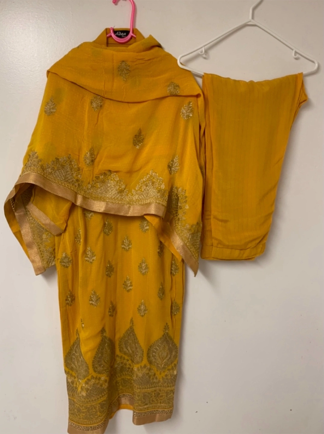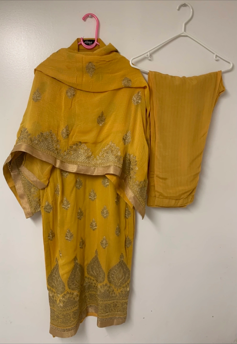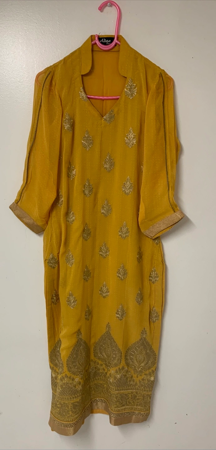 Bright yellow kurta set. The kurta features gold embroidery. Includes matching pants and a scarf. Wear this outfit to unwind and feel comfortable.