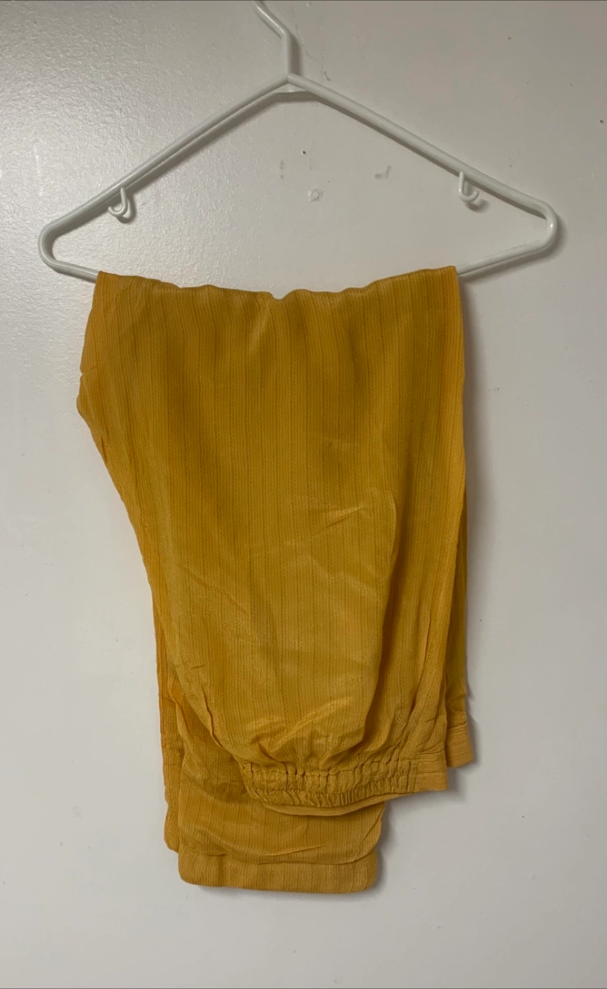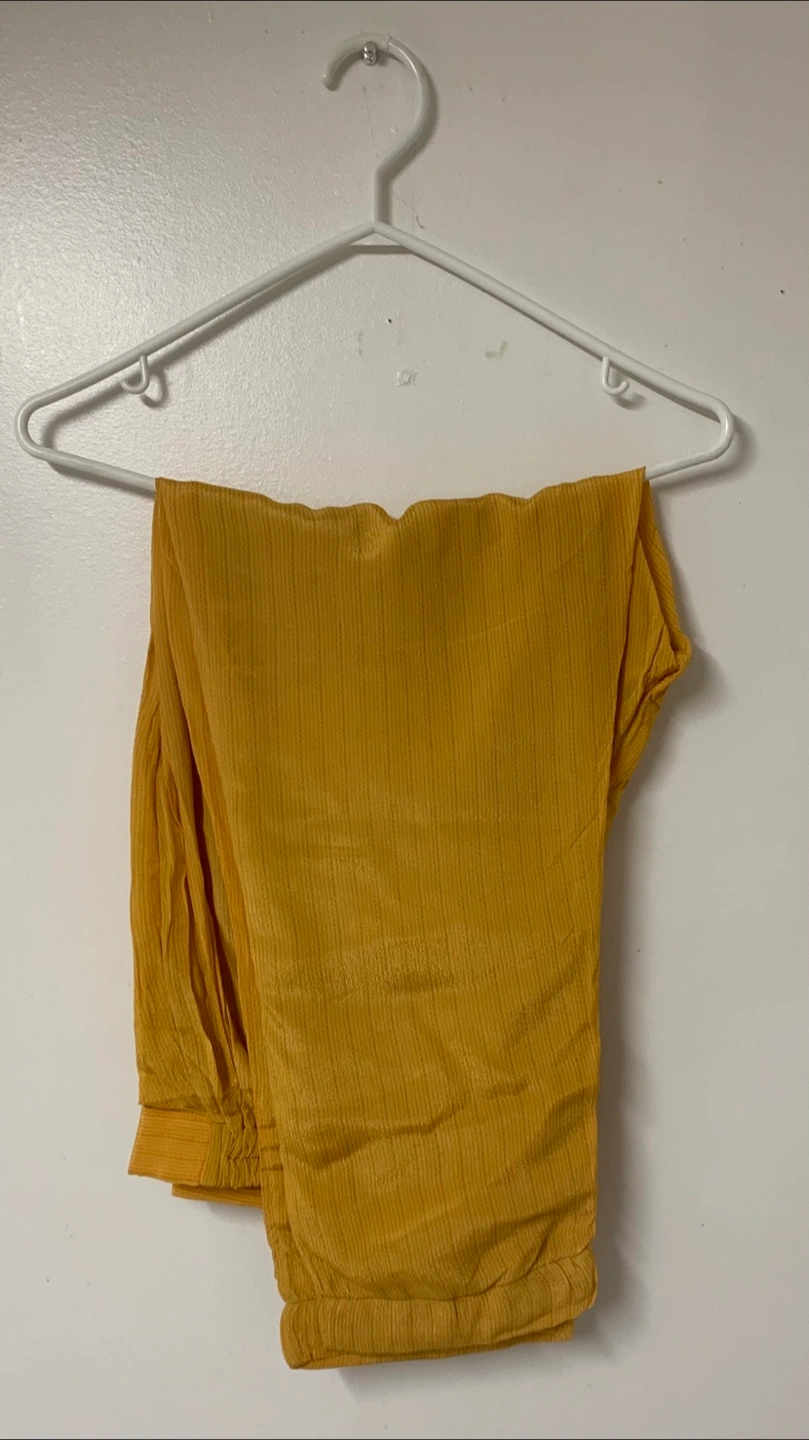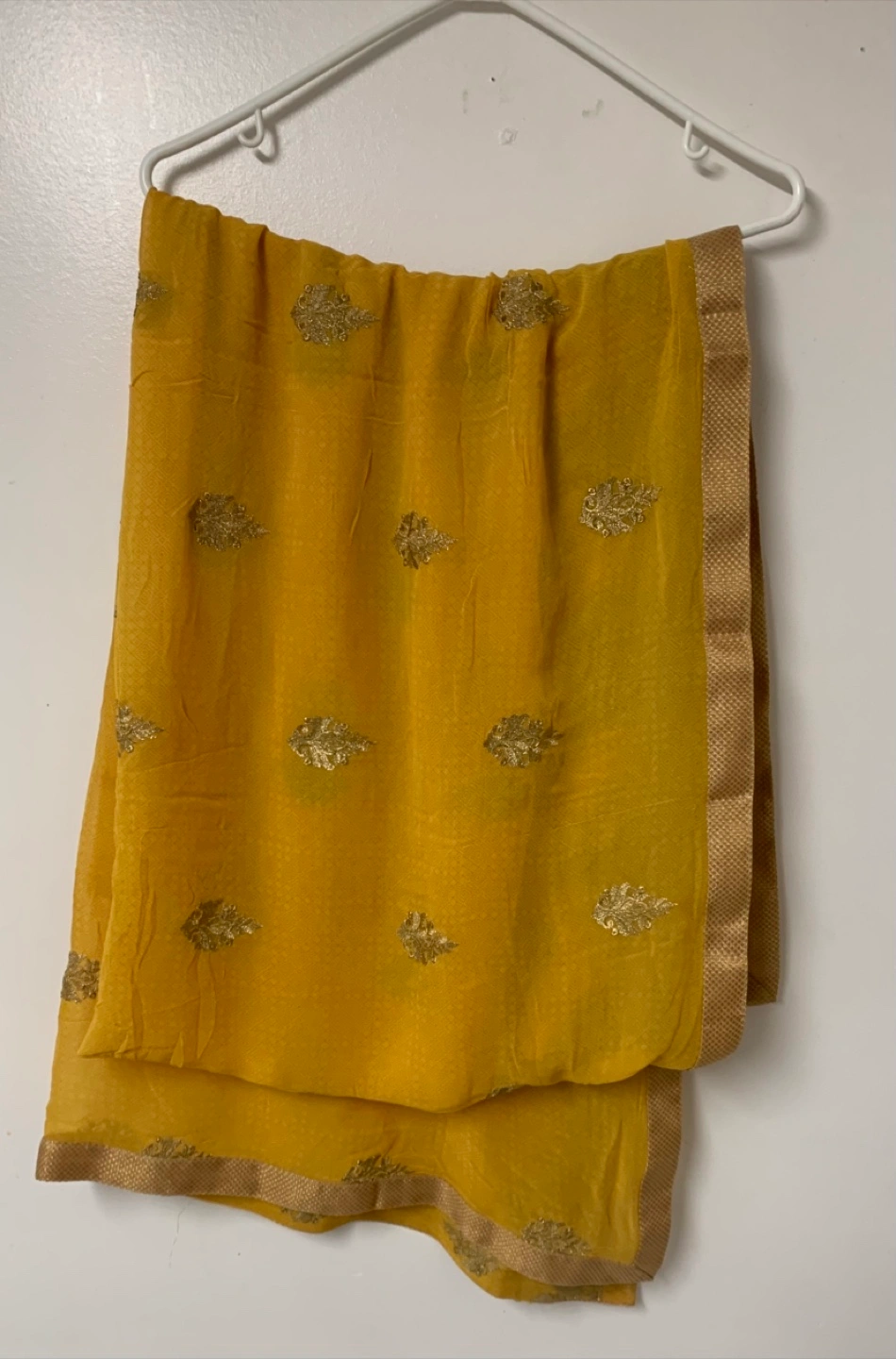 Bright yellow kurta set. The kurta features gold embroidery. Includes matching pants and a scarf. Wear this outfit to unwind and feel comfortable.