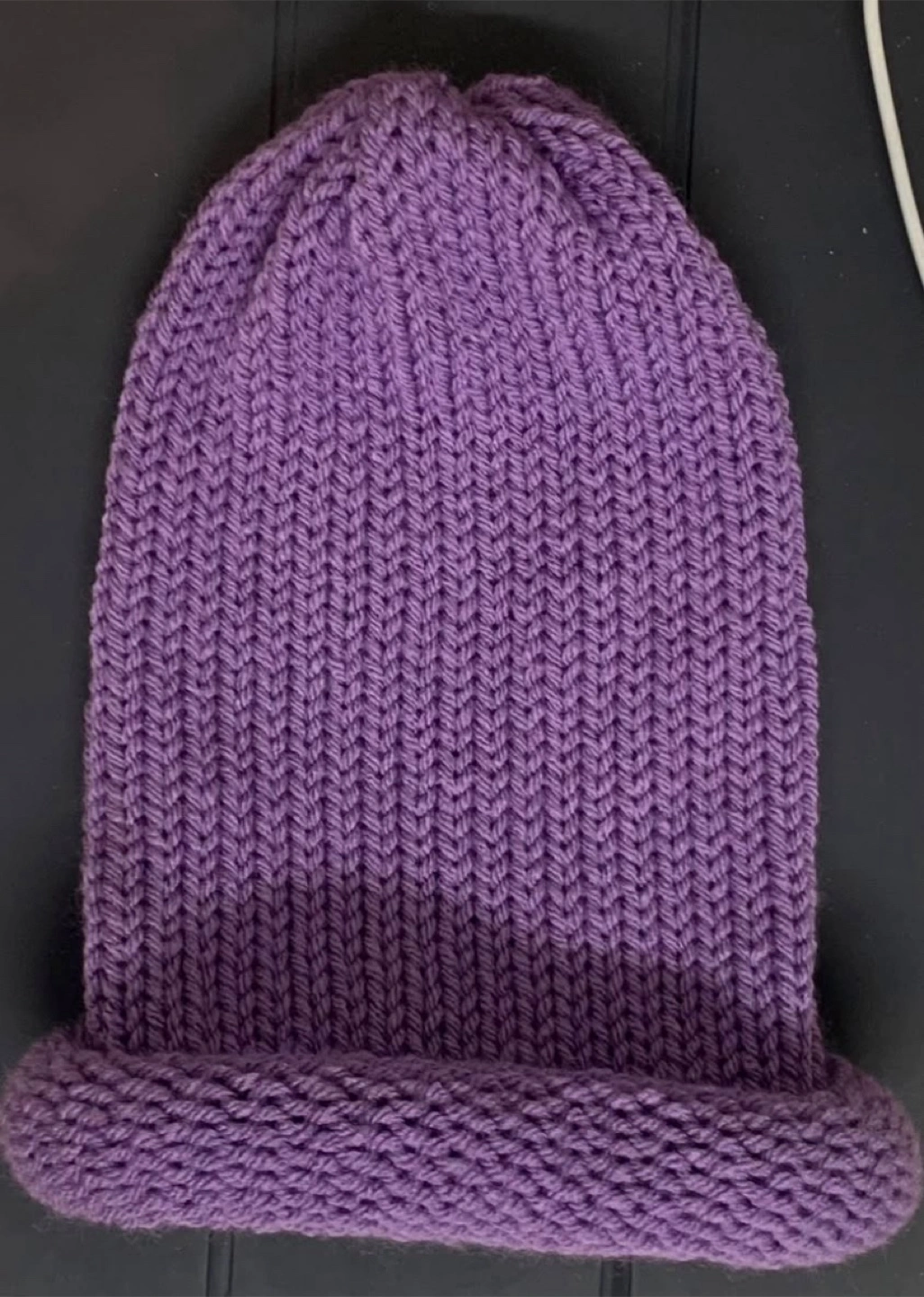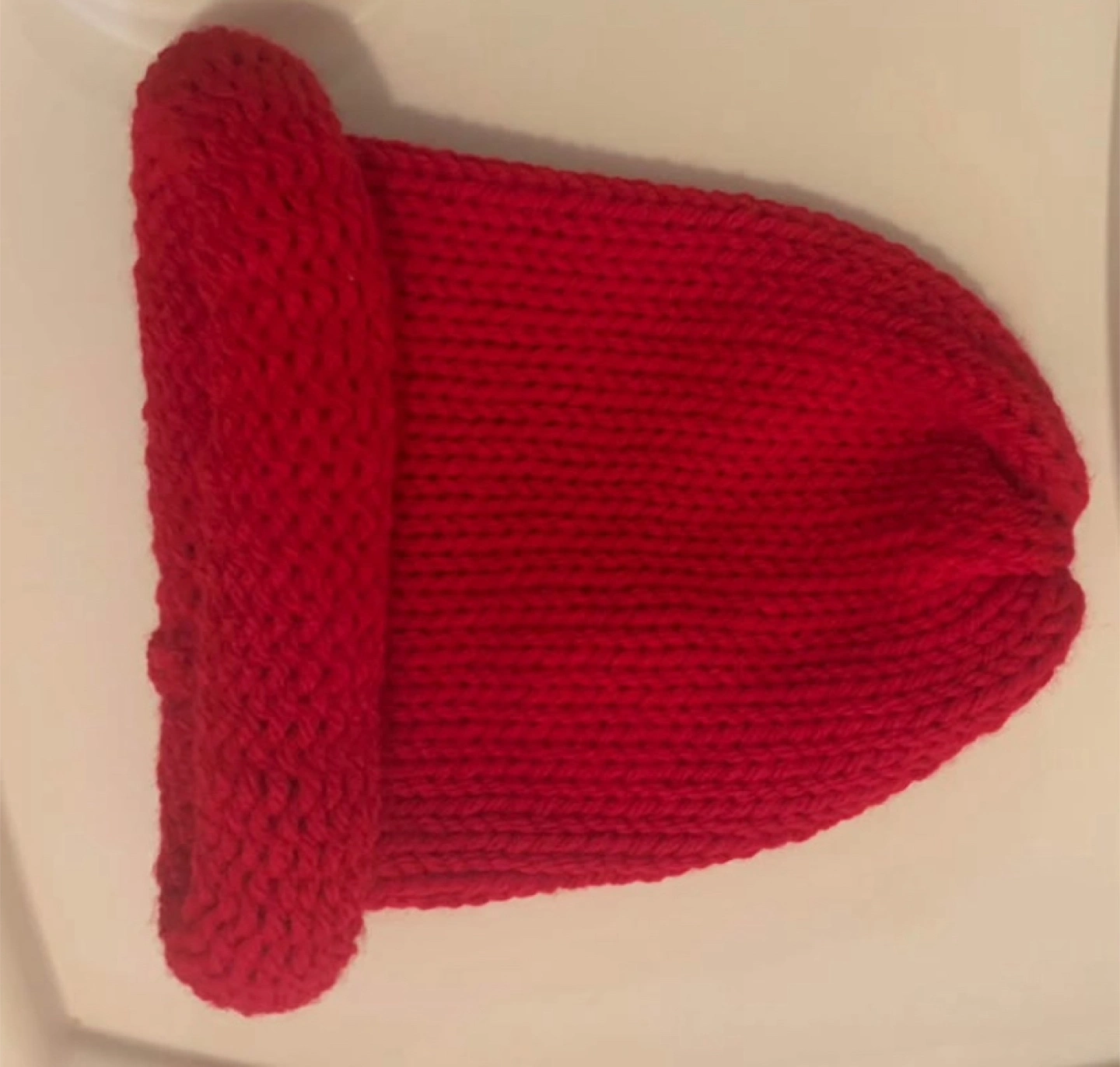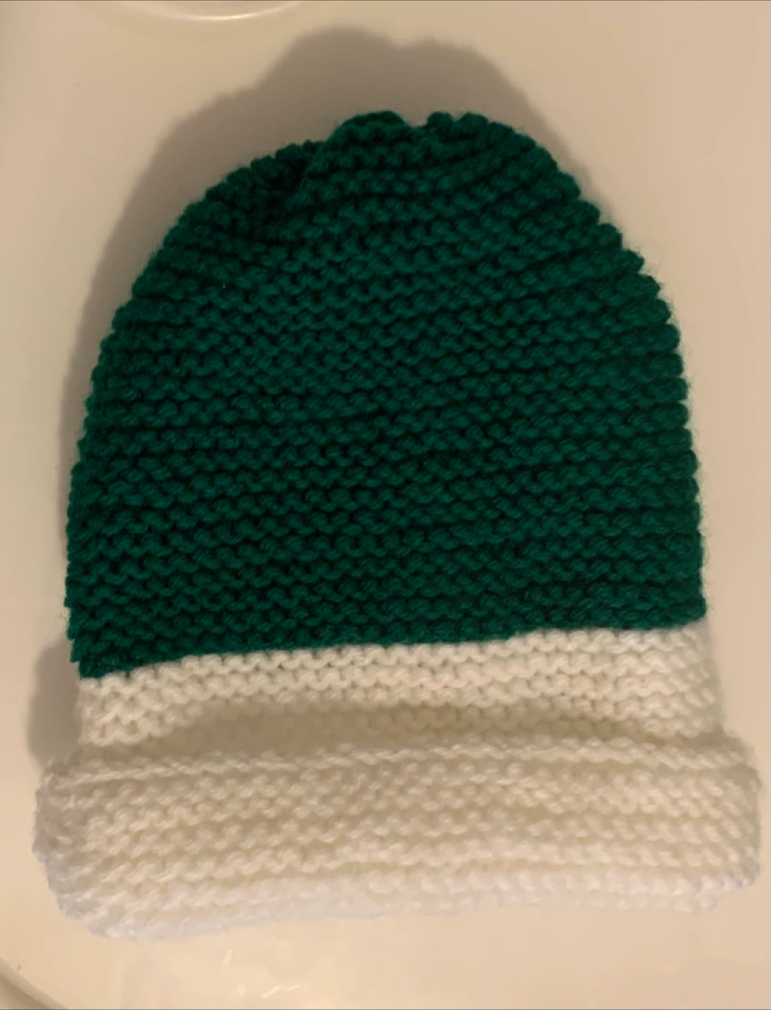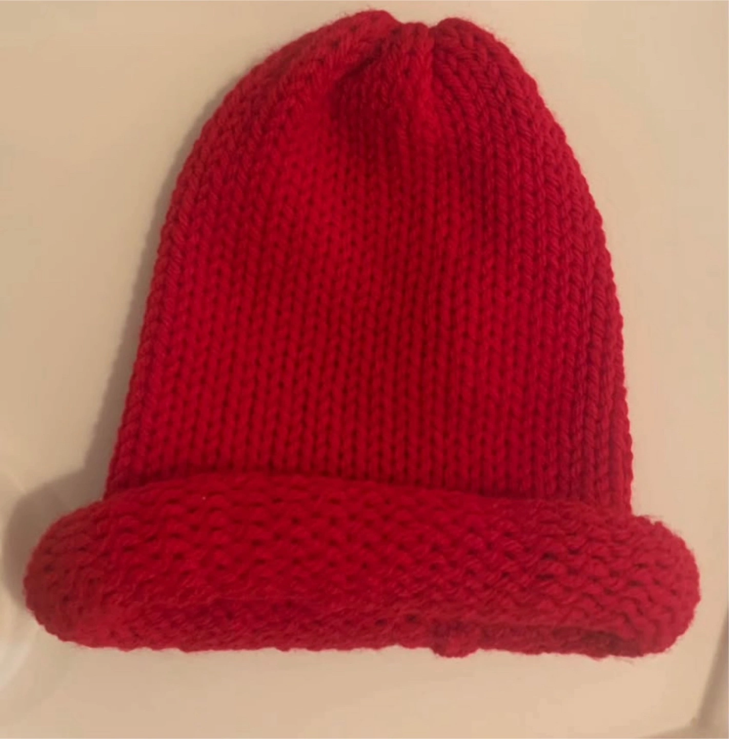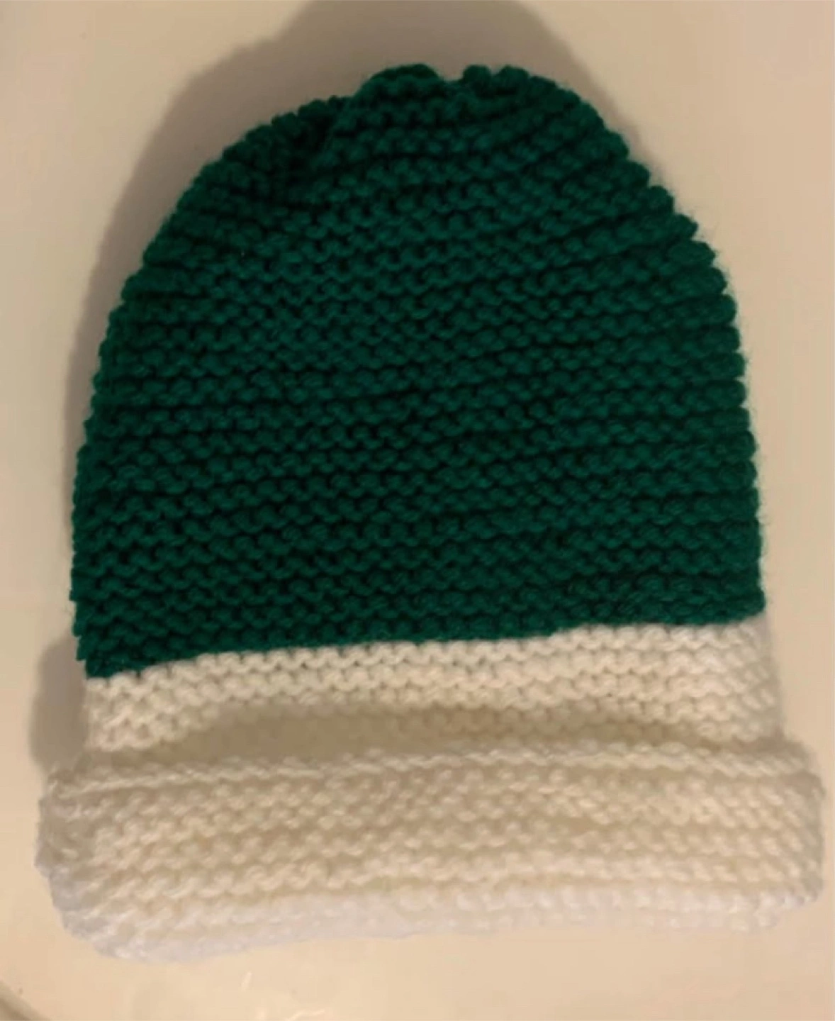 A few different coloured beanies are shown. The green and white one has a ribbed band. Another beanie is red, and the last one shown has a fold up brim, that would be perfect for a brisk fall stroll.