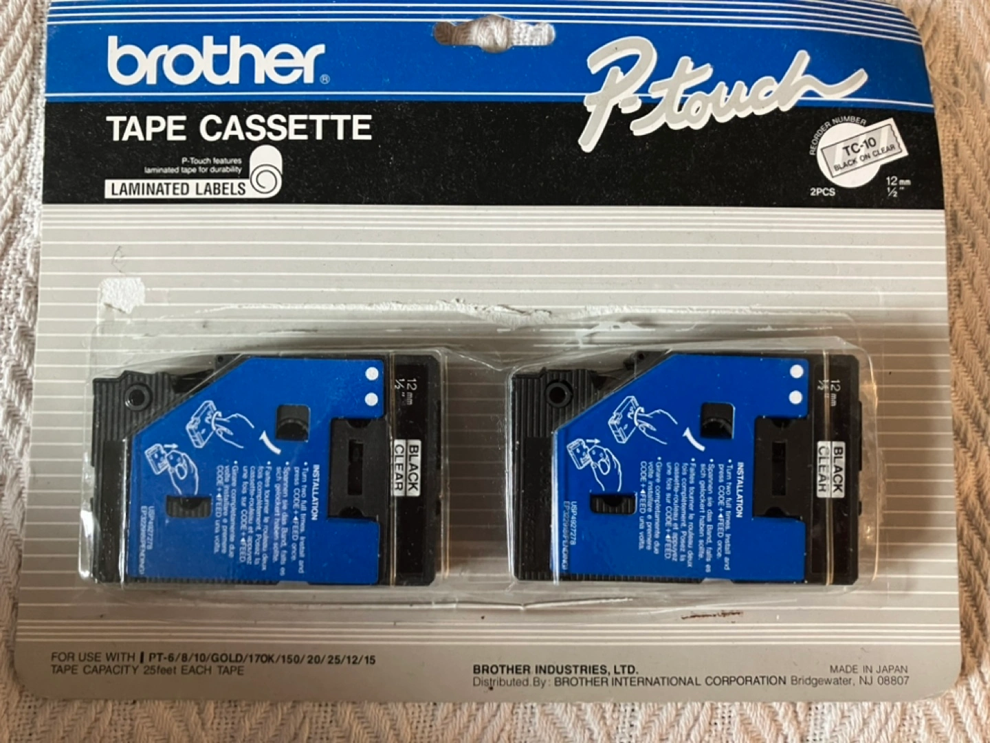 Brother P-touch TC-10 black on clear tape cassette for label makers PT-6/8/10/GOLD/170K/150/20/25/12/15 (possibly others), nine cassettes total. First come, first serve, pick up only. I do not know how old these are or what machines they are compatible with beyond the packaging you can see in the photo.