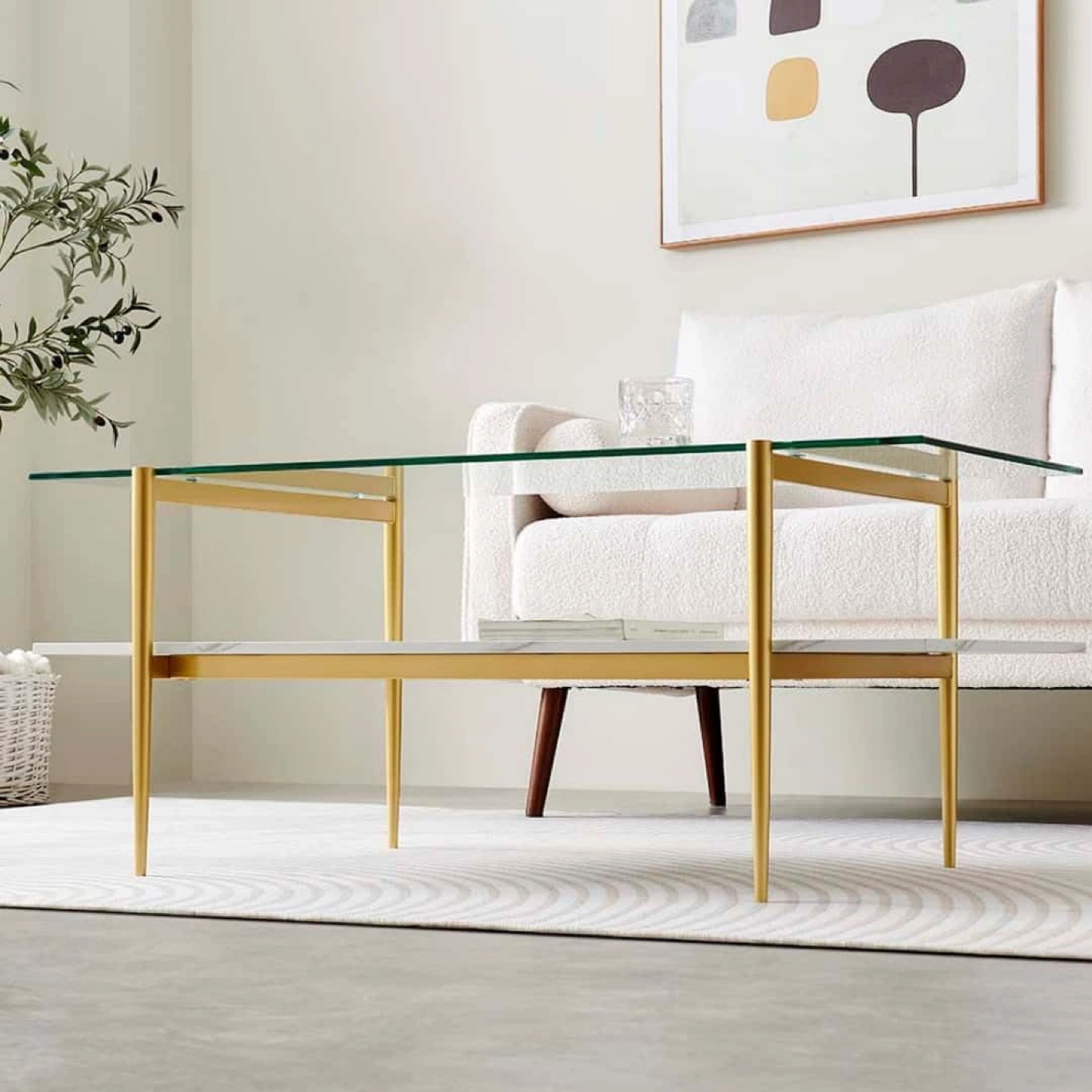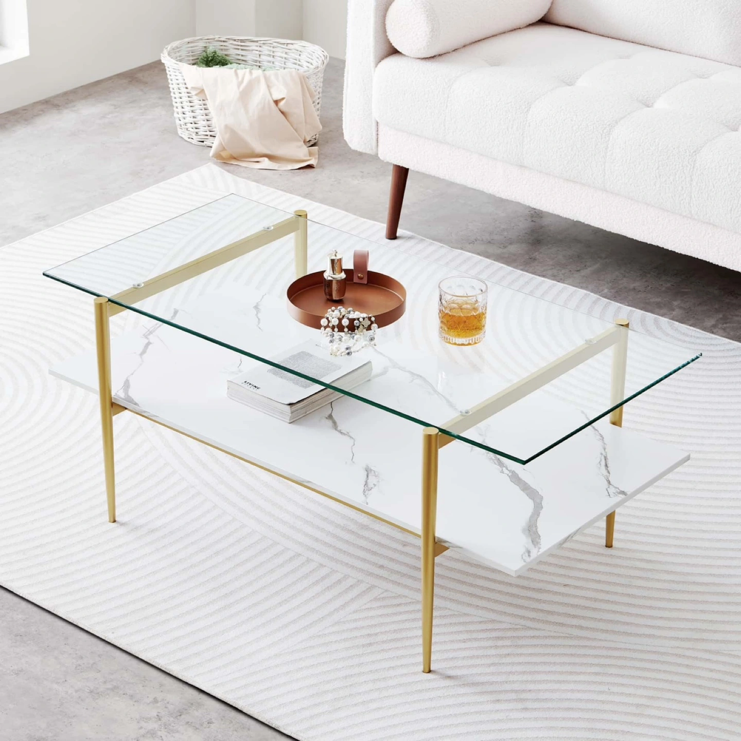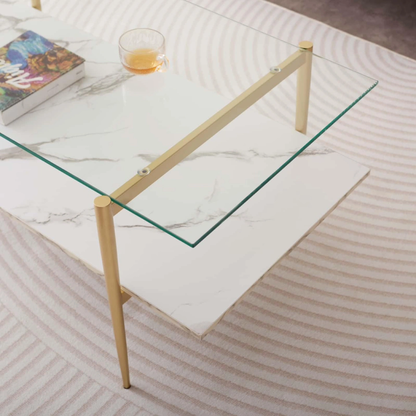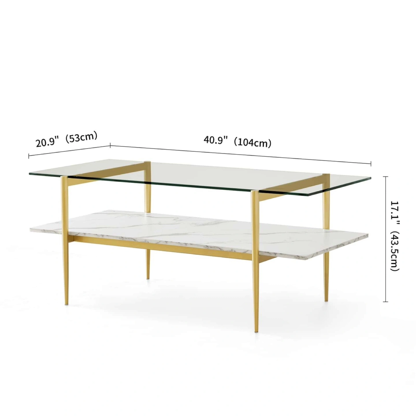 Brand LumFurn Product Dimensions 104D x 53W x 44H Centimetres Item weight 19 Kilograms Maximum weight recommendation 40 Pounds Frame material 合金钢 Colour Clear & White Marble 【Mid-Century Modern Design】This mid-century modern coffee table boasts a rectangle silhouette, featuring conical legs and smooth, elegant lines. Its clear glass top and white marbling MDF top offer a stylish contrast, while the solid construction ensures durability. The beautiful design adds a sense of harmony and balance to the space, embodying the owner's refined taste and appreciation for timeless elegance. 【Elevate your Living Room】With this stunning modern elegance coffee table. Featuring a spacious rectangle top, it offers ample surface area for displaying your favorite decorations, serving drinks, or keeping daily essentials within reach. Its dual-tier structure not only maximizes storage but also adds visual interest to your living area. 【Sturdy Material & Structure】Experience elegance meets durability with our furniture. Tempered glass top ensures clarity, strength, and ease of cleaning. MDF base offers stability, uniform density, and eco-friendliness. The sleek matte alloy legs offer sturdy support, ensuring stability even when fully loaded. Together, they create a stunning, long-lasting coffee table that's perfect for everyday use. 【Assembly is a Breeze】Taking only 15-30 minutes with the included clear instructions. Maintenance is equally effortless; simply wipe down the surface with a soft dry cloth to keep it looking its best.