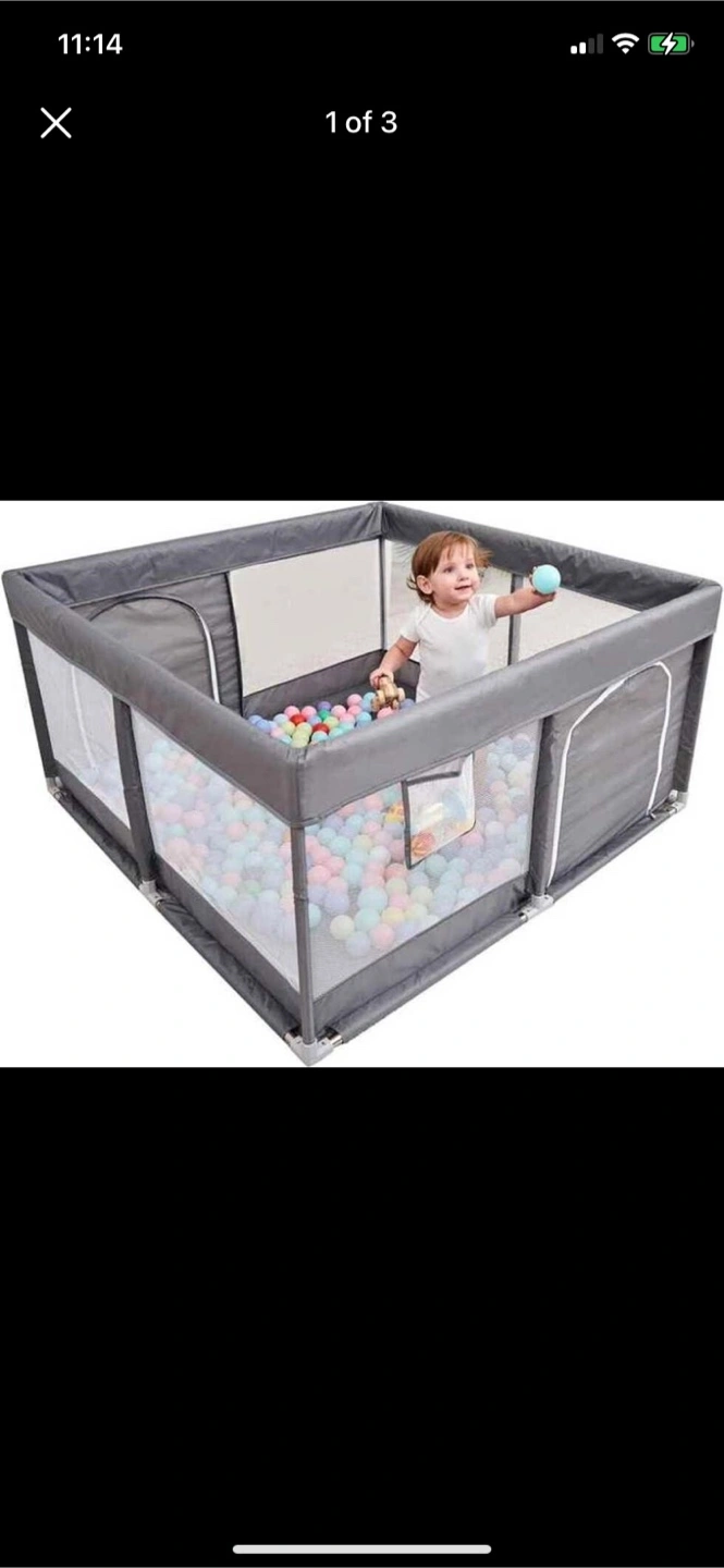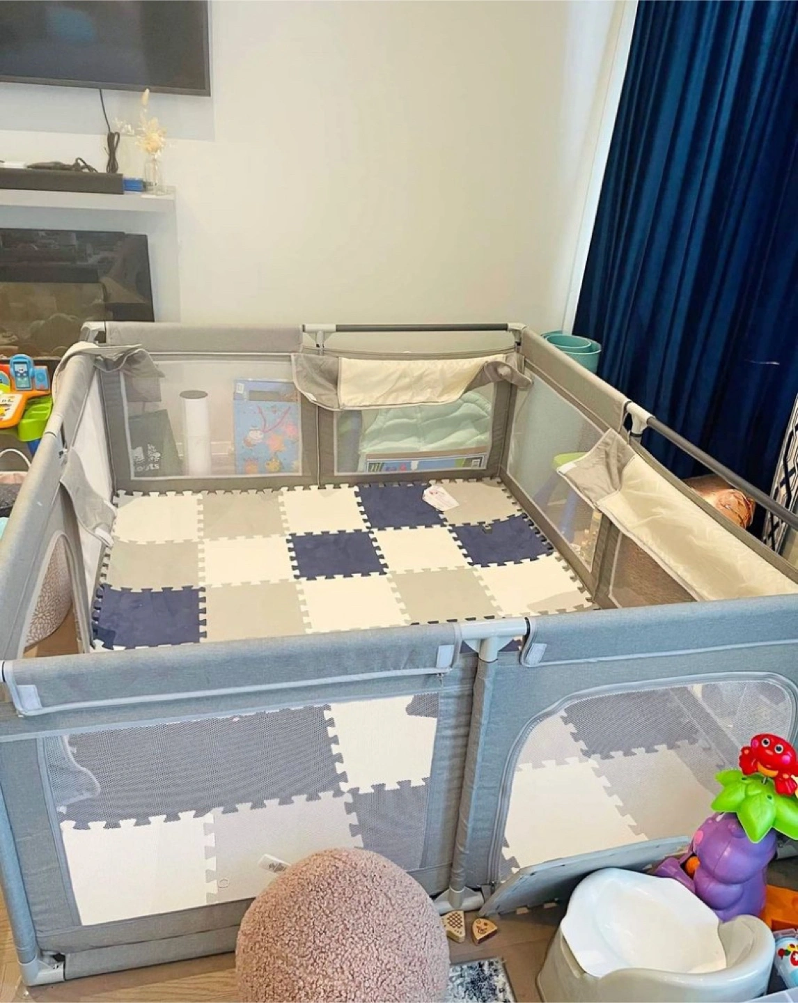 Baby playpen with a soft mesh design. Features a square shape with a door. Provides a safe space for the child to play. You can set up this playpen to create a peaceful play area for your baby.