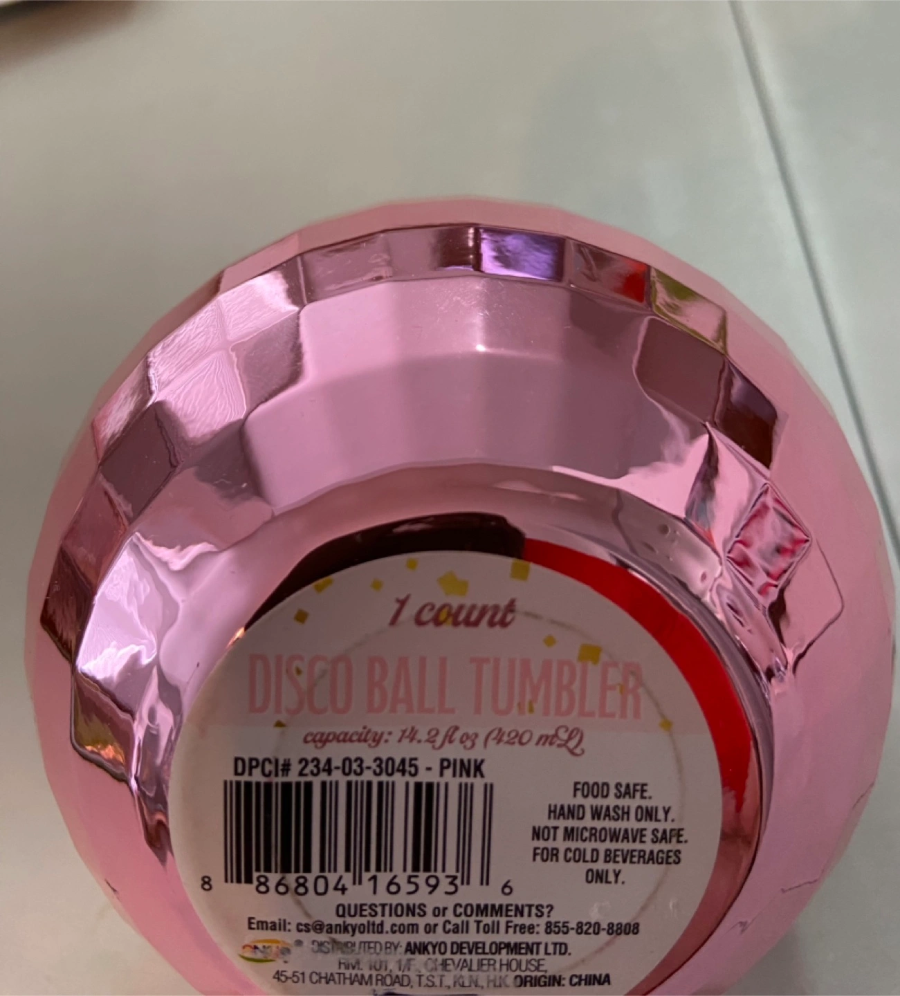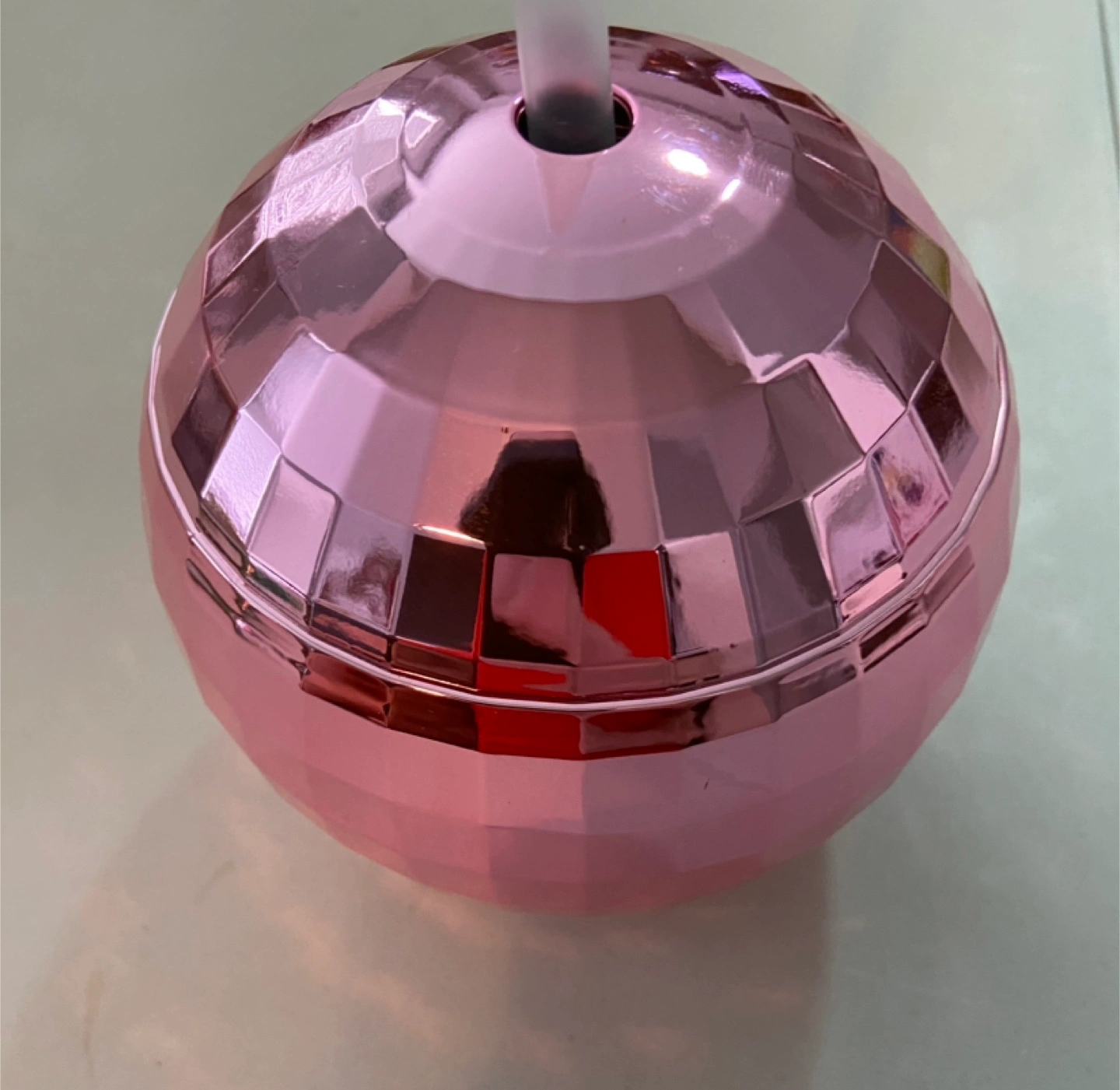 Pink disco ball tumbler. Appears to be made of plastic. A calming way to enjoy a cold beverage on a hot day.