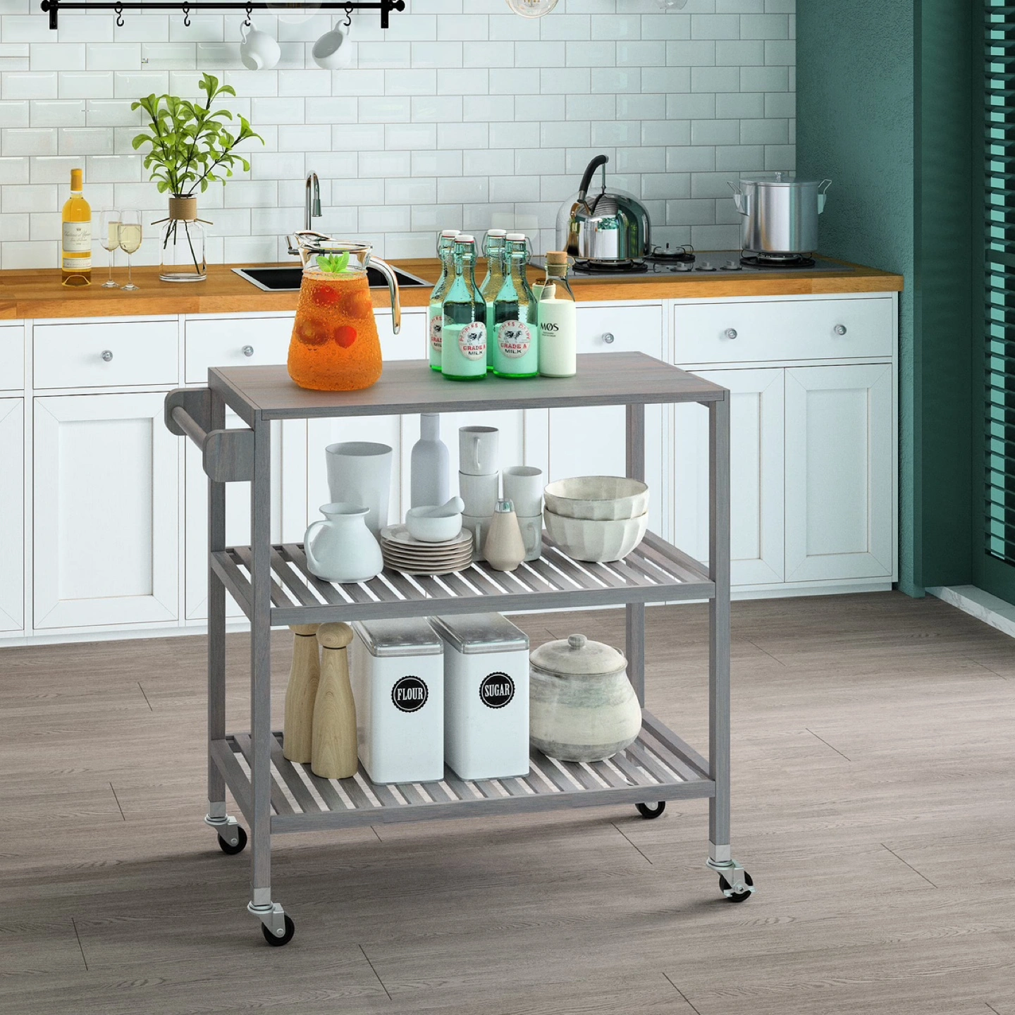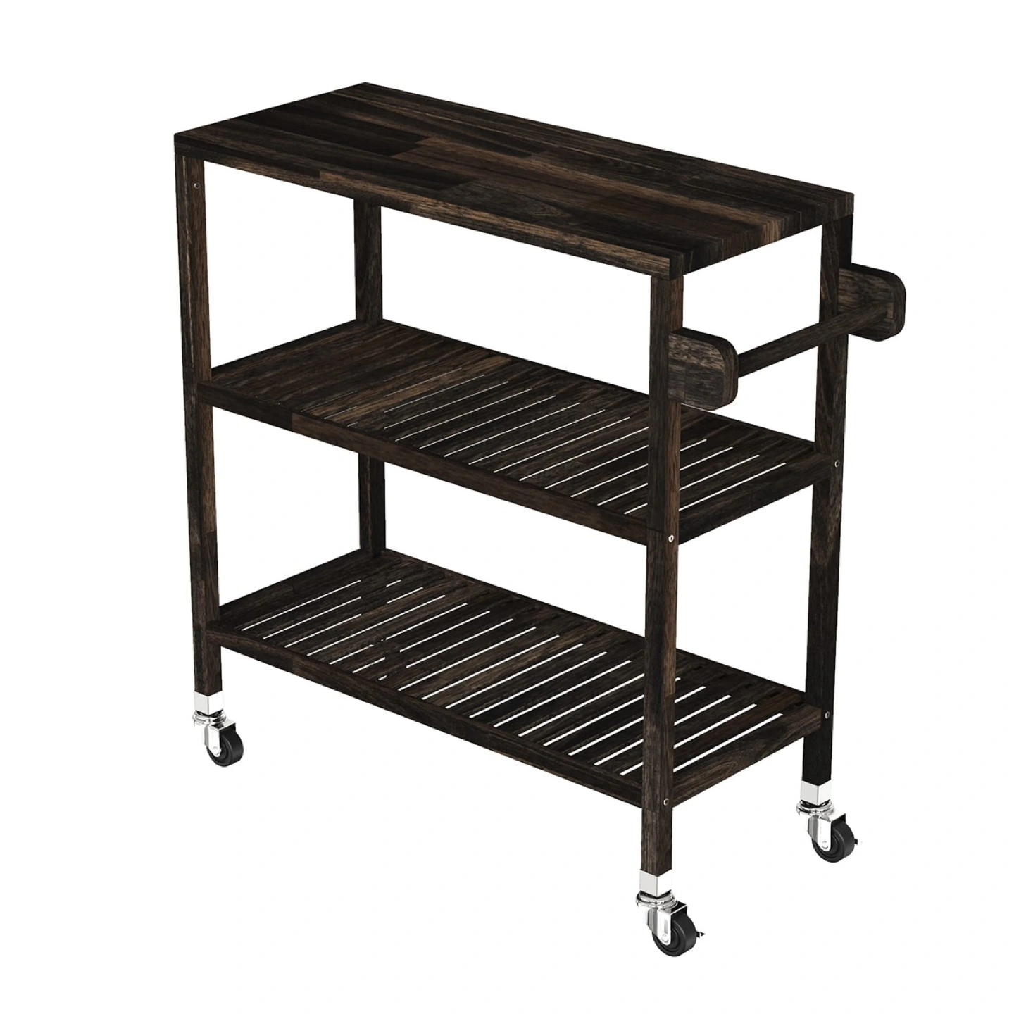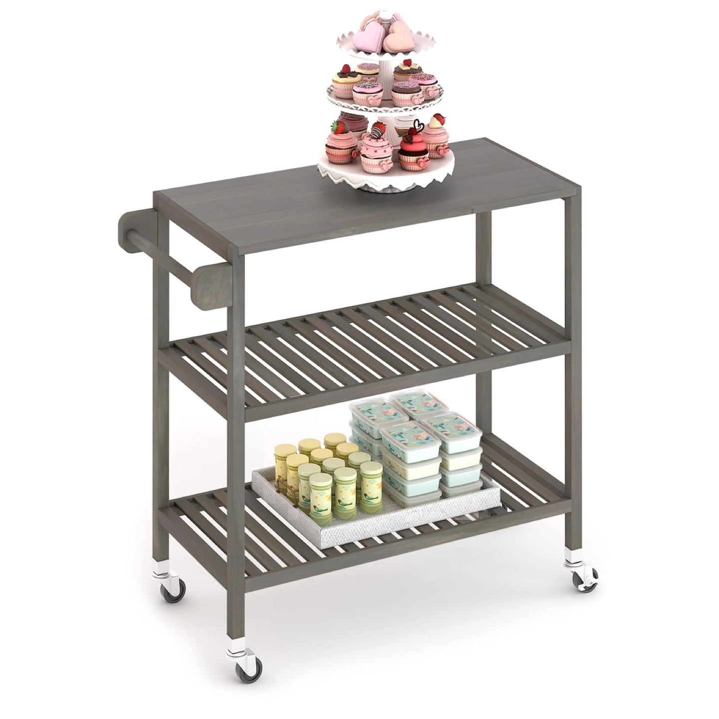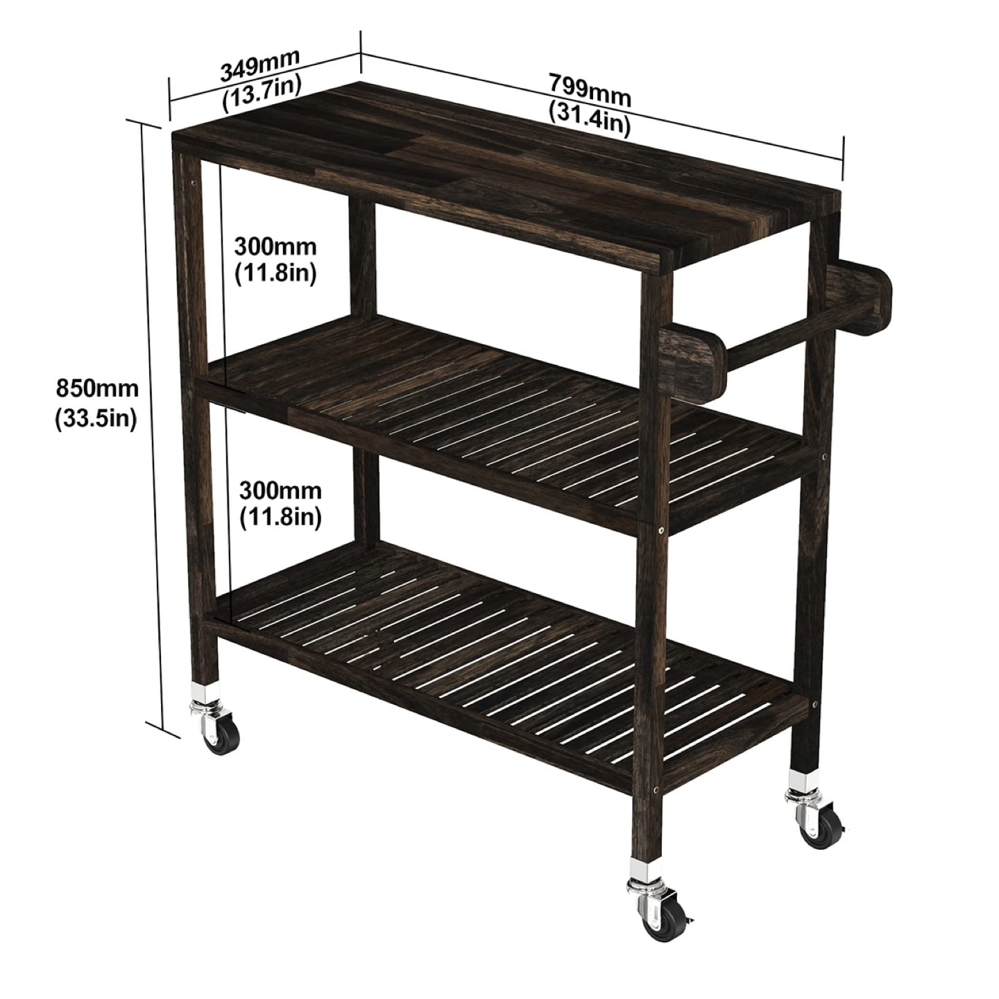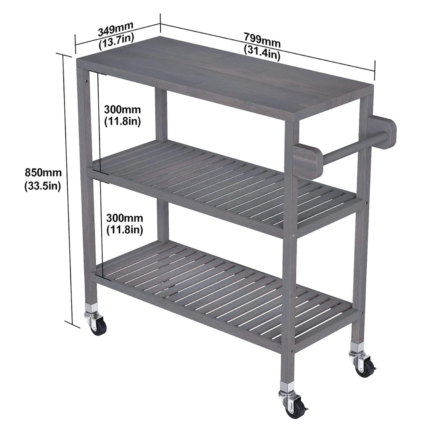 Product Dimensions 31.5"D x 13.7"W x 33.5"H Shelf Type Tiered Shelf Material Wood Frame Material Wood Brand INTERBUILD REAL WOOD Color Dusk Grey Featured: Interbuild trolley is made of sustainably sourced, hand-selected and highest-grade oiled Acacia Wood crafted from Acacia timber grown in FSC certified forest, finished with 4 coats of Interbuild's food safe ZERO % VOC hardwax oil. Flexible Design: Classic 3-tier kitchen cart with ideal size 31.5"L x 13.7" Wx 33.5"H provides large storage space. Moreover, a side rack for towels or aprons and 4 flexible wheels allow the trolley cart to go to where you want. Kitchen Utility Cart: The 31.5"L x 13.7" W countertop gives you extra room to hold a microwave or prepare meals and dine; the two bottom shelves extend the storage space in your kitchen especially the slatted design for better ventilation. Easy Assembly: The storage cart is easy to assemble as all the required accessories are intelligently organized. You could quickly assemble it. Durable & Stable: Made of Acacia Hardwood with oil finished, waterproof and anti-scratch, it ensures stability and durability. Use it as kitchen organizer, dish rack, bar cart, food prep station, or storage cart to make your home and kitchen clean and tidy.