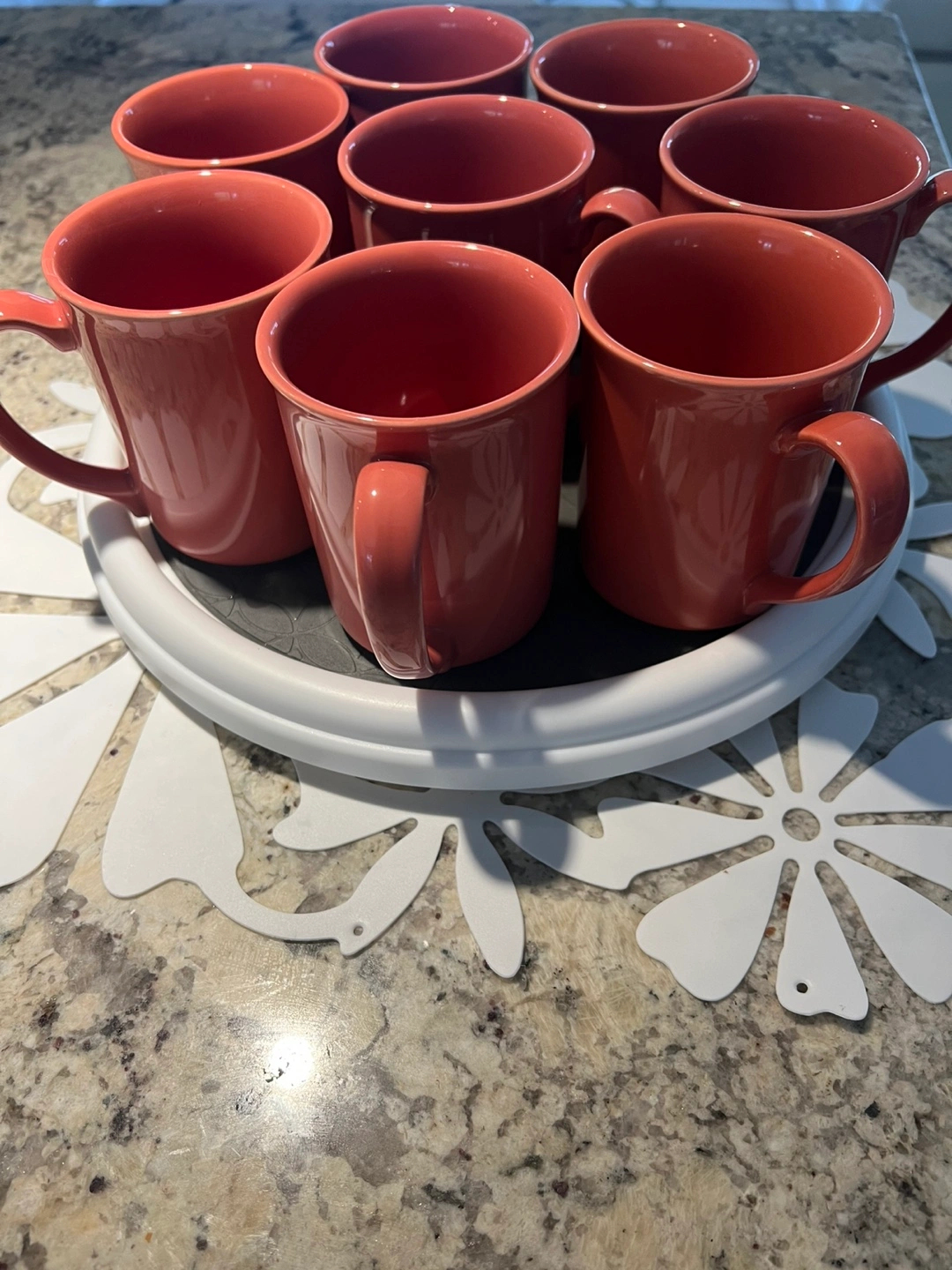 Pink mugs. Each mug with a handle. They appear to be a simple, cylindrical shape. These mugs would be perfect for enjoying a warm beverage on a chilly evening. Microwave safe! Total of 8