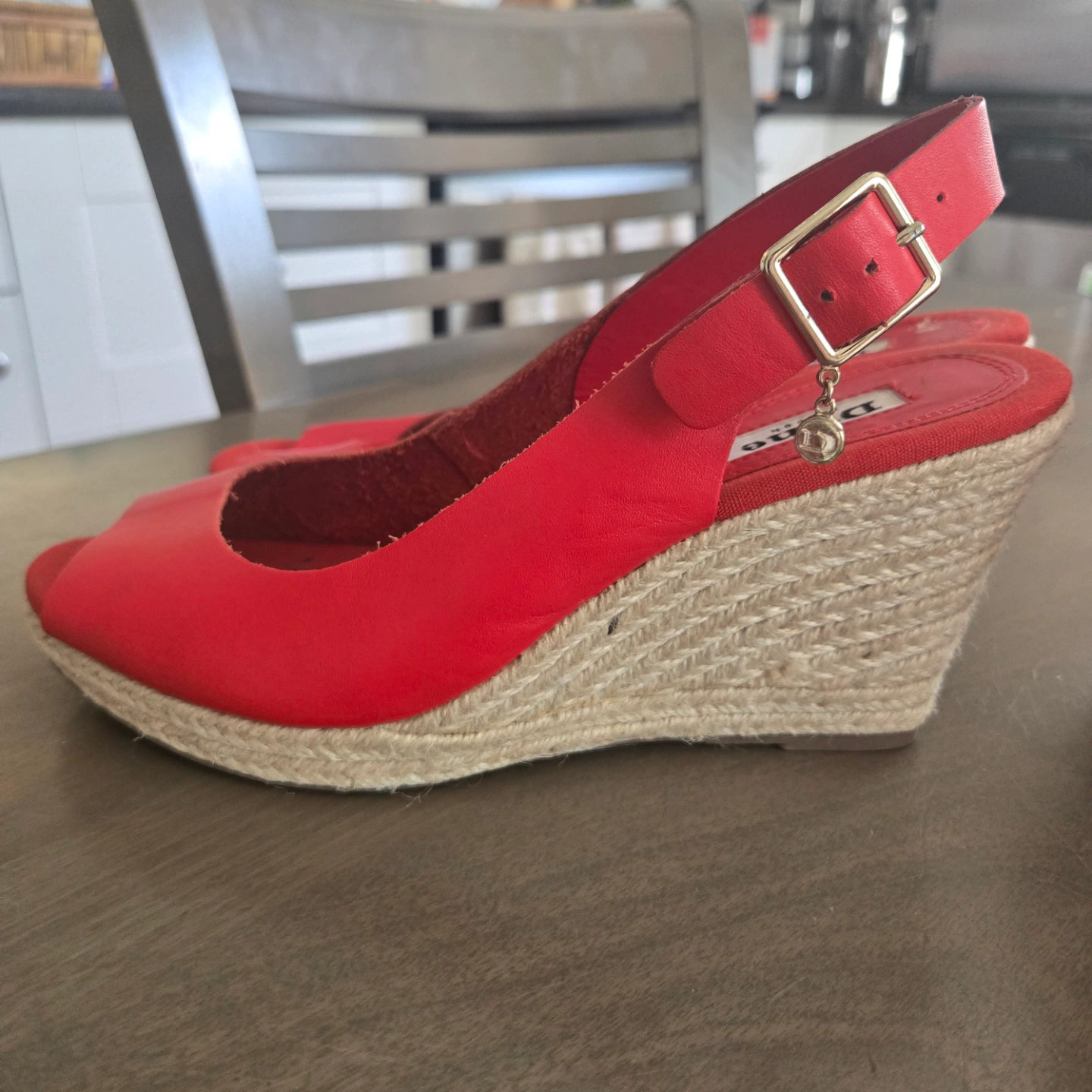 Red wedge heels. Open toe design. Adjustable ankle strap. Woven jute sole. These heels would be perfect for a relaxing afternoon stroll.