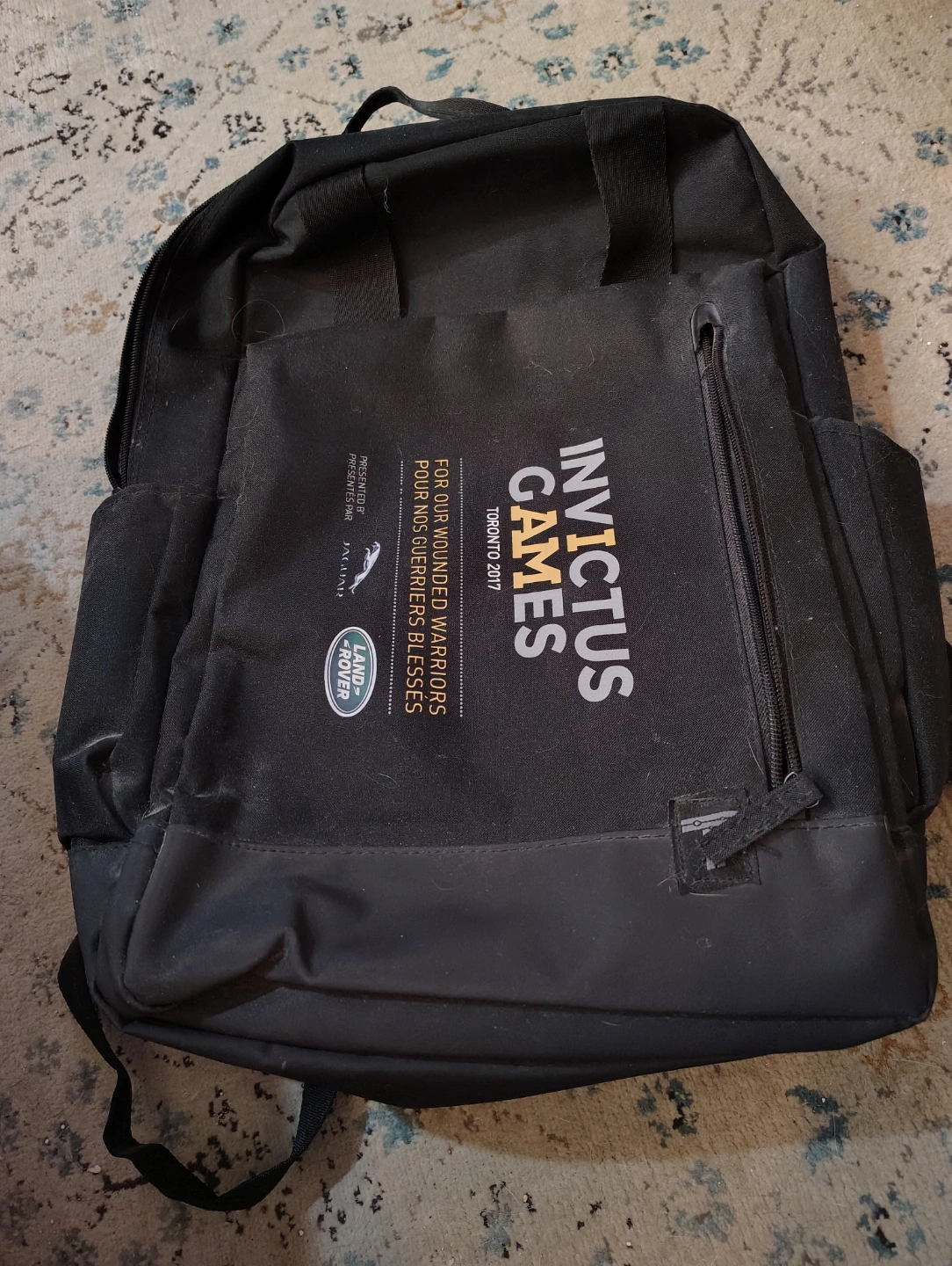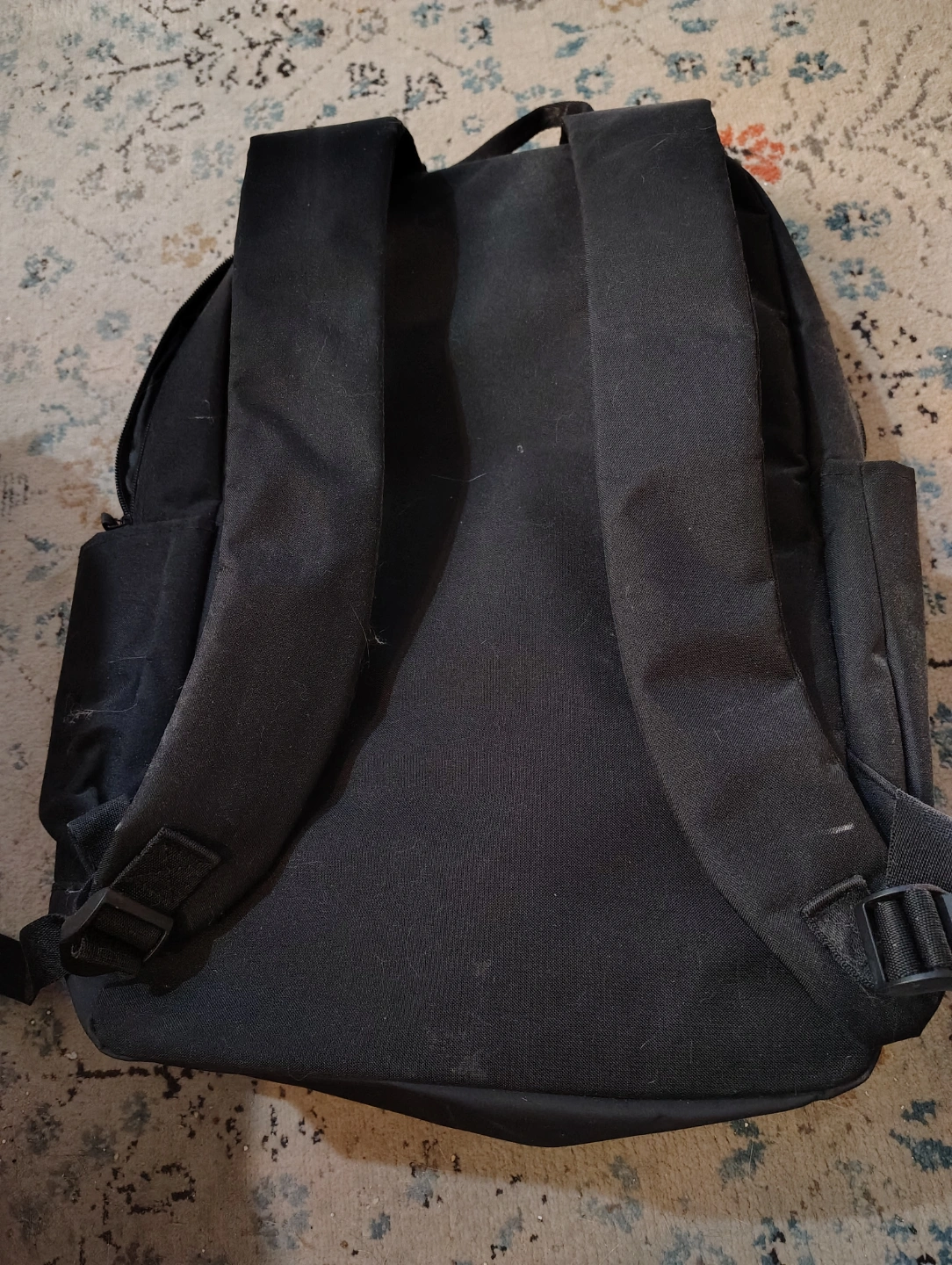 Black backpack. Features a top handle. Adjustable straps. With a front pocket. Great for carrying your essentials while on the go. pick up Yonge and Sheppard