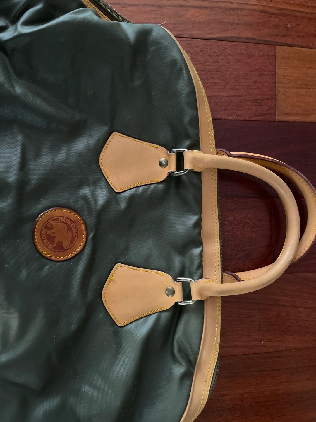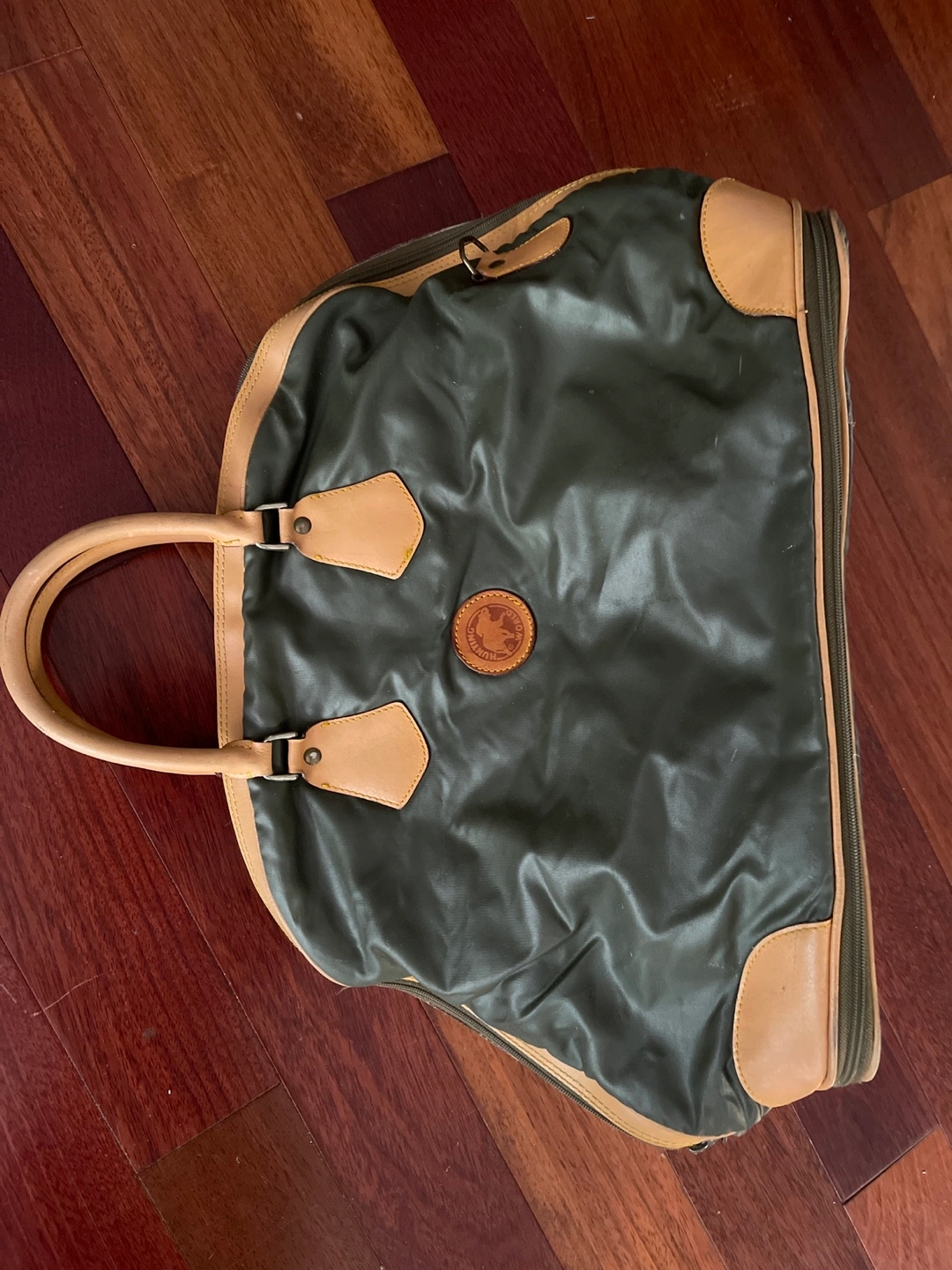 A green duffel bag with a light brown trim and handle. There are metal studs on the bottom of the bag. This bag will be great for travel or overnight stays.