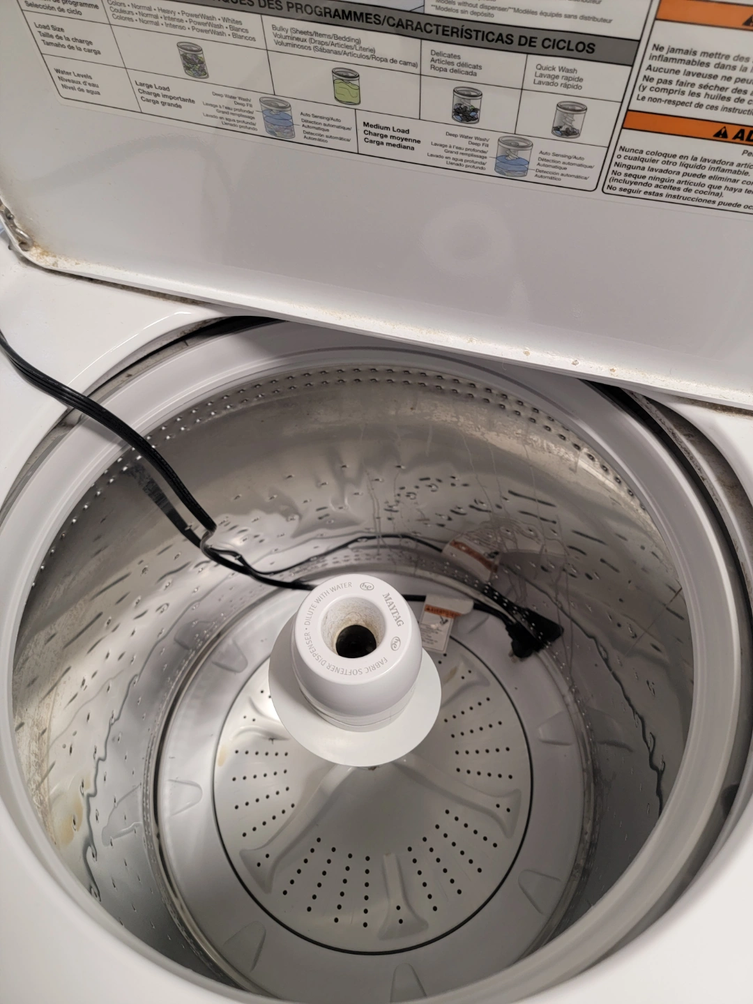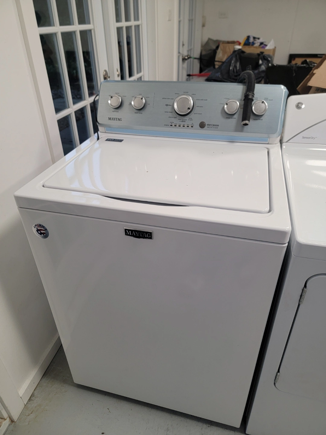 White washer and dryer appliances. The washer has a top lid. Both have multiple settings. Having clean clothes will be a truly satisfying experience for anyone.