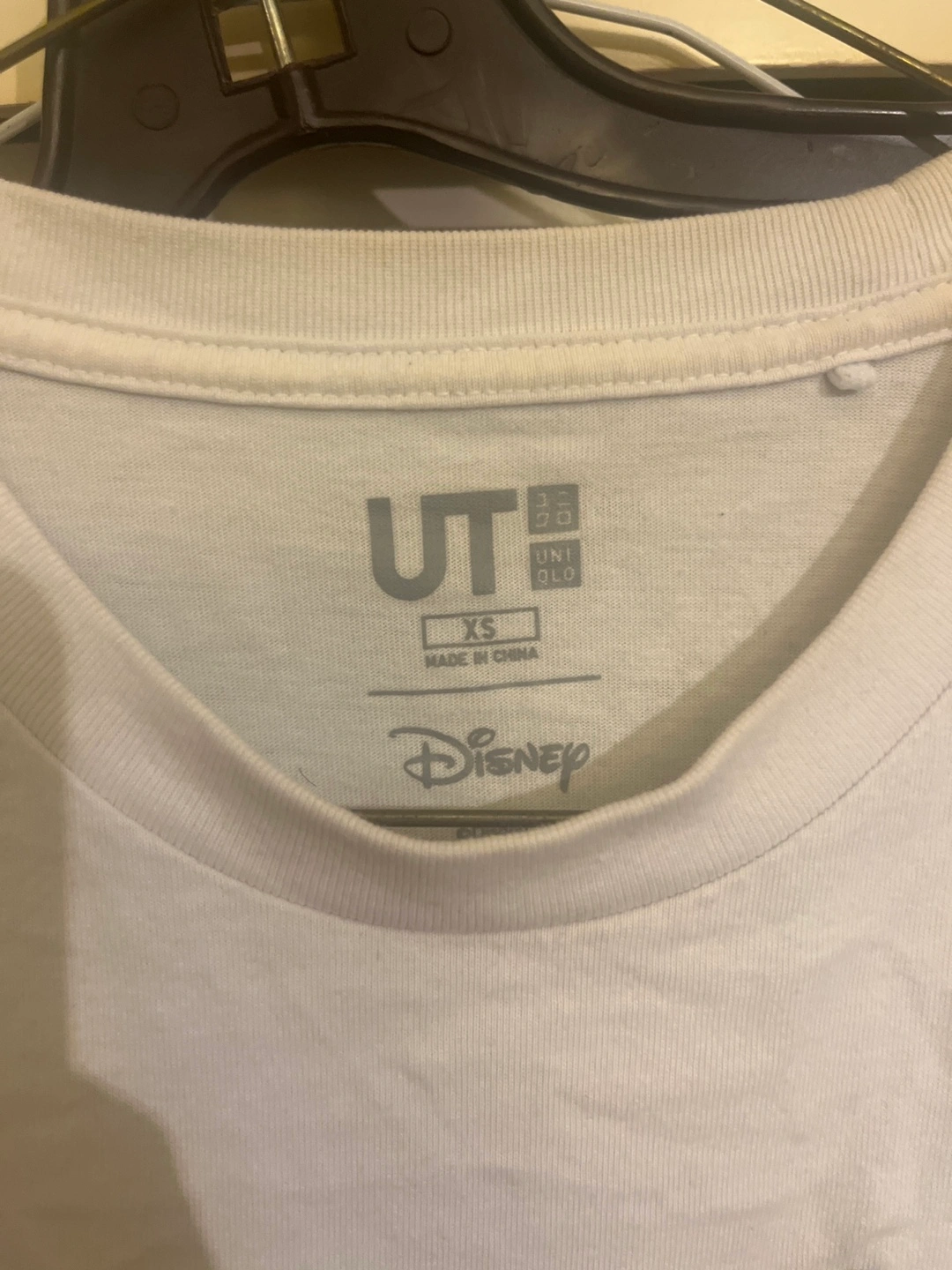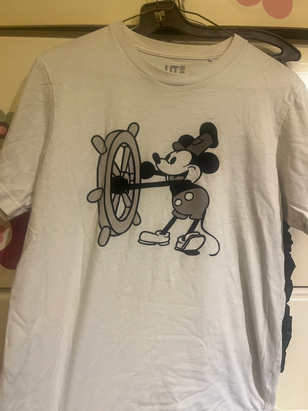 White T-shirt. Features a graphic of Mickey Mouse. Has a velvet texture only on the black parts of the graphic. The perfect shirt to wear on a relaxing day.