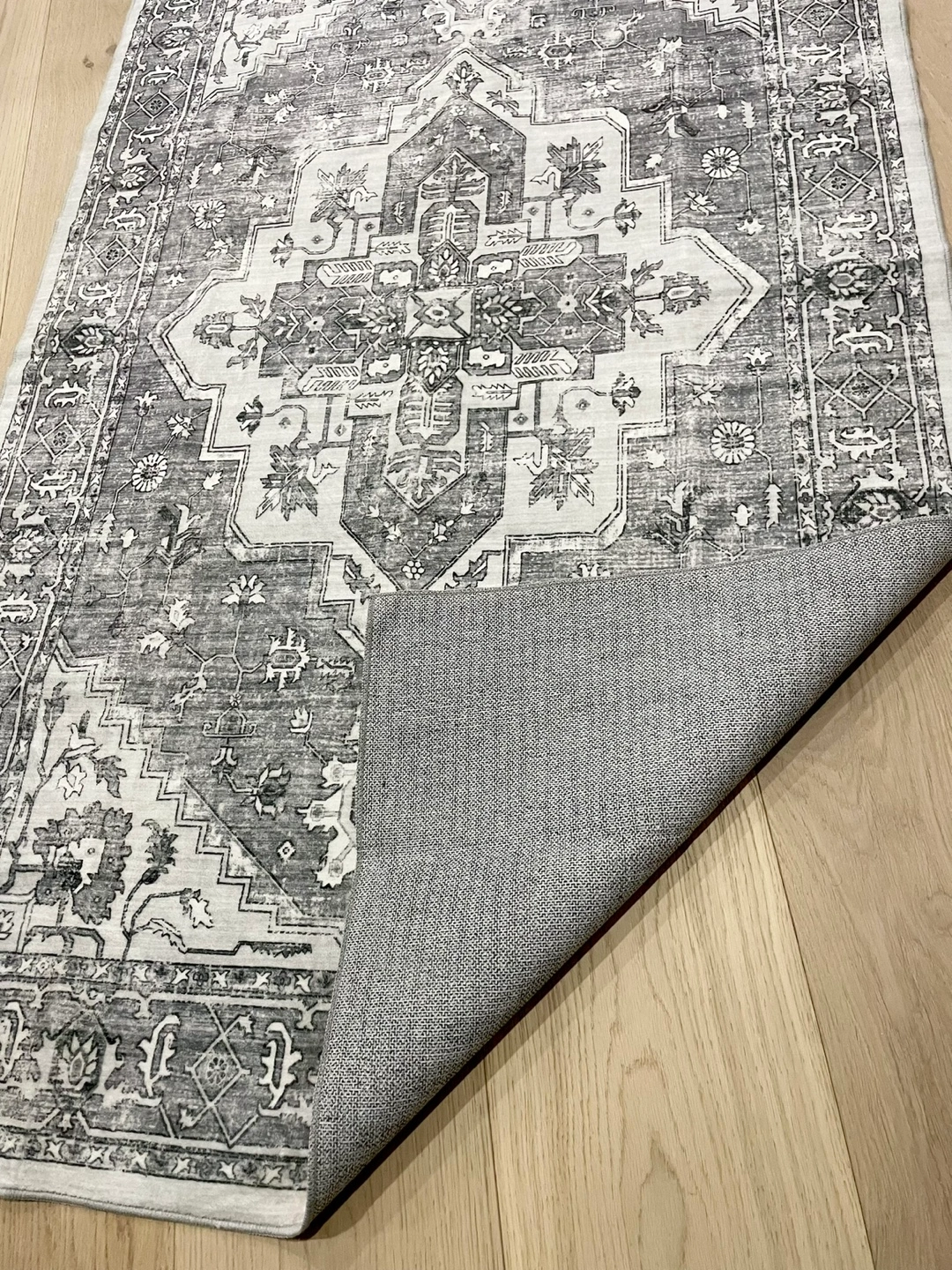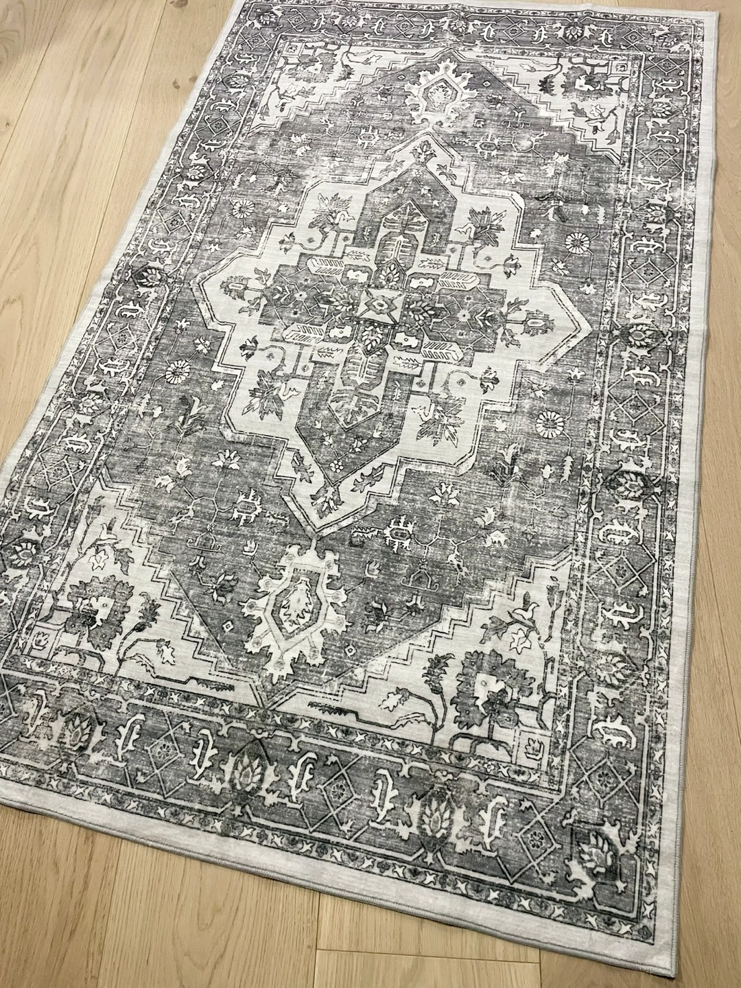 Distressed Vintage 3’x5’ Area Rug. Machine Washable w Anti-Slip. Charcoal Grey/Neutral. New ! $35 firm.