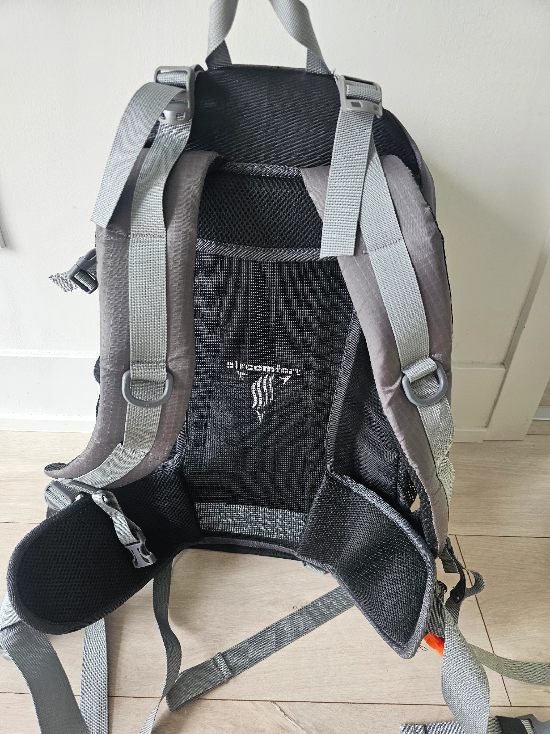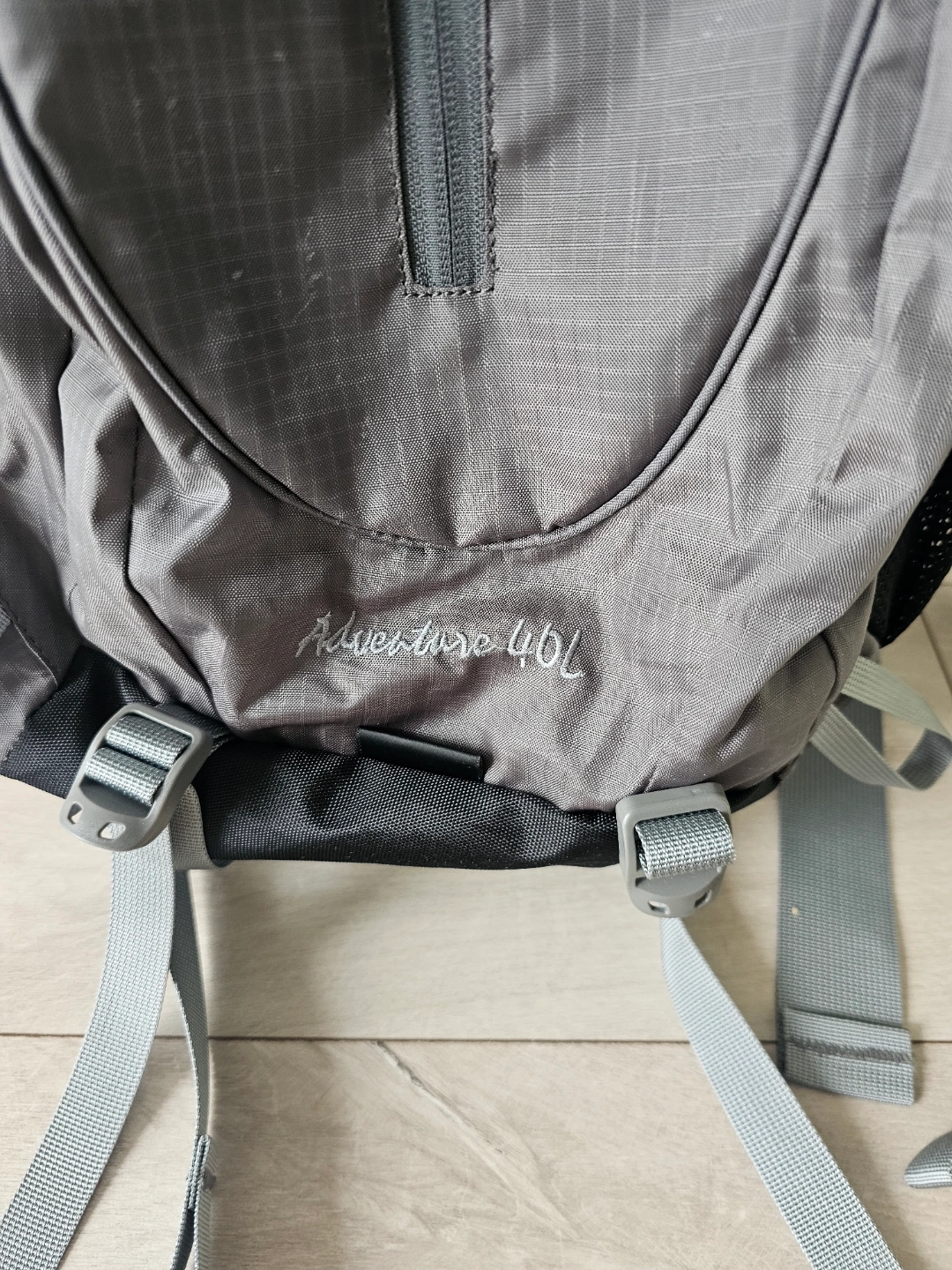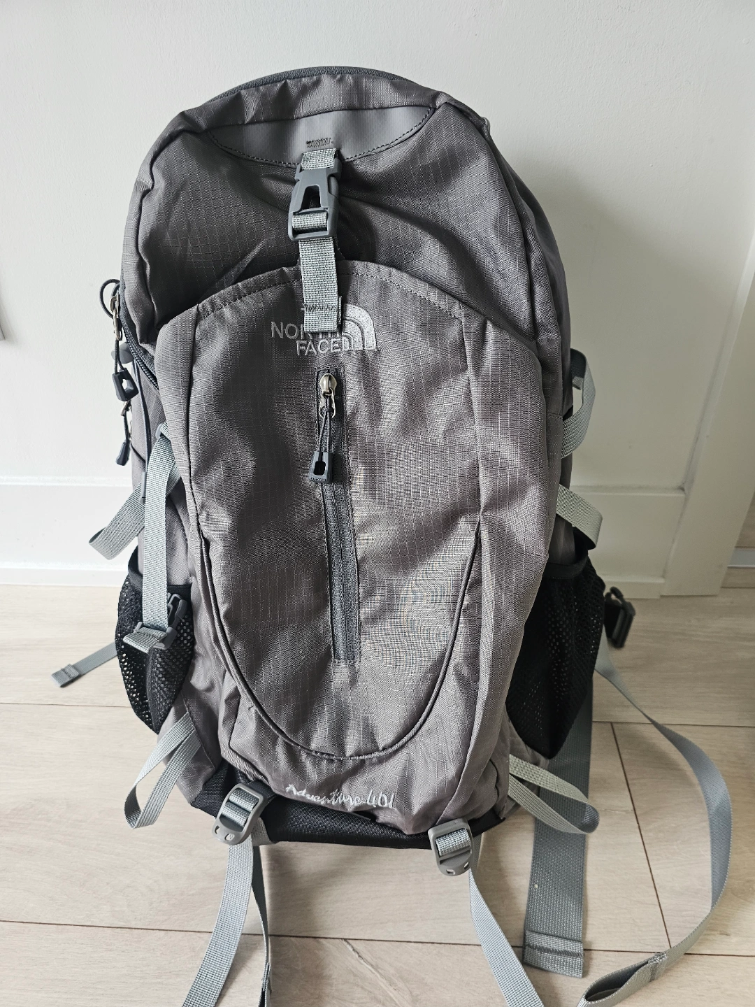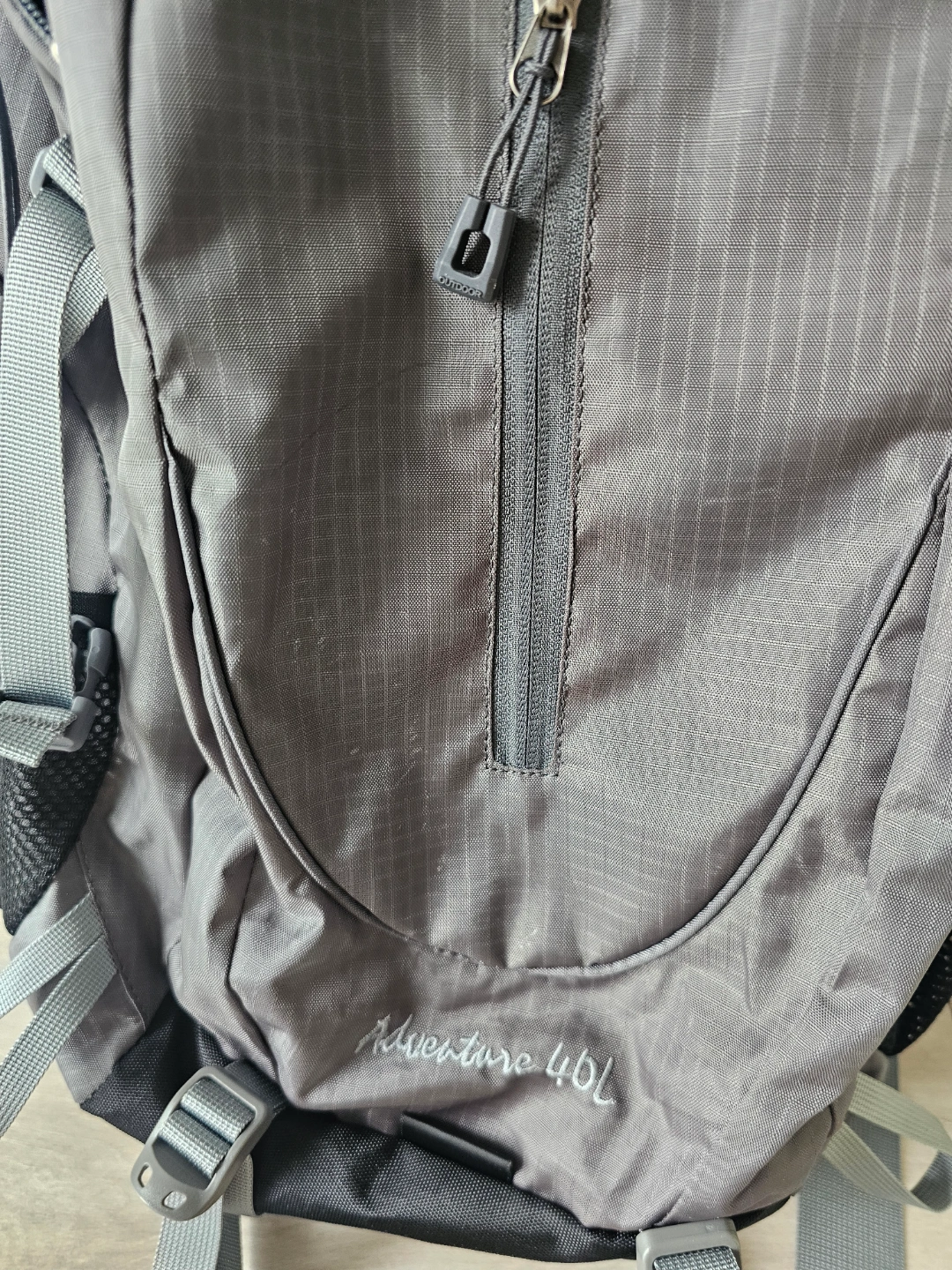 Grey backpack. Zippers across the front. Adjustable straps. Mesh side pockets. The open main compartment offers lots of space, a lovely place to gather your thoughts. I bought it this February for trekking. condition : good