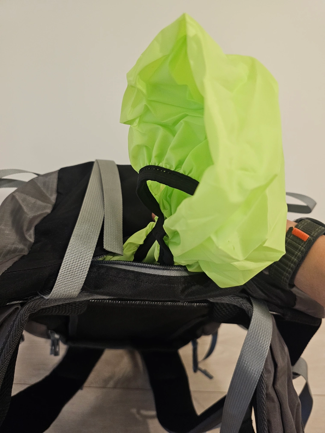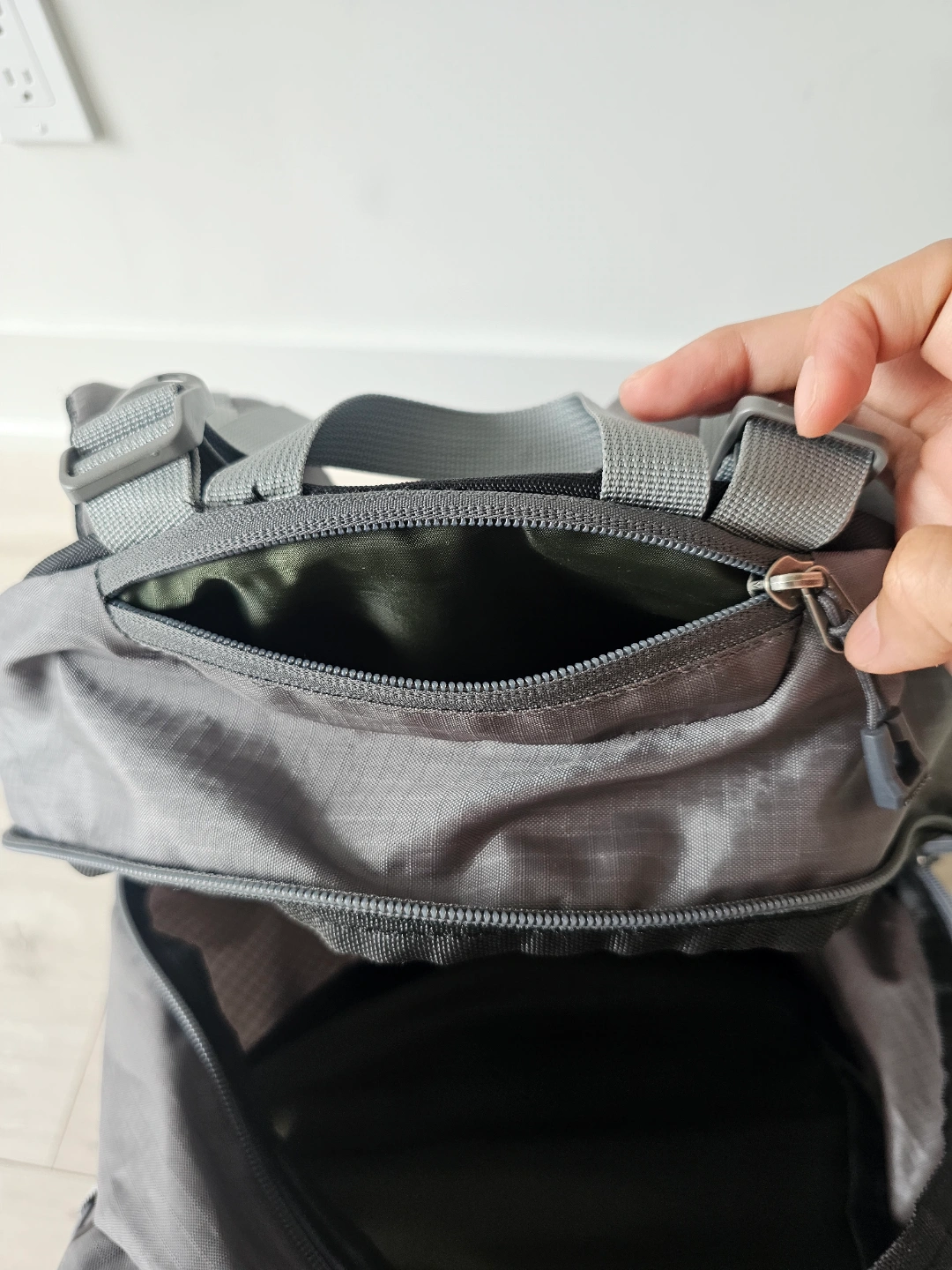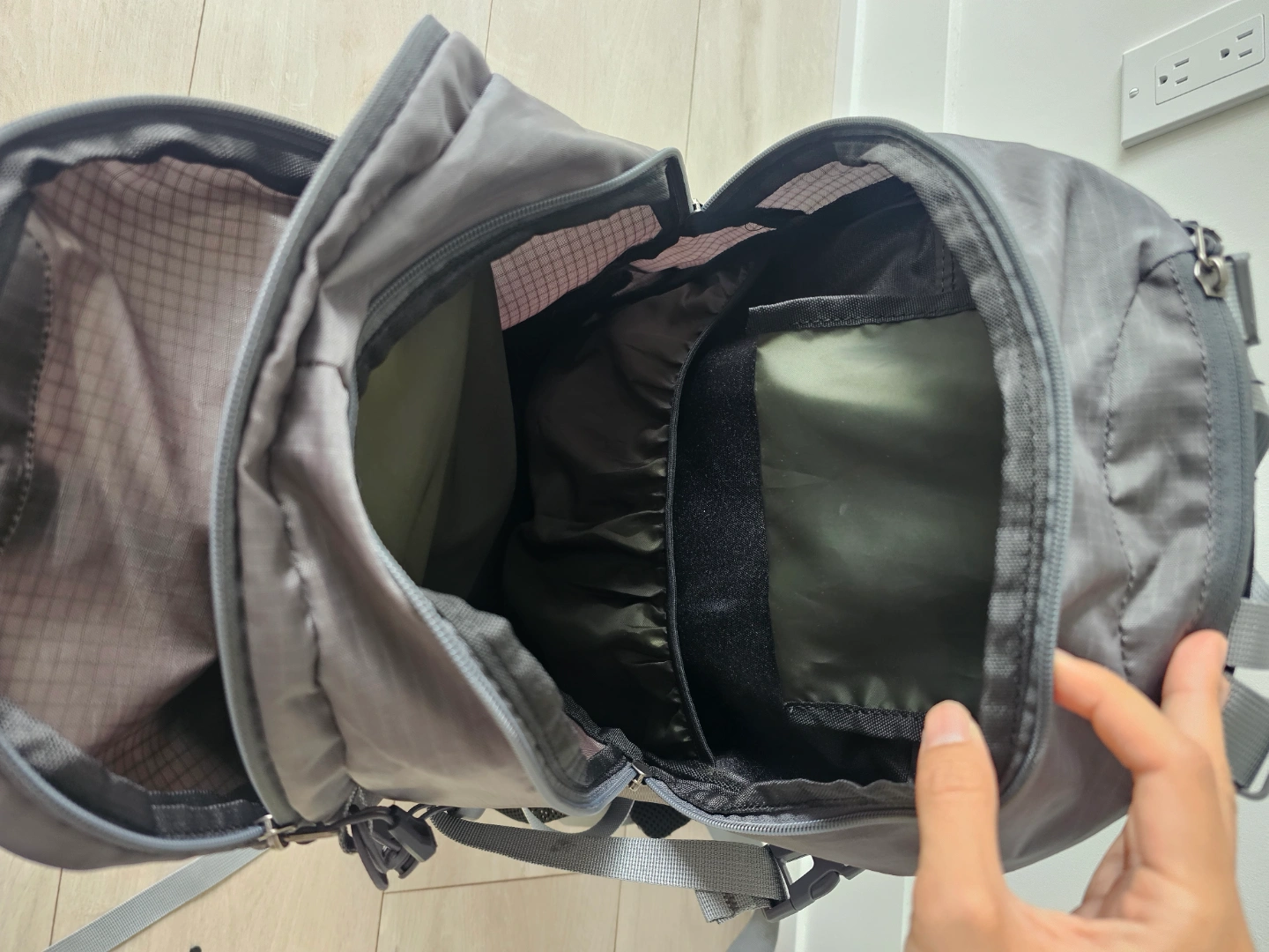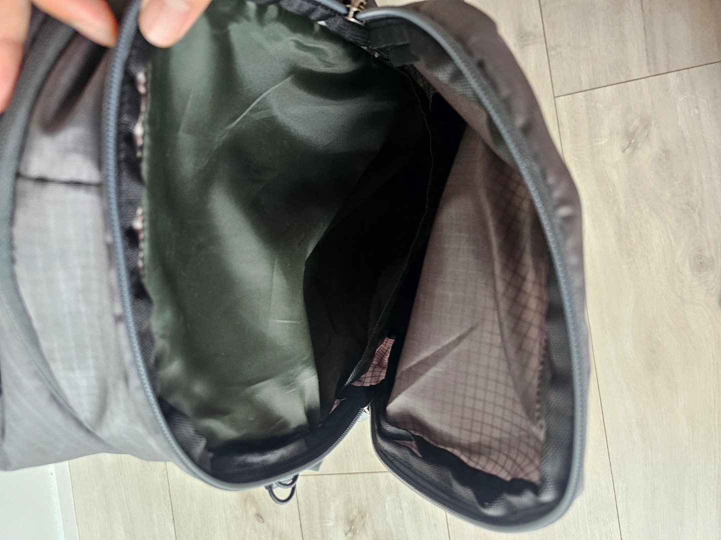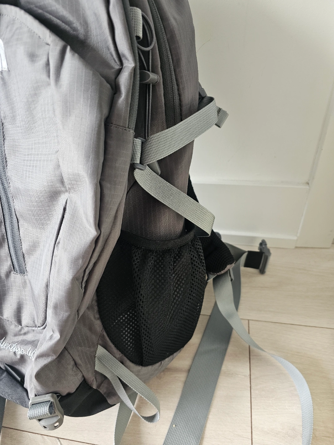 Grey backpack. Zippers across the front. Adjustable straps. Mesh side pockets. The open main compartment offers lots of space, a lovely place to gather your thoughts. I bought it this February for trekking. condition : good