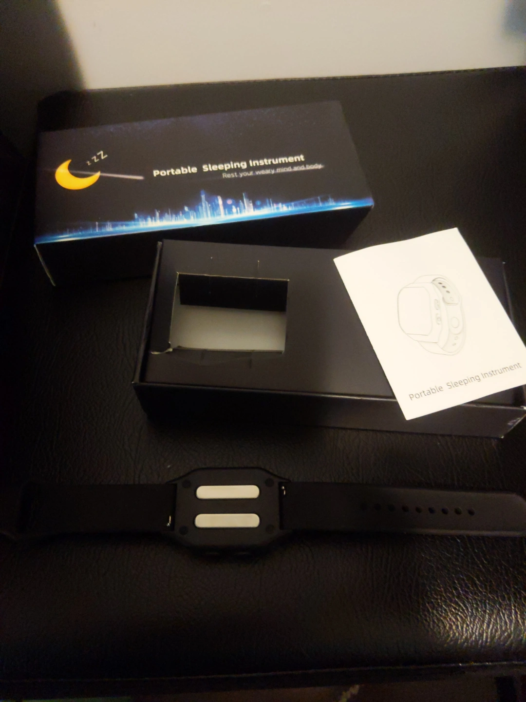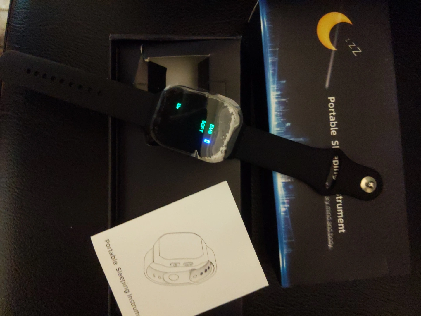 Watch-like device with a black band. Comes with a box and instructions. The box depicts a crescent moon and some ZZZ's. The watch face is square. This item is great for helping you sleep soundly. New . USB charging Serious inquiries only! No delivery