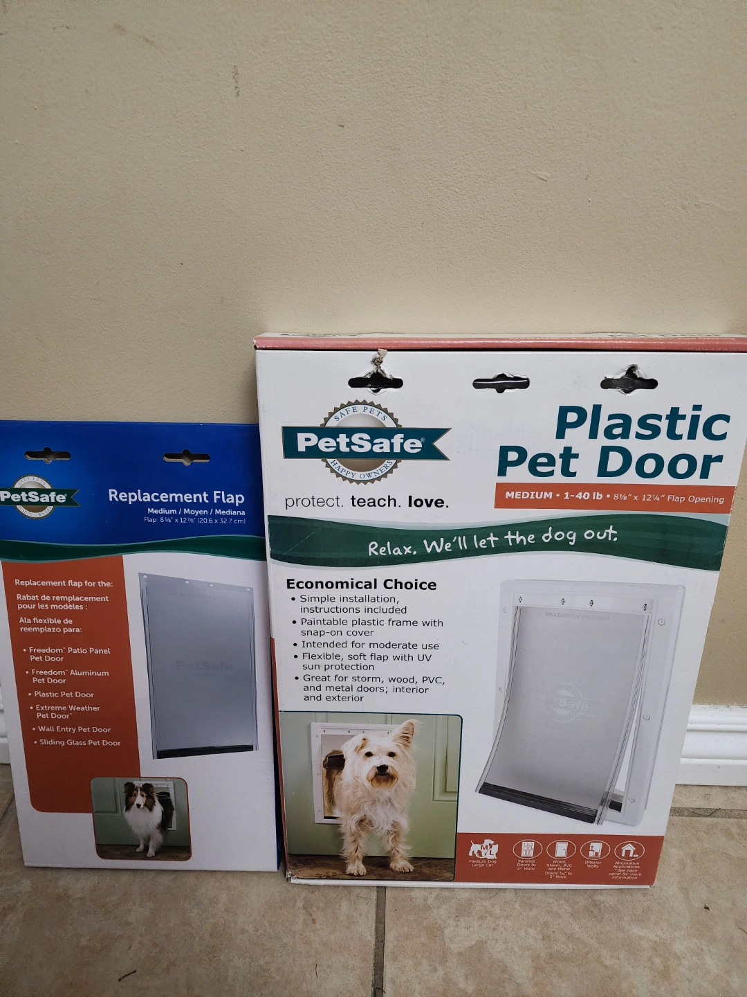 Pet door and replacement flap. The plastic pet door is for medium sized dogs. Consider this for the convenience of your furry friends coming and going as they please.