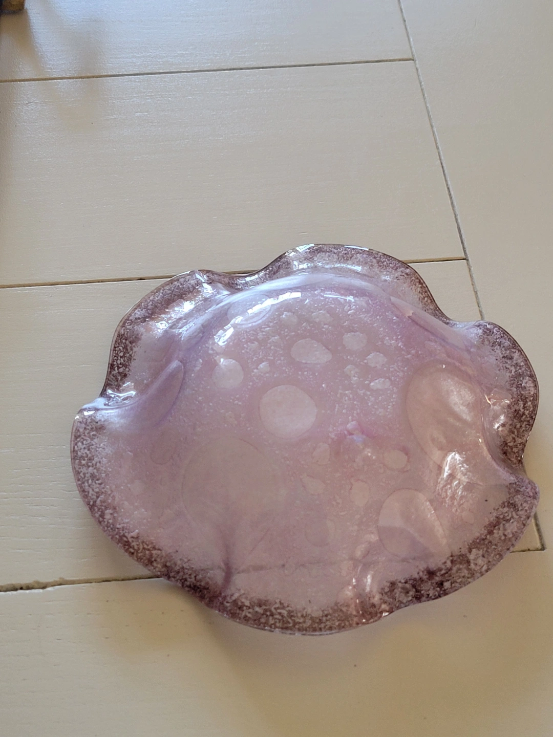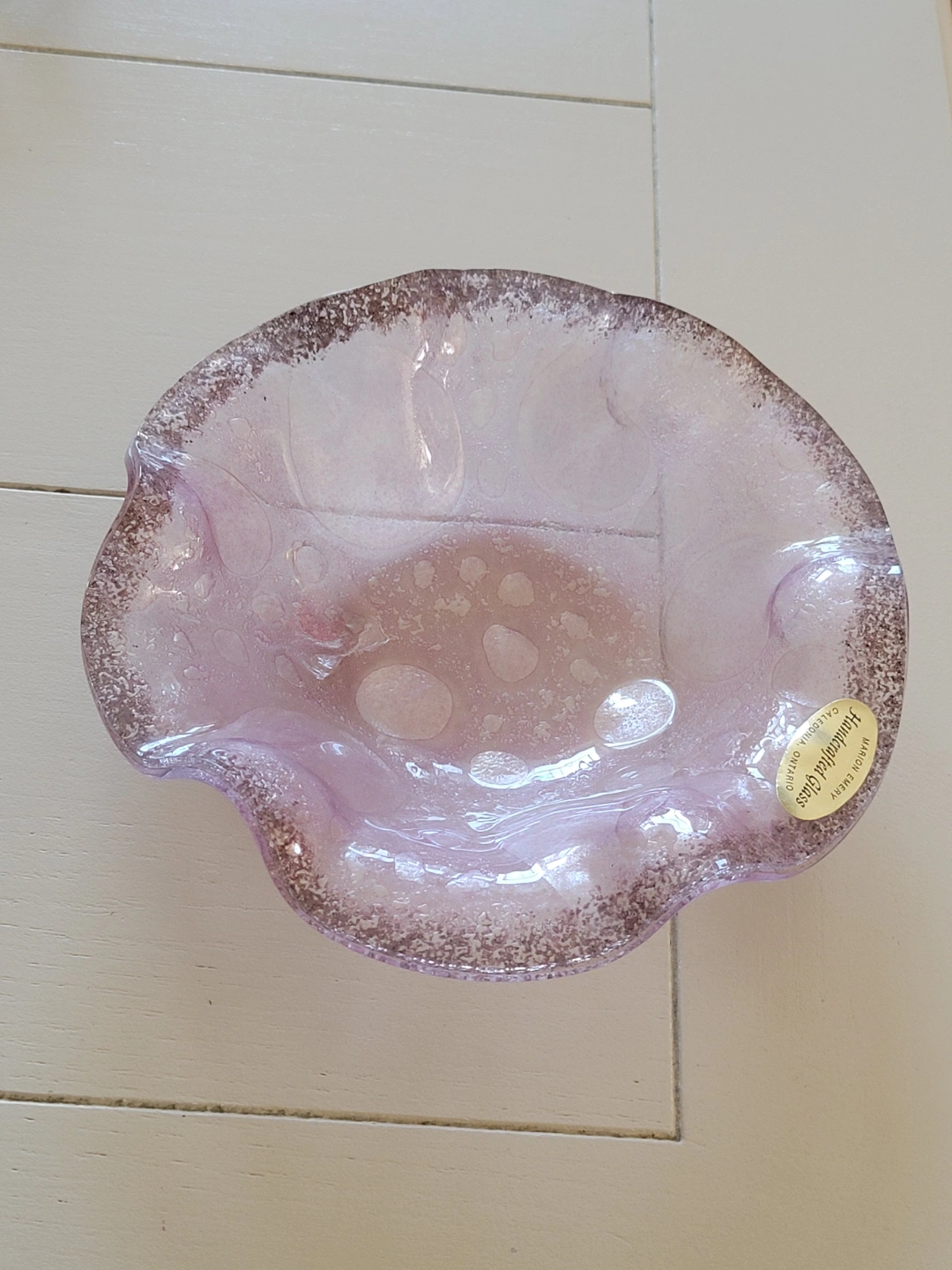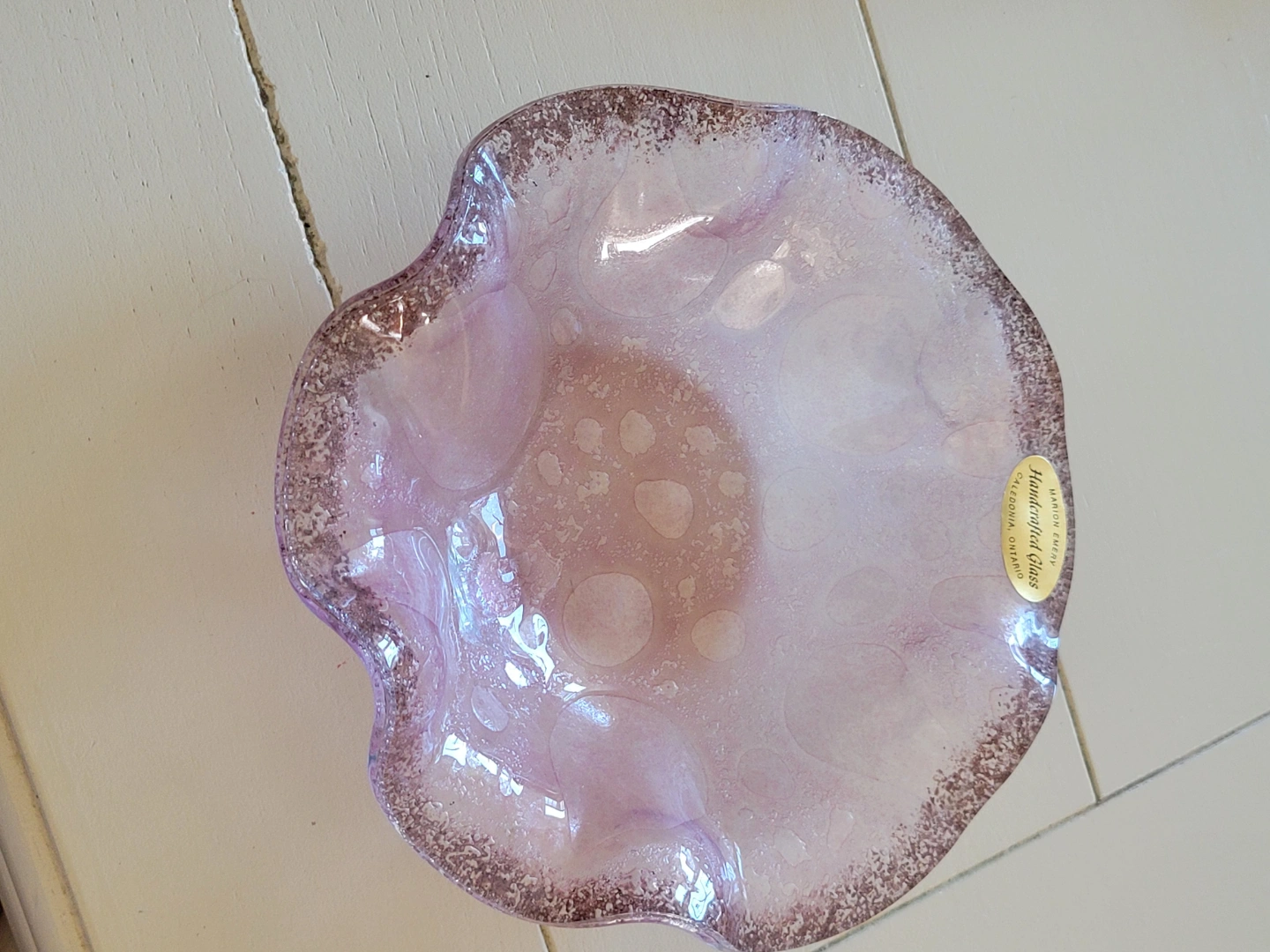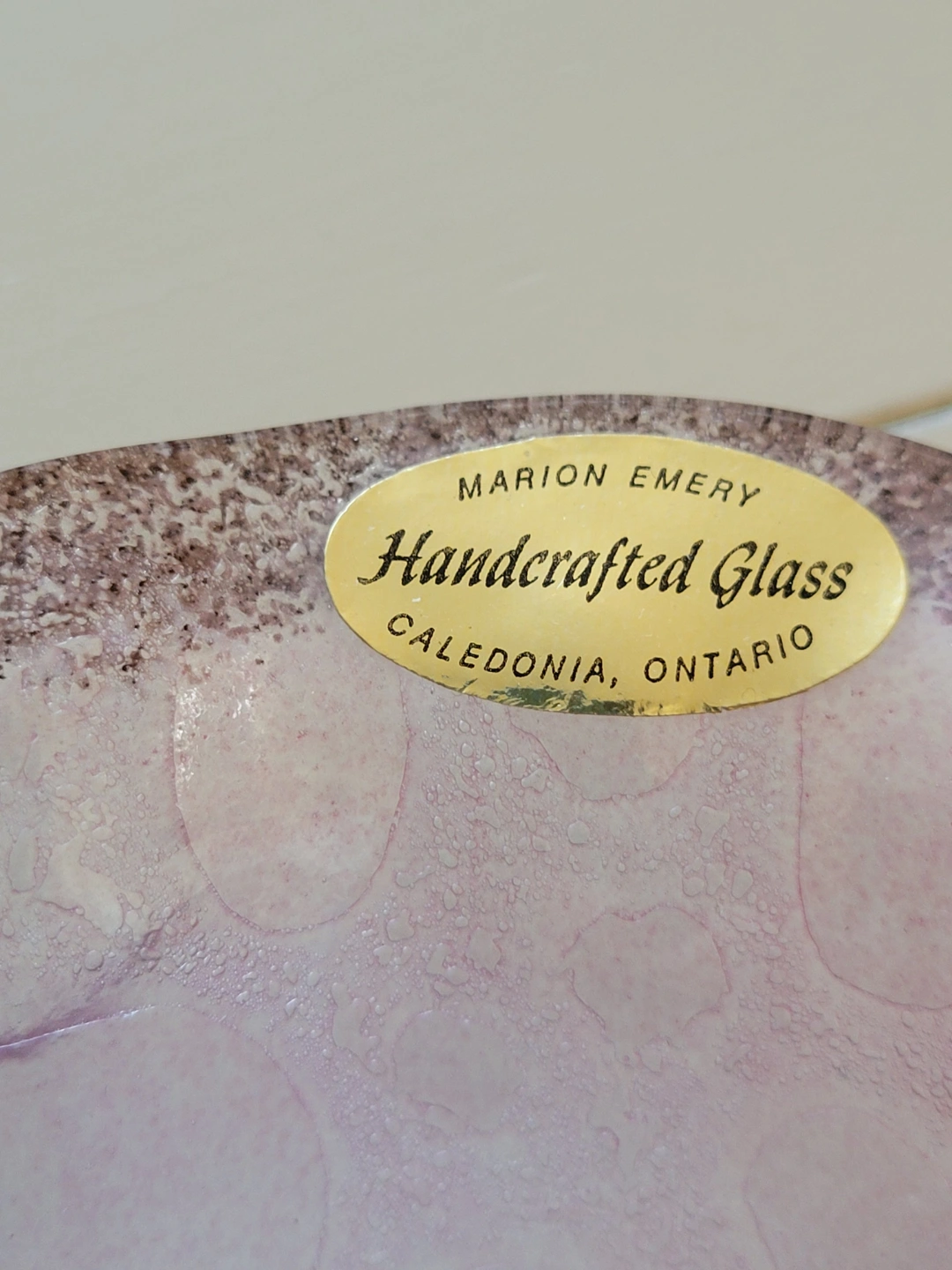 Purple Infused Art Glass Bowl by Canadian Artist Marion Emery from Caledonia, Ontario. Frilled Edge. Original Label. Midcentury Vintage Label Reads: Marion Emery Handcrafted Glass Caledonia, Ontario 7" overall diameter Excellent Condition $20 Firm Fennell and Upper gage Hamilton Please see all my estate listings