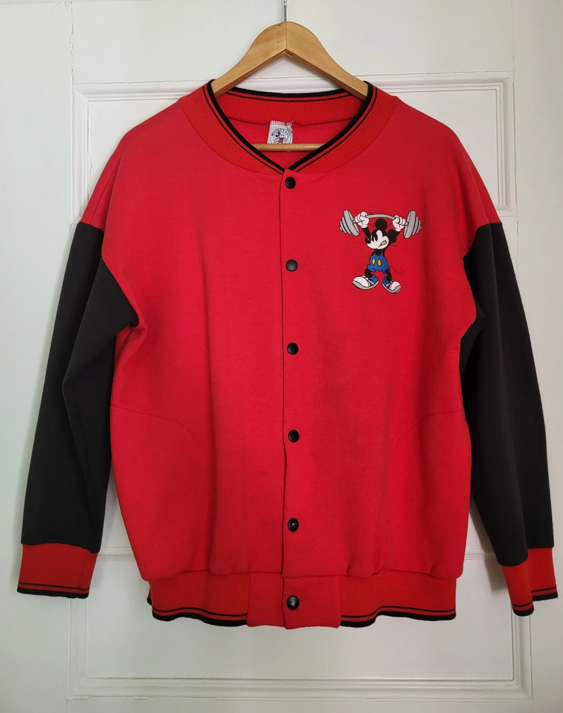 This is one of the Disney originals from the 90s! Retro Varsity Mickey Mouse Disney coat. Made in Vancouver, Canada. Unisex / gender neutral red and black jacket. If you're a women's small to medium, this will be a relaxed, loose fit. It would be a men's small. Light jacket with side pockets for the spring and summer with a light fleece lining. Extremely comfortable and lightweight. Snap button closure. There's one snap clasp missing, see photos for accurate description. Size: Small Men's / Medium Women's Pick up at College and Shaw. Check out my other listings that might be of interest.