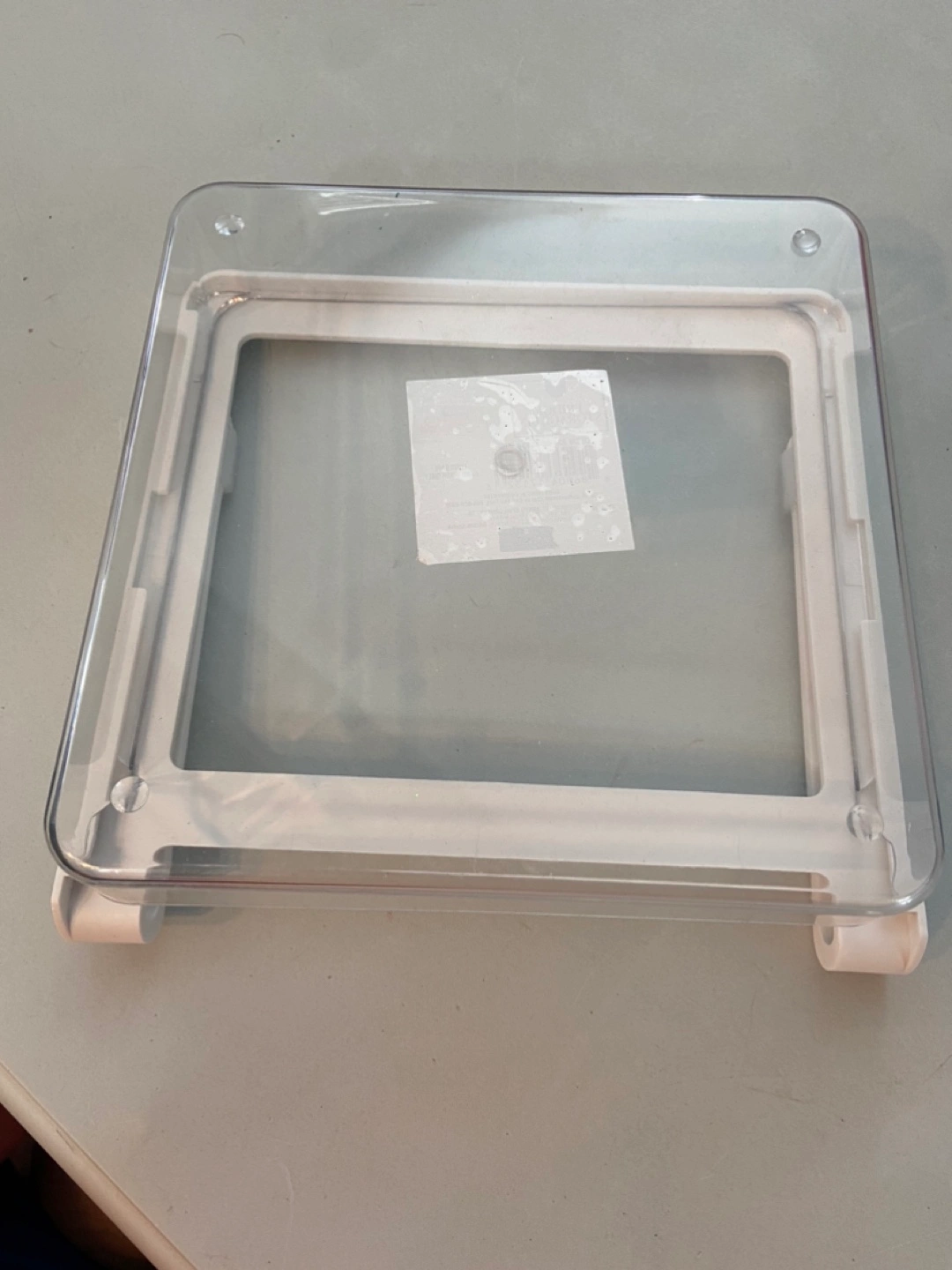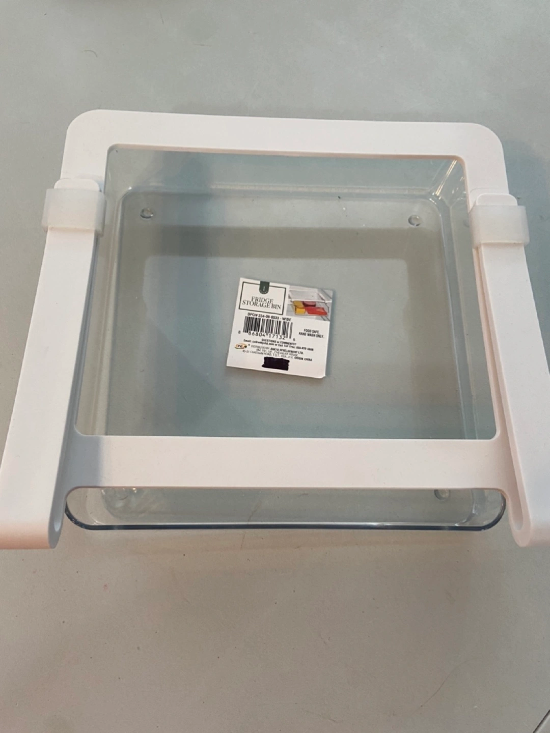 Clear plastic container with white frame. Clear bottom. Useful for organizing items within your refrigerator.