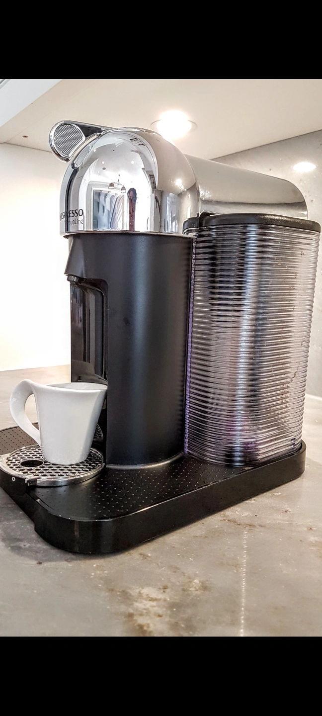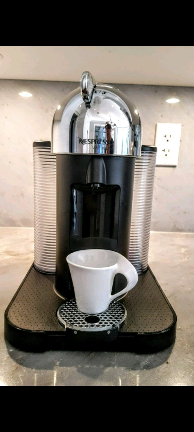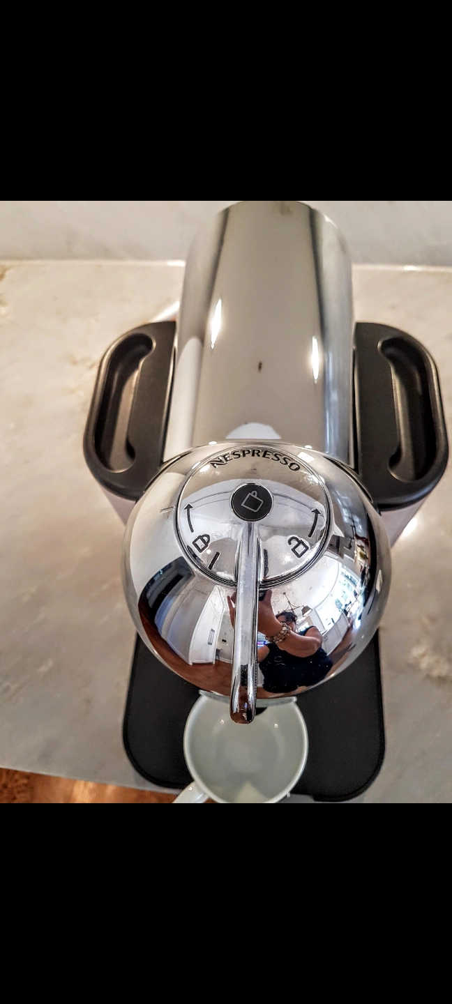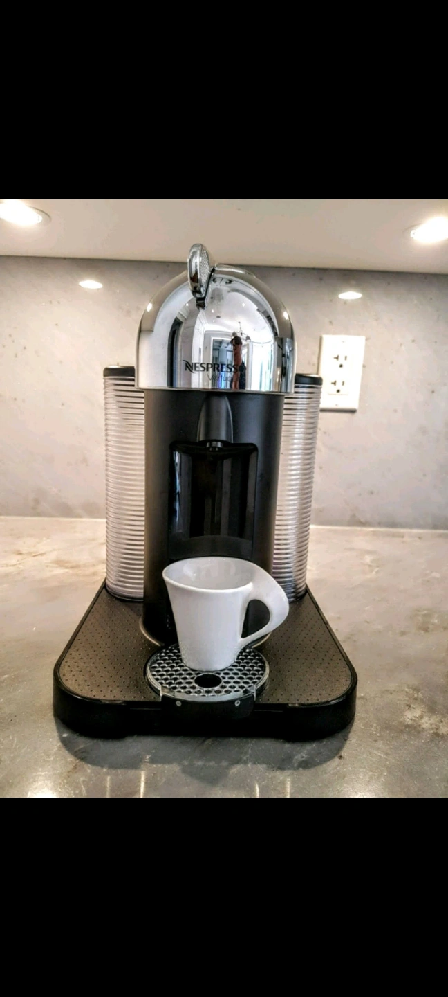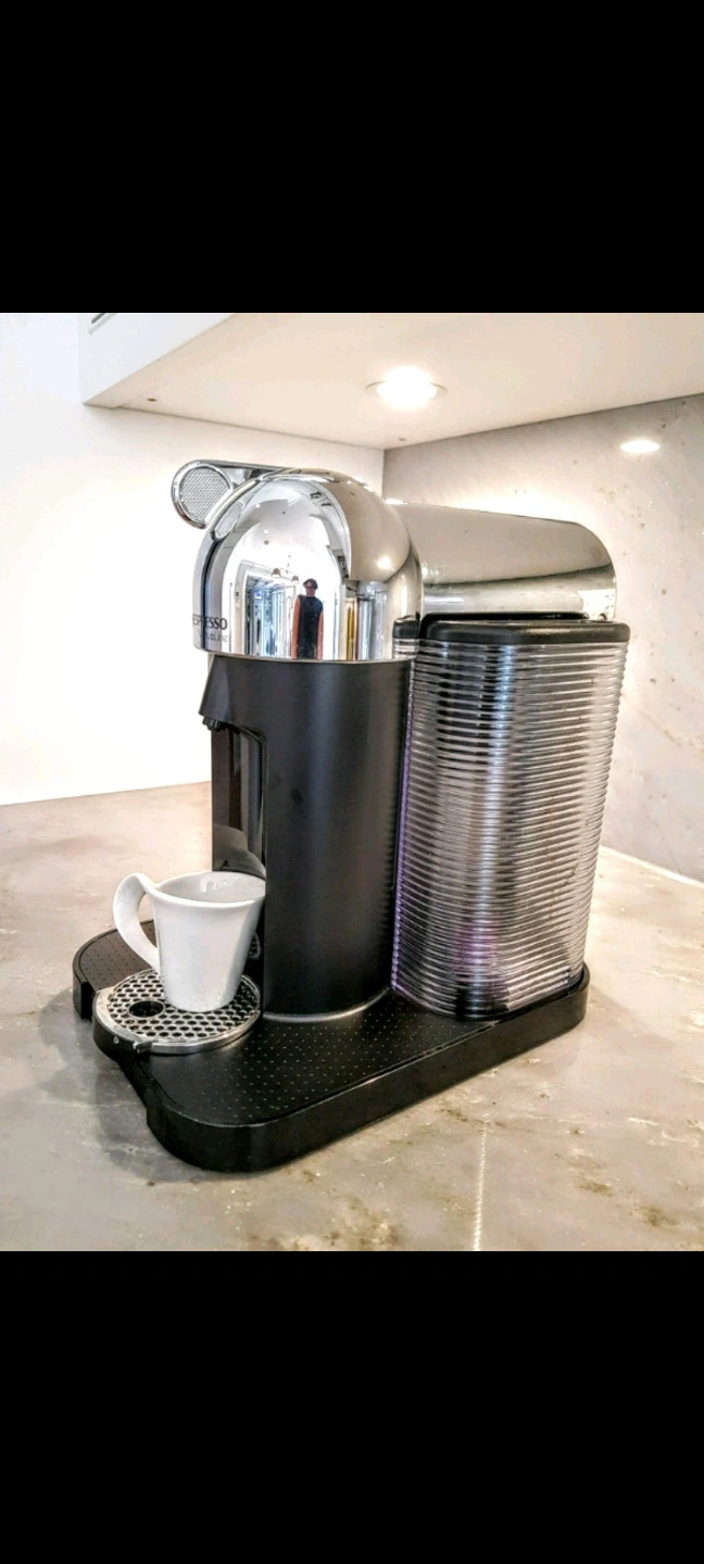 Shiny, chrome Nespresso coffee machine in it's original box. only used to test a handful of times. Features a black base with a cup rest. Includes two transparent containers one for the water and the second one is for used coffee pucks. Frother is not included. Enjoy a cup of your favourite coffee in the morning to set the mood for your day. pickup in Richmond Hill