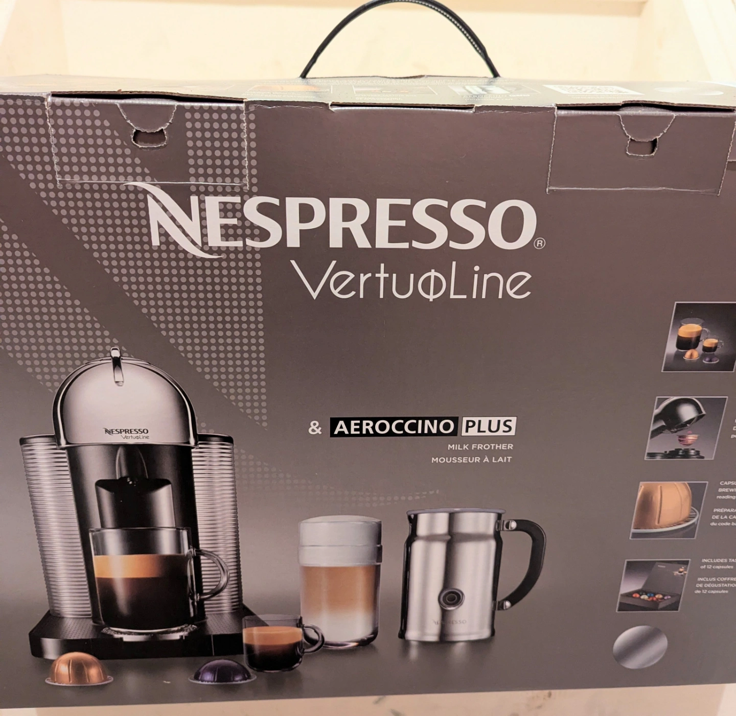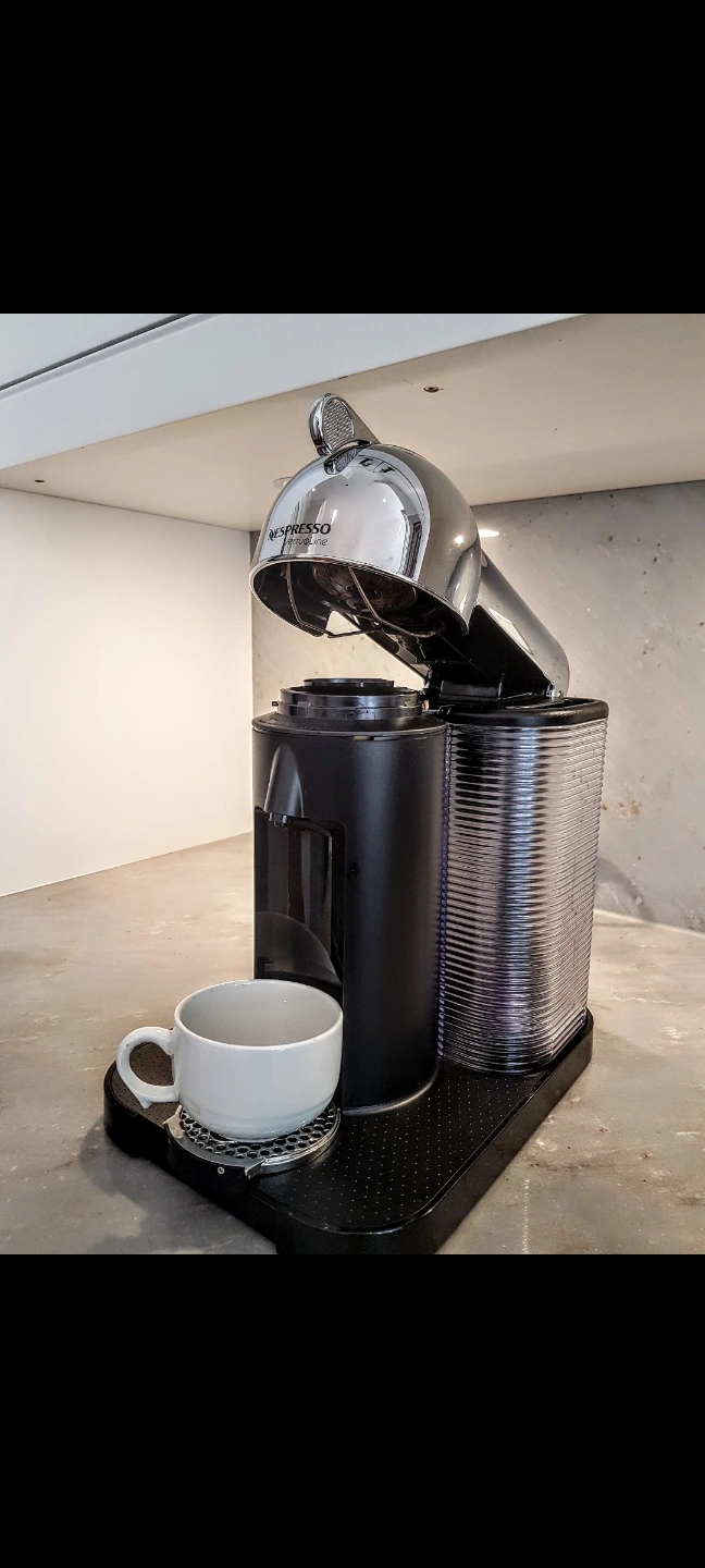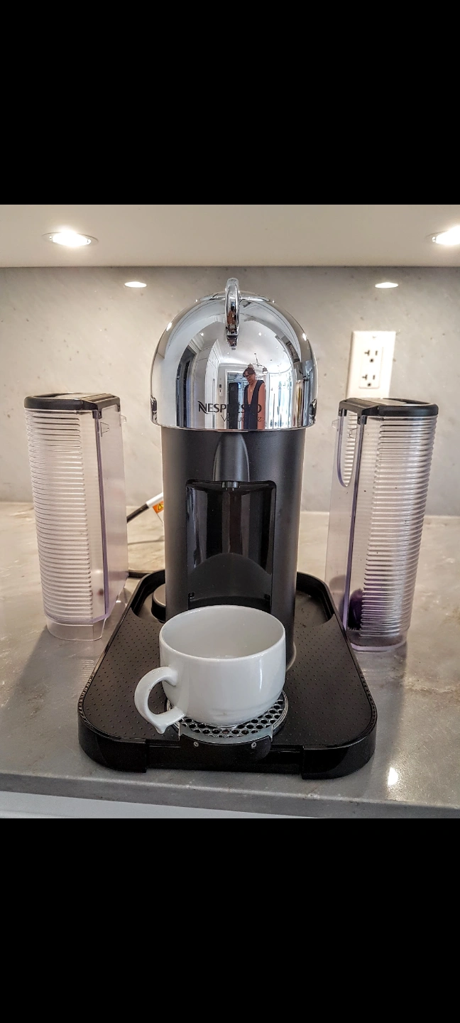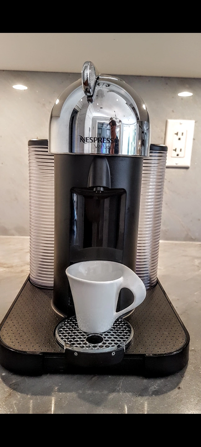 Shiny, chrome Nespresso coffee machine in it's original box. only used to test a handful of times. Features a black base with a cup rest. Includes two transparent containers one for the water and the second one is for used coffee pucks. Frother is not included. Enjoy a cup of your favourite coffee in the morning to set the mood for your day. pickup in Richmond Hill