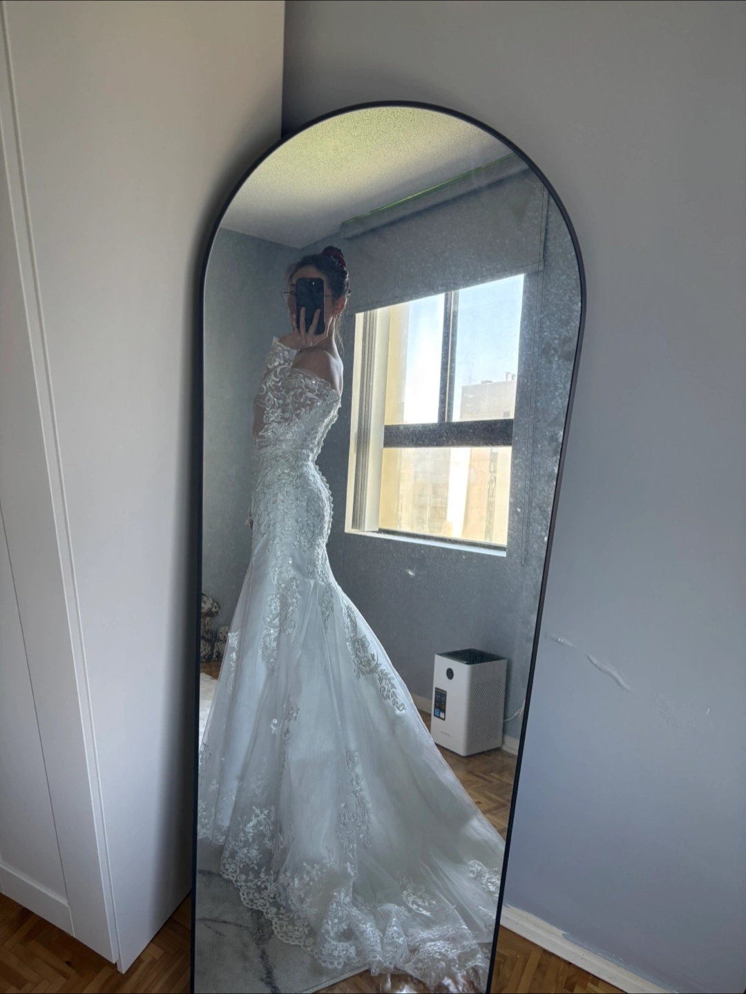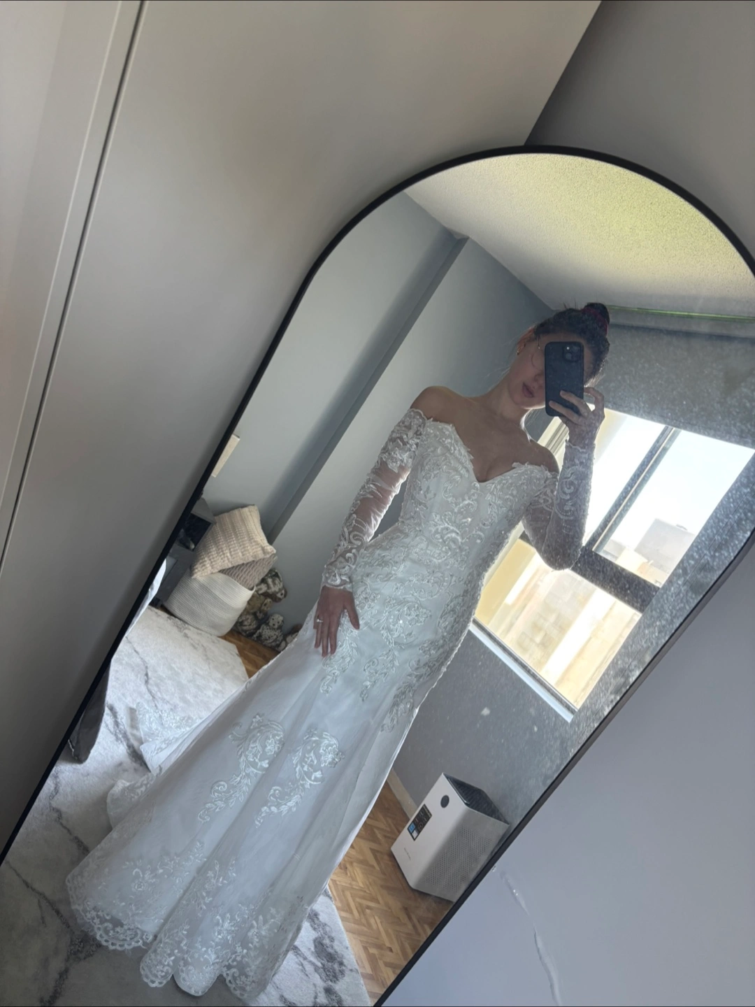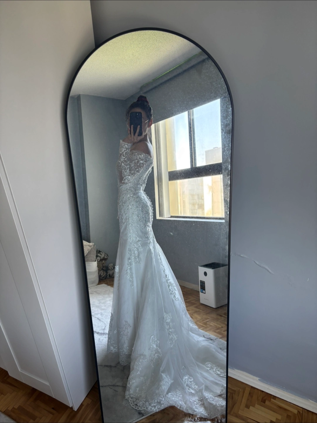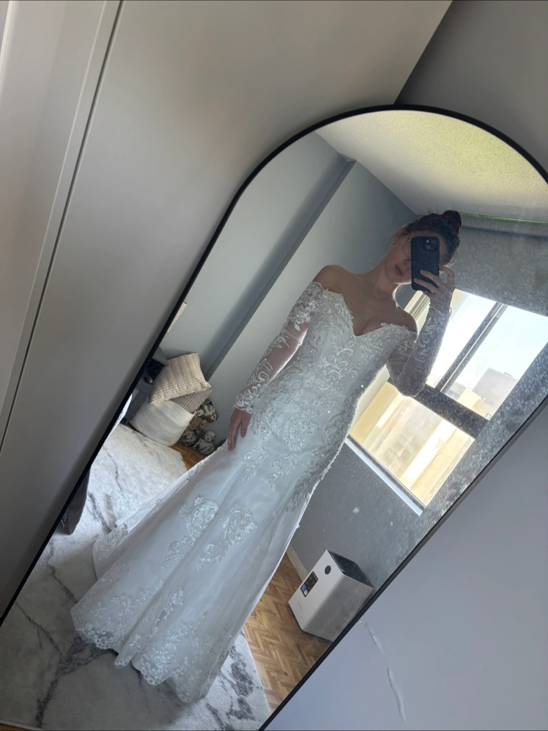 BRAND NEW, NEVER WORN. Parting with this beautiful wedding dress. I ended up picking another dress for my day but already purchased this. Off-the-shoulder neckline. Long, fitted sleeves. Beautiful train and very form fitting, snatches the waist and emphasizes the booty. The detailing is gorgeous, with hand beading. Not from a fancy brand but it’s great quality and I hope it finds a good home.