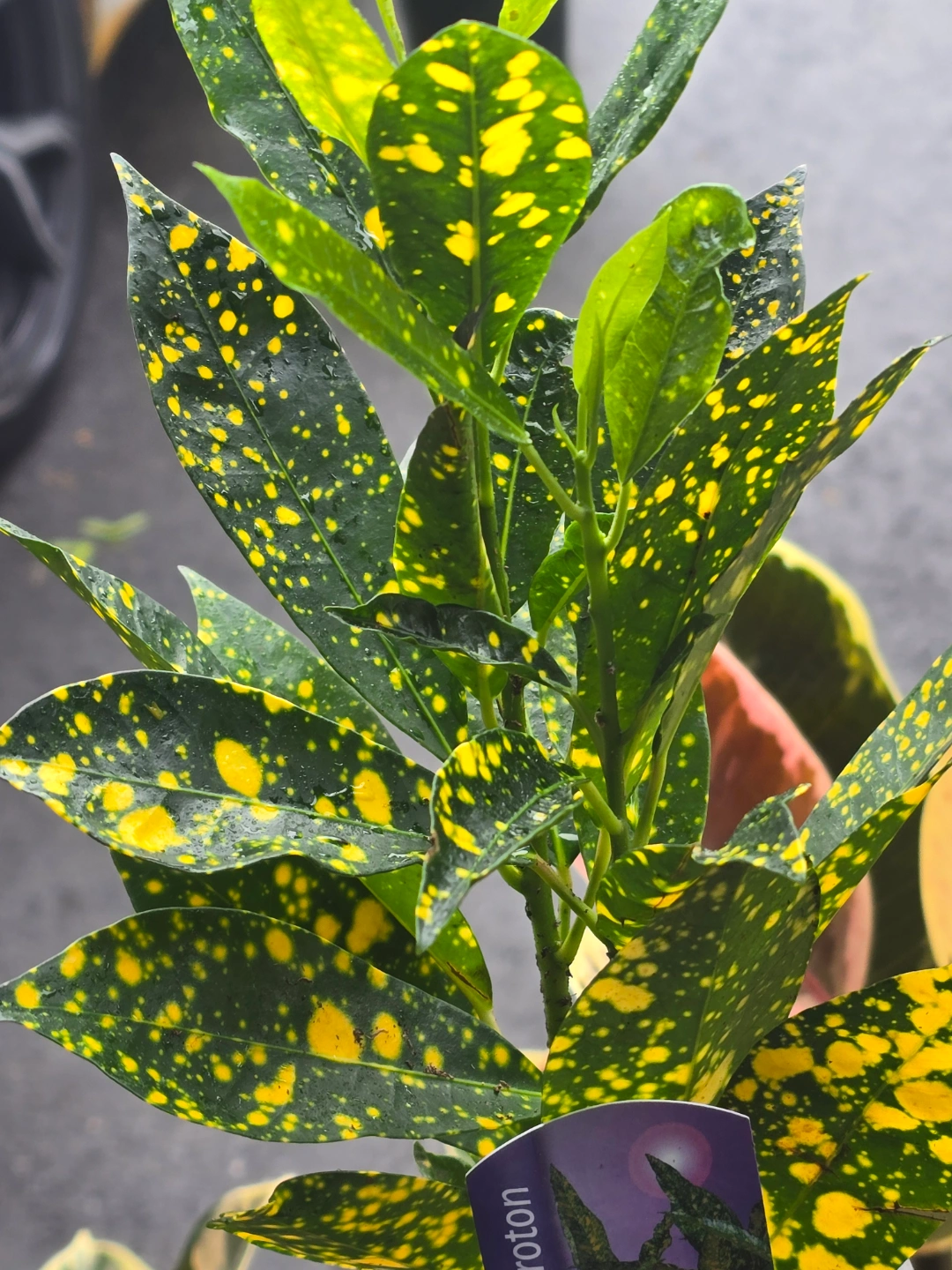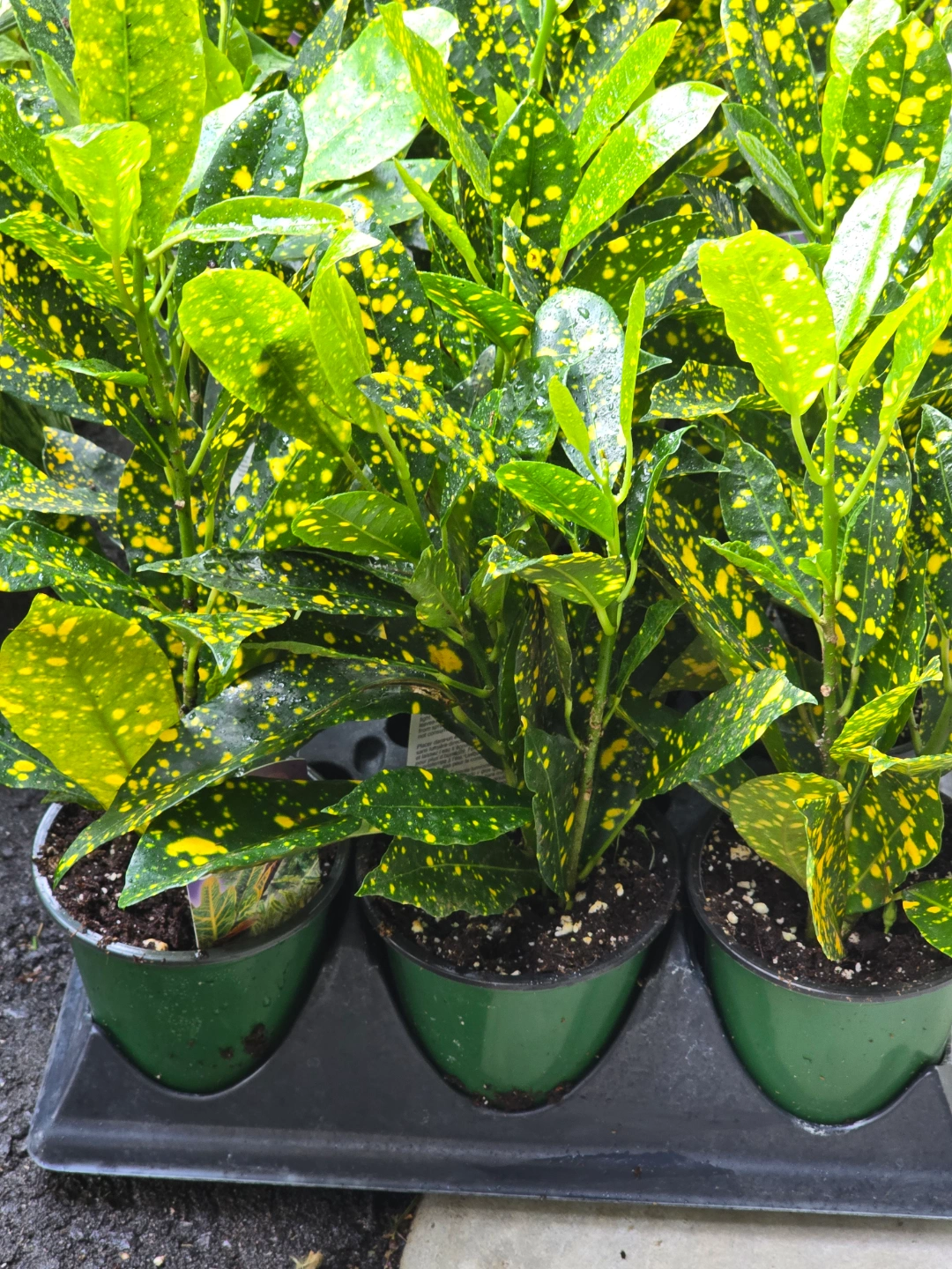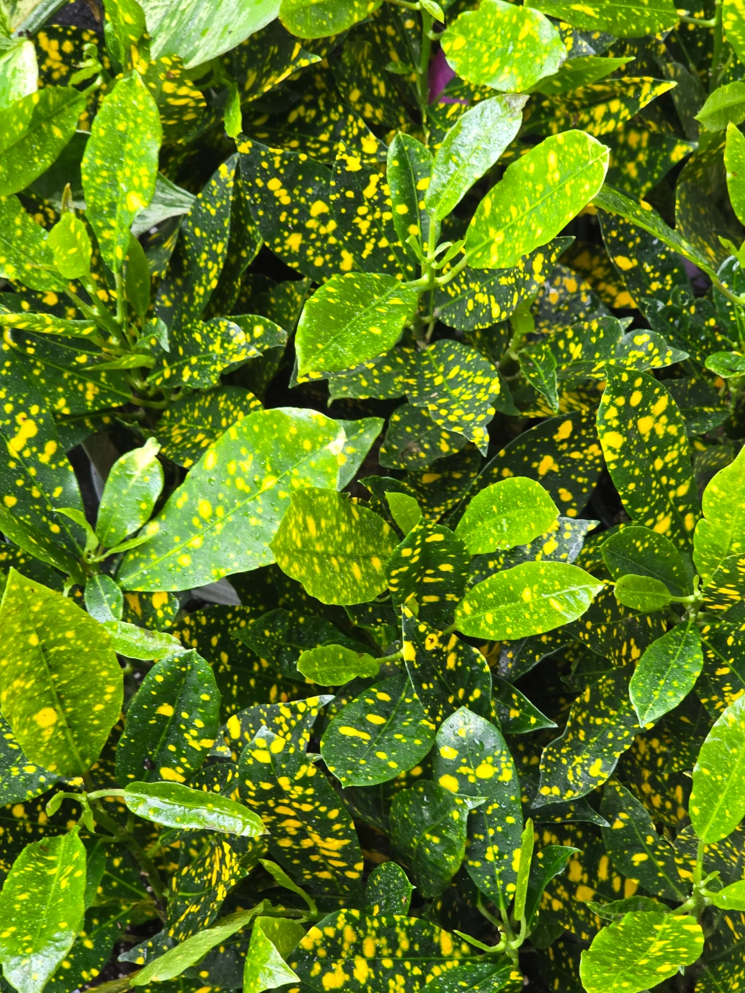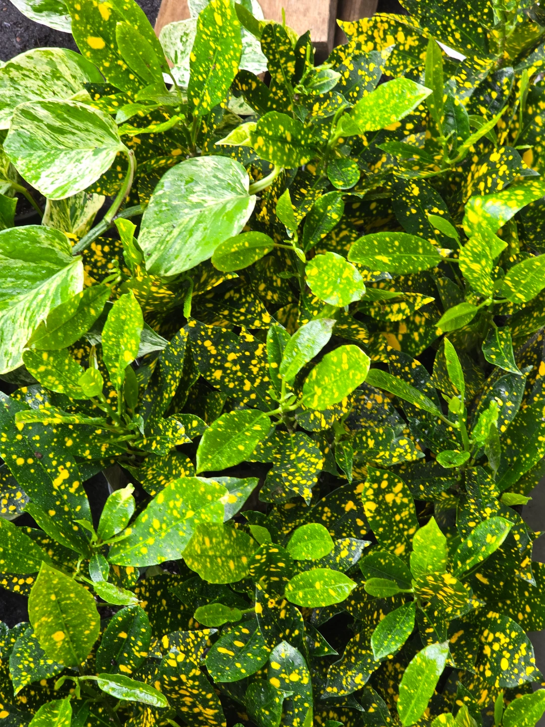 Bright green plant with speckled yellow spots. Various large leaves and smaller leaves. A great plant to brighten up your indoor space.