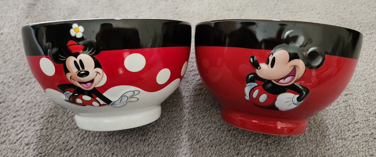 Pair of bowls. Features Mickey and Minnie Mouse. Red, white, and black colours. A lovely warm bowl is perfect for a soothing evening meal.