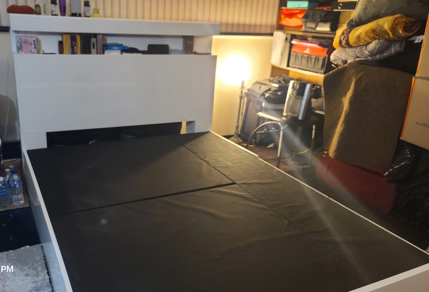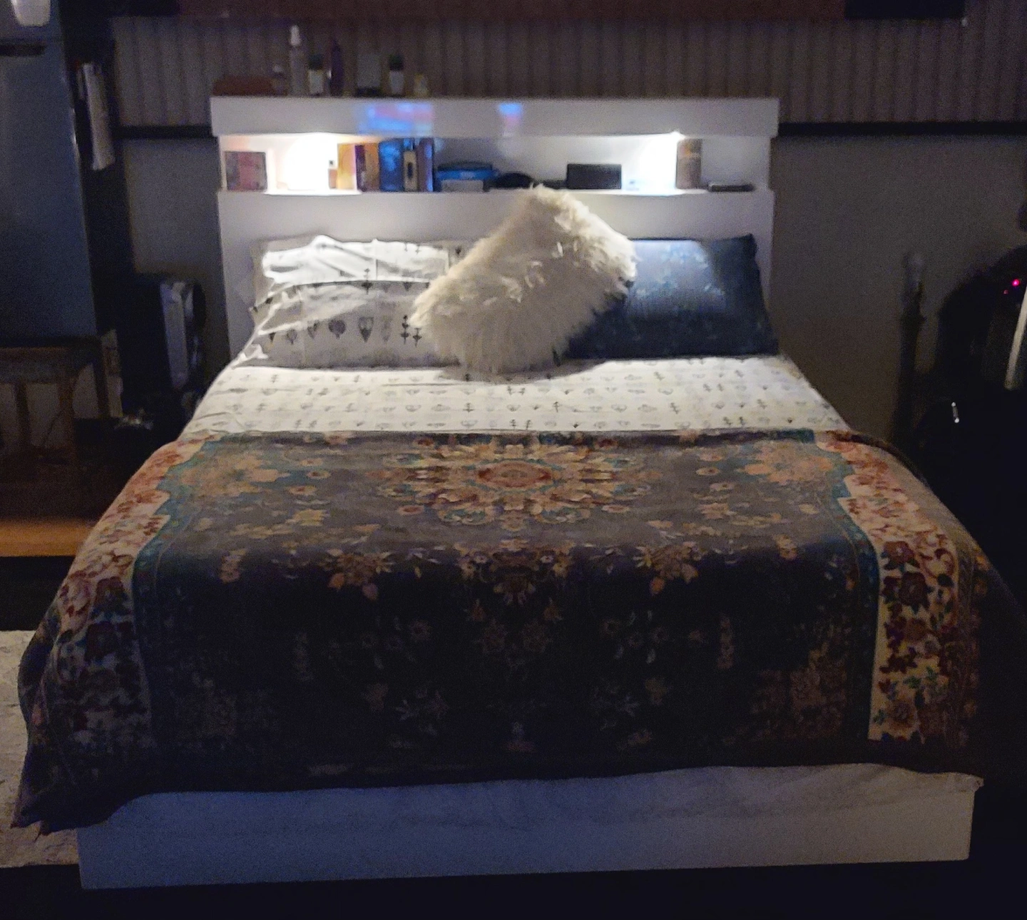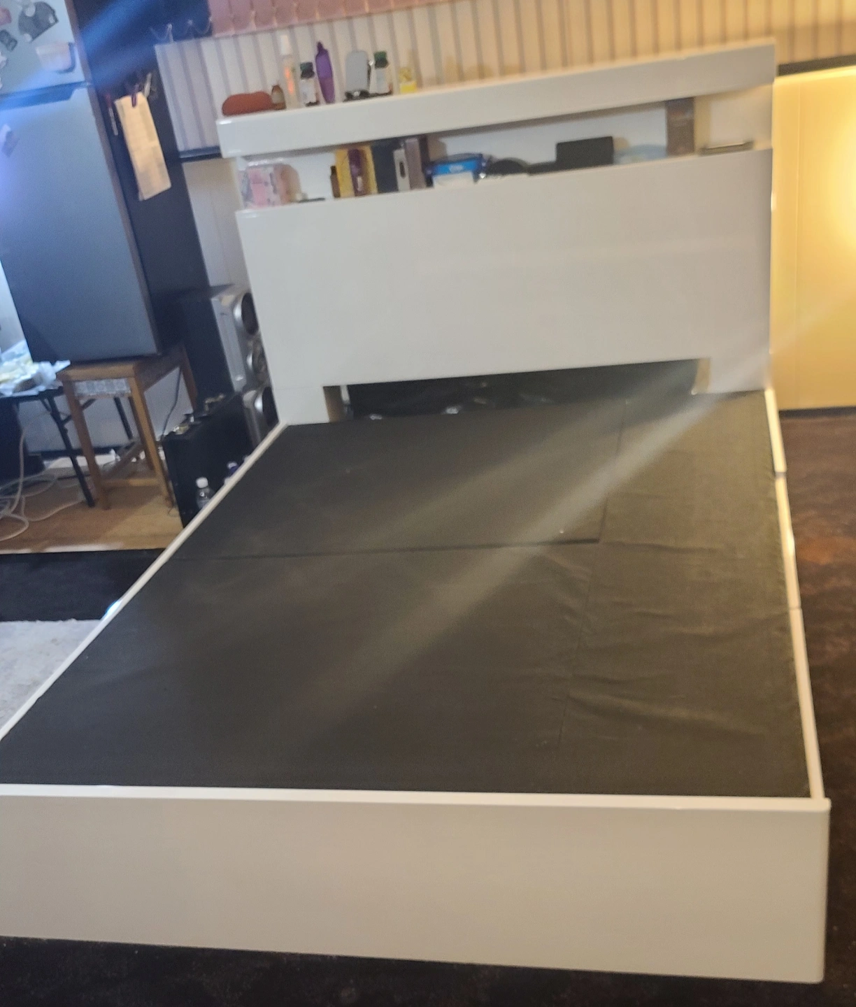 White bed frame. Includes a headboard with built-in shelving. Simple and elegant design, with a black fabric base. You might find a good nights sleep here, or even a calming daytime rest.