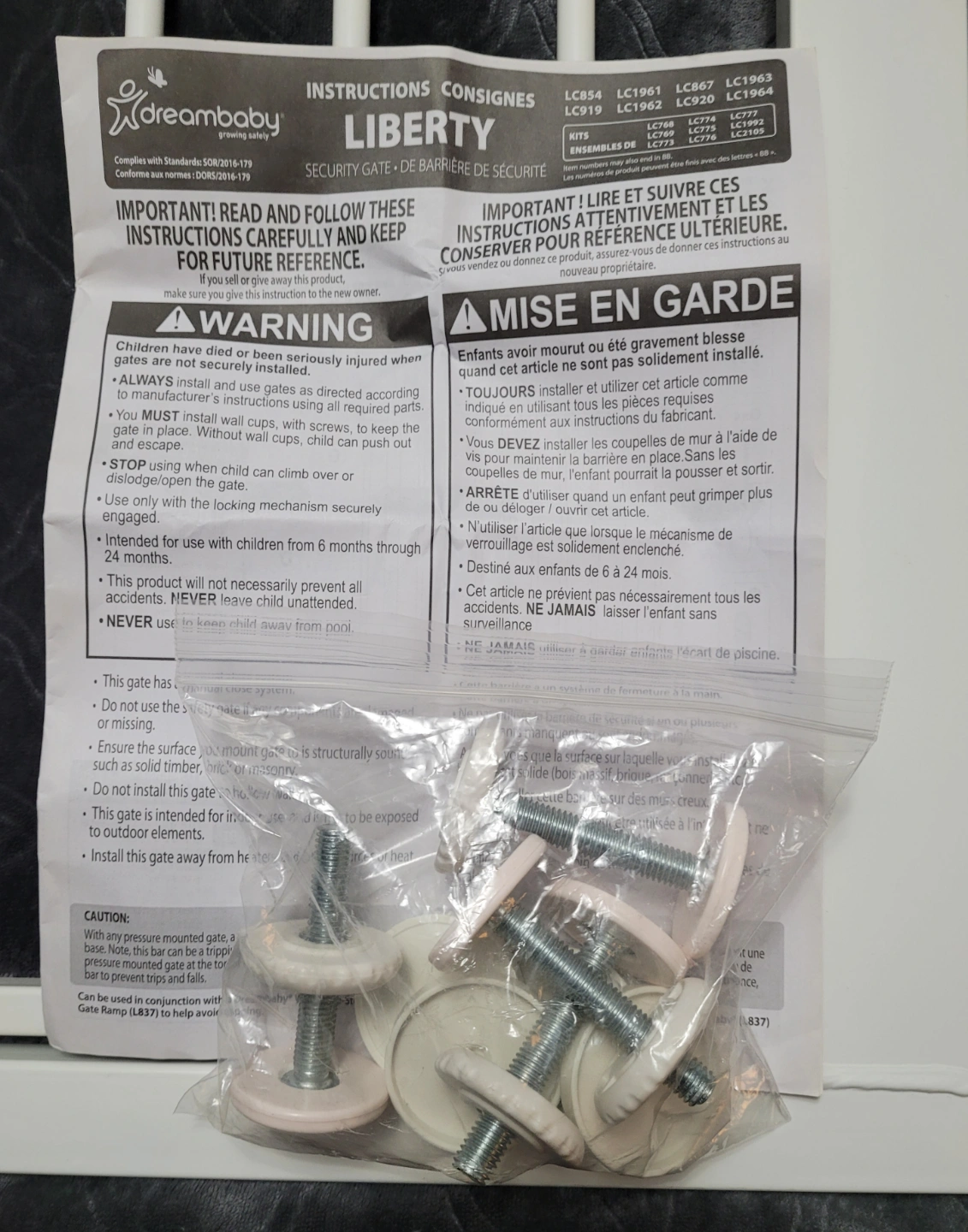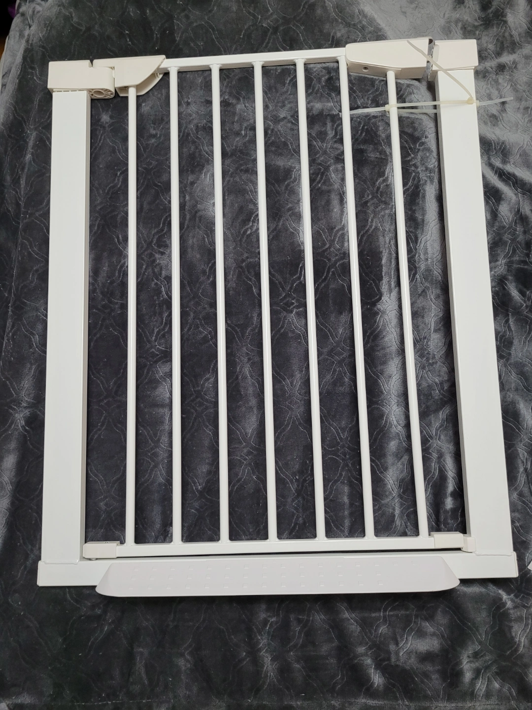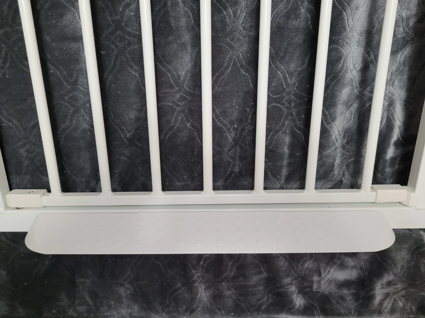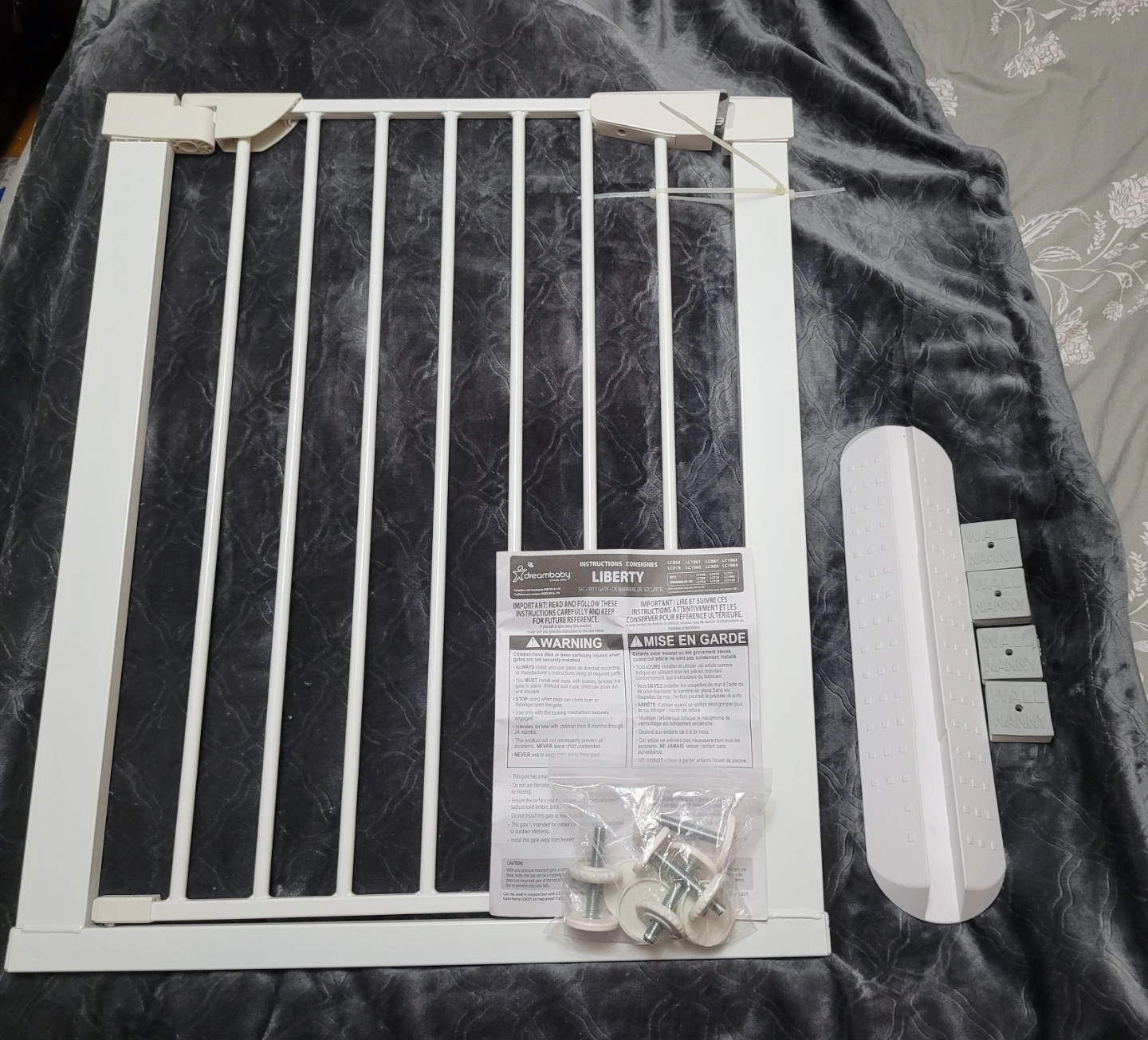 White safety gate. Vertical bars. Comes with original pressure mounting hardware, as well as "wall nanny" wall protectors and a trip proof base attachment that were all bought separately. Retail value at purchase was about $150 for all items. Pick up only, Don Mills and York Mills area.