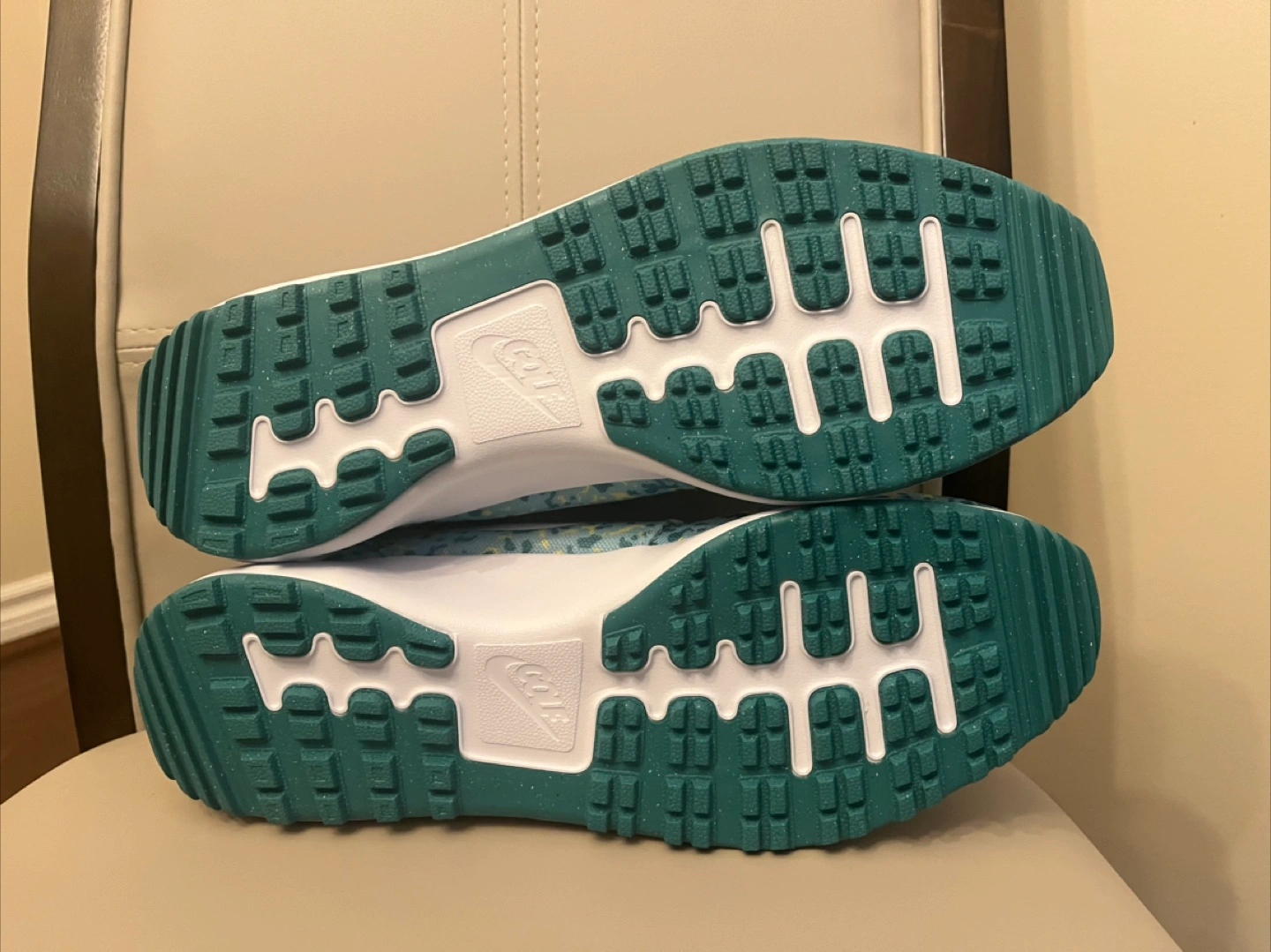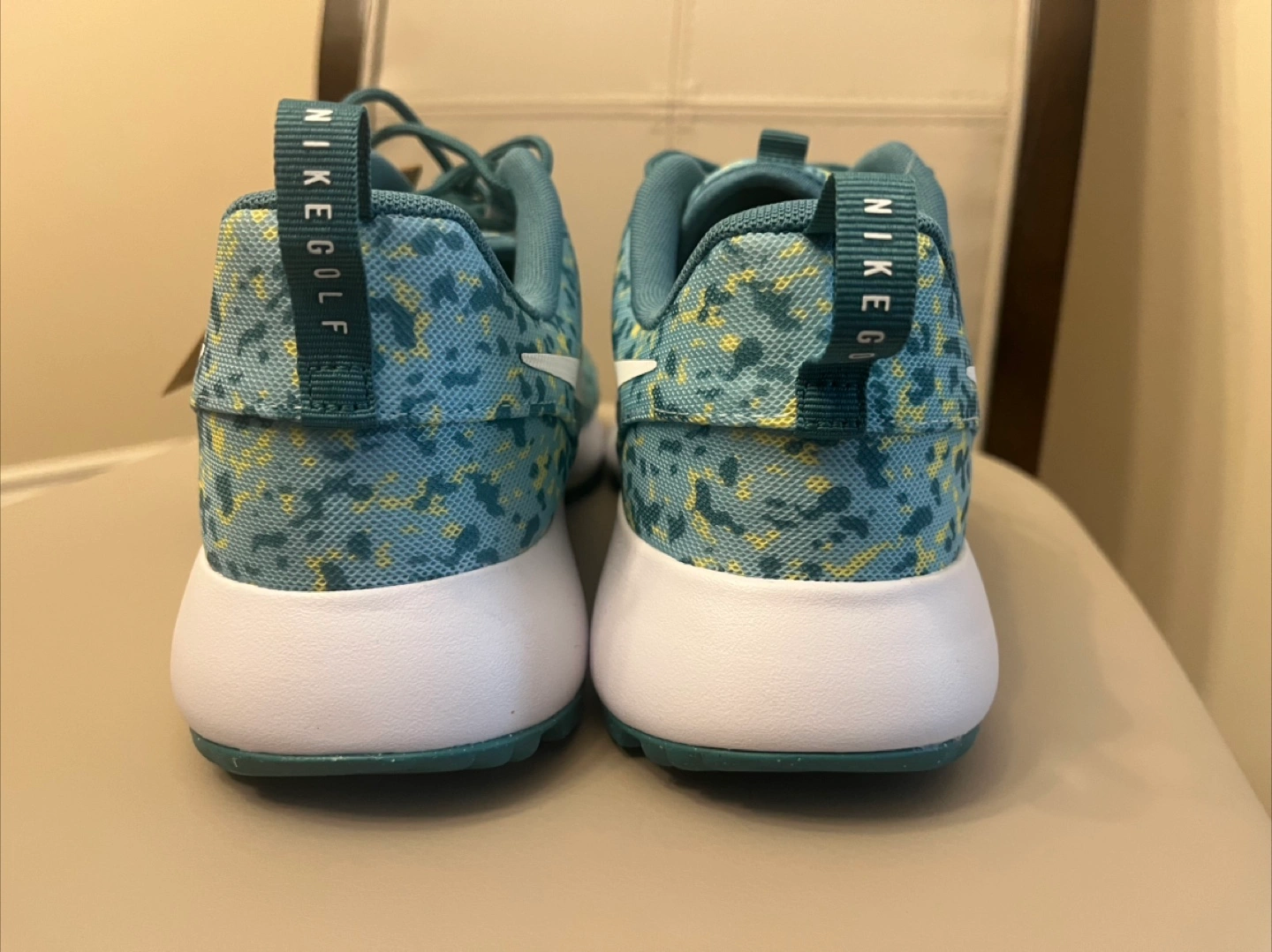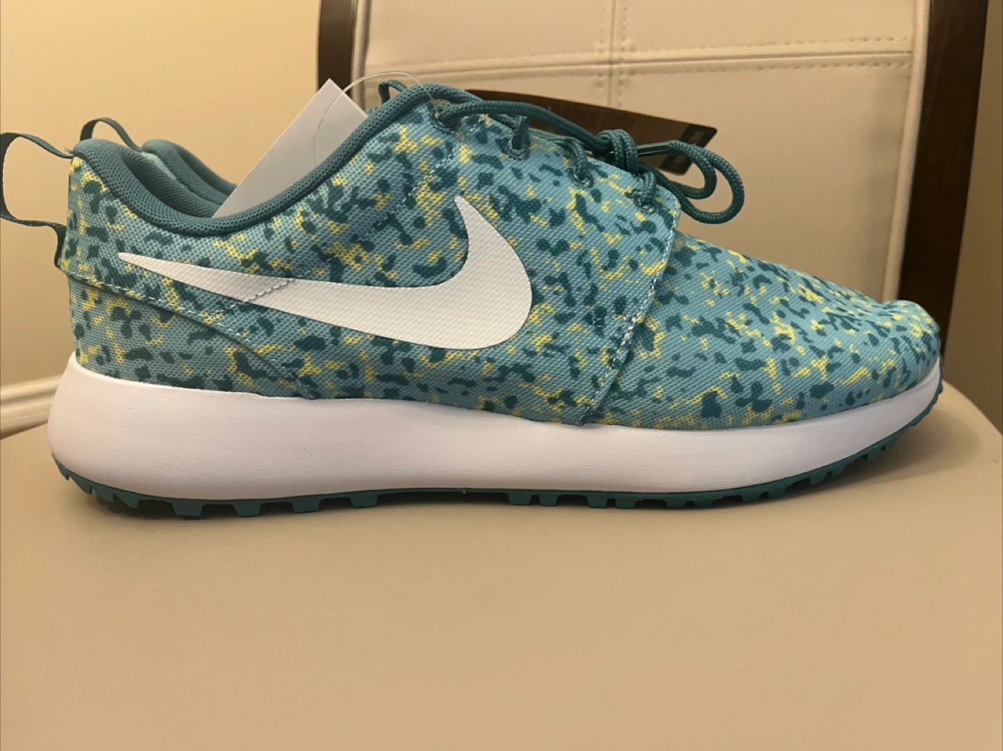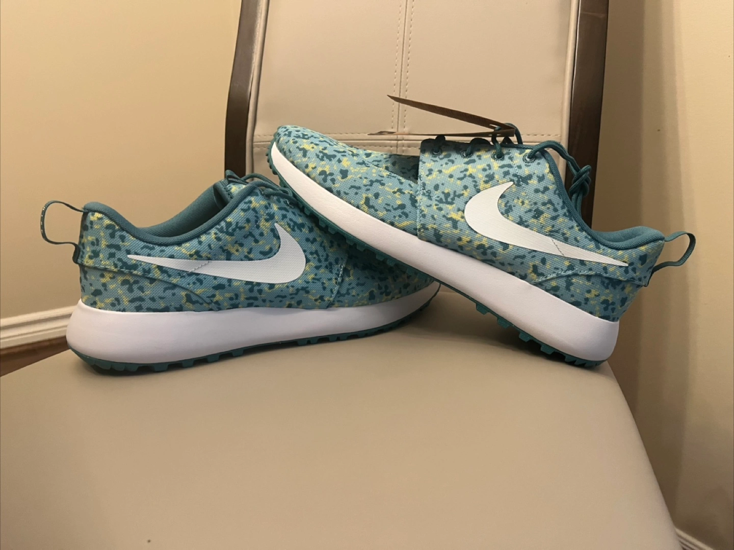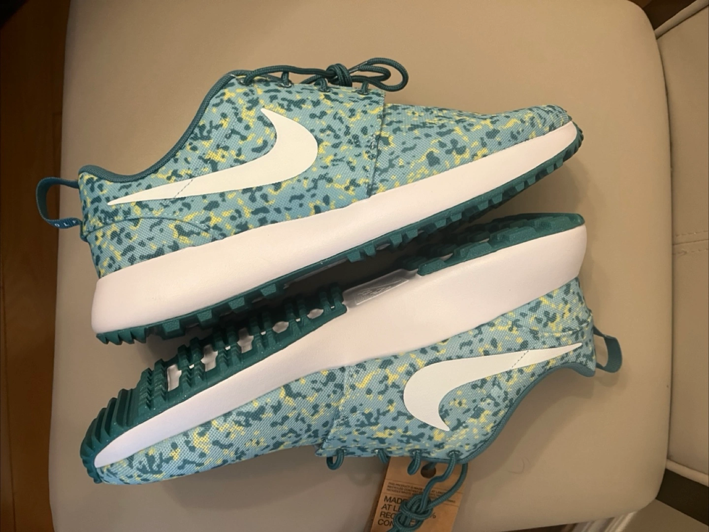 brand new original nike golf shoes size 10 .5 price is fixed plz Elevate your game with these Nike Roshe G Next Nature Ocean Bliss spikeless golf shoes. Designed for men, these sneakers feature a blue colorway with a rubber cleat type for optimal performance on the golf course. The shoes are part of the Nike Roshe product line and boast a sleek style code of FD2599400. from smoke and pet free home no box Golf shoes with a blue and yellow speckled pattern. White soles and the iconic Nike swoosh. Designed with a loop at the heel and lace-up closure. A great way to enjoy a day out on the course, in peace.