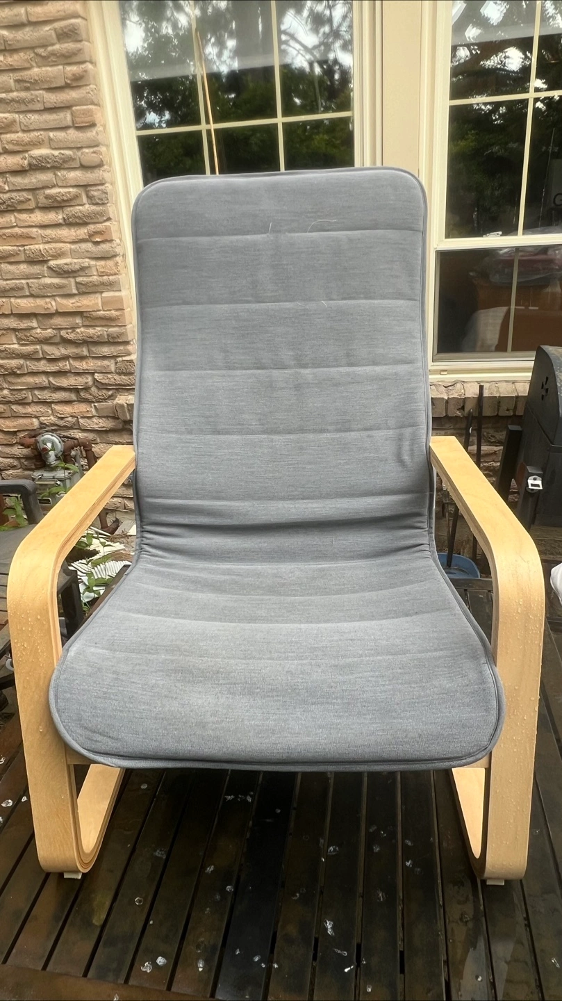 Chair features a light-coloured wooden frame. Comes with a grey cushion. It could be a great place to read a book and relax.