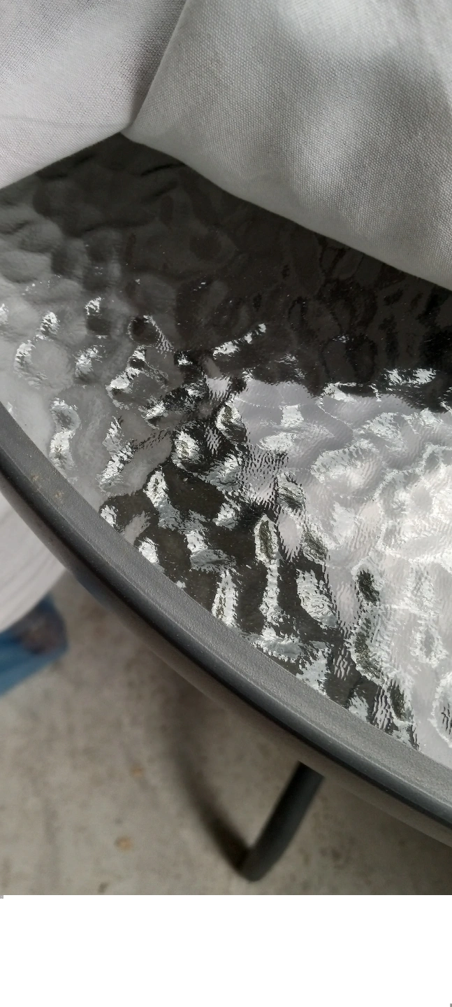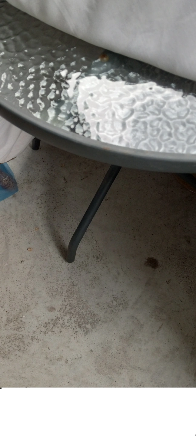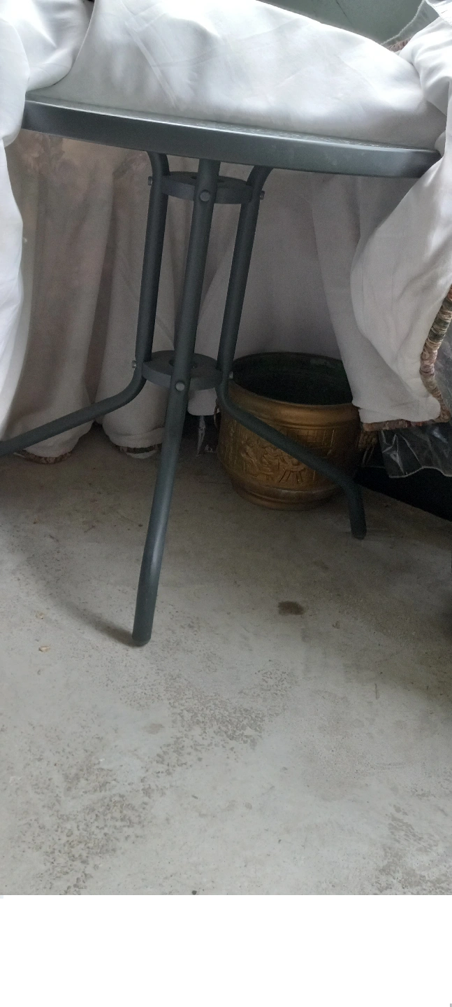 Metal frame table. Features a patterned tabletop. Table cloths available for small fee. Consider this for a relaxing morning coffee outside.