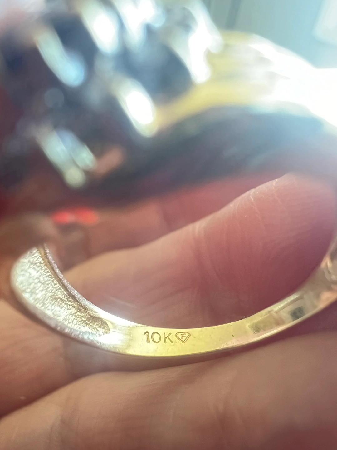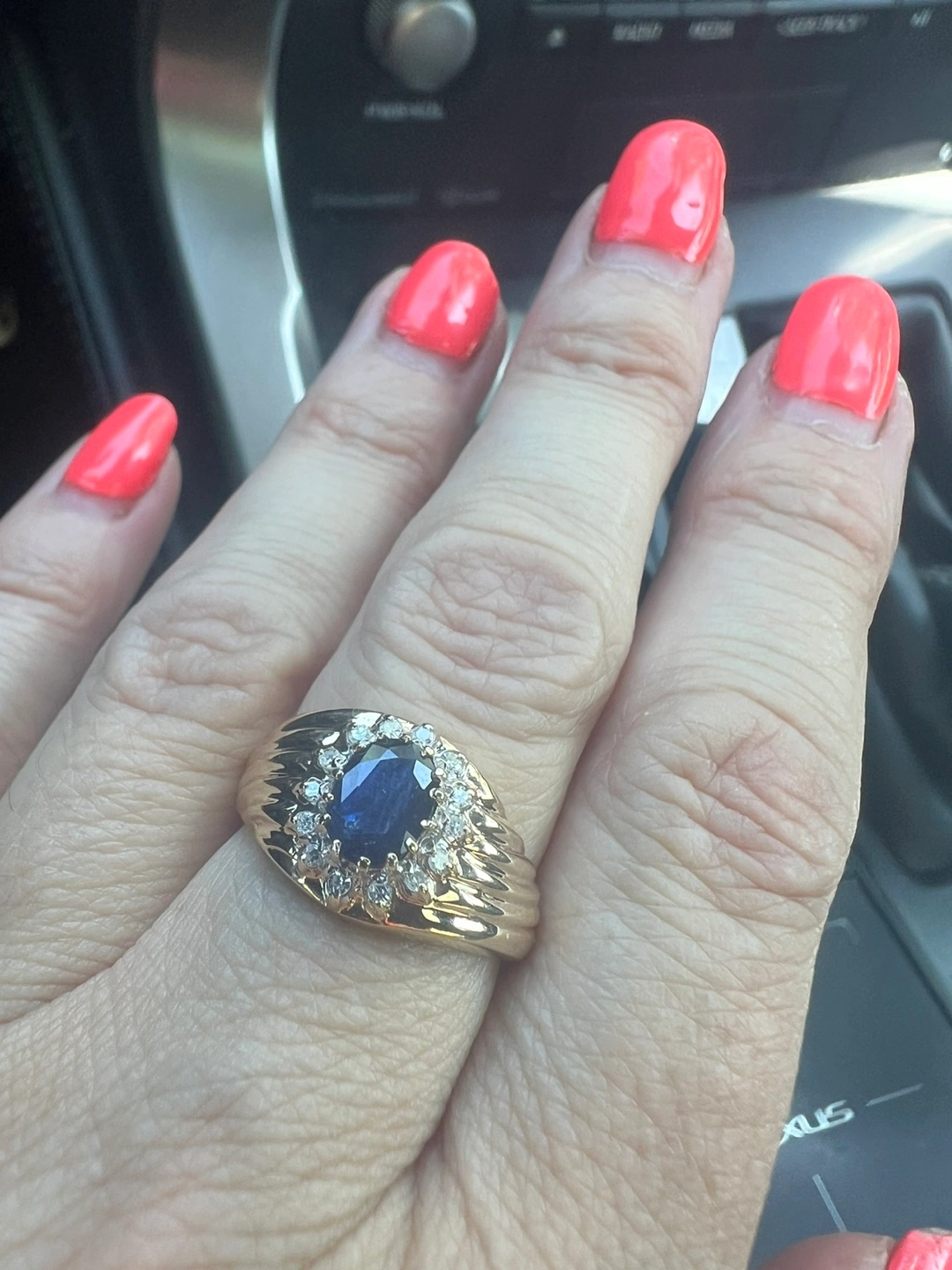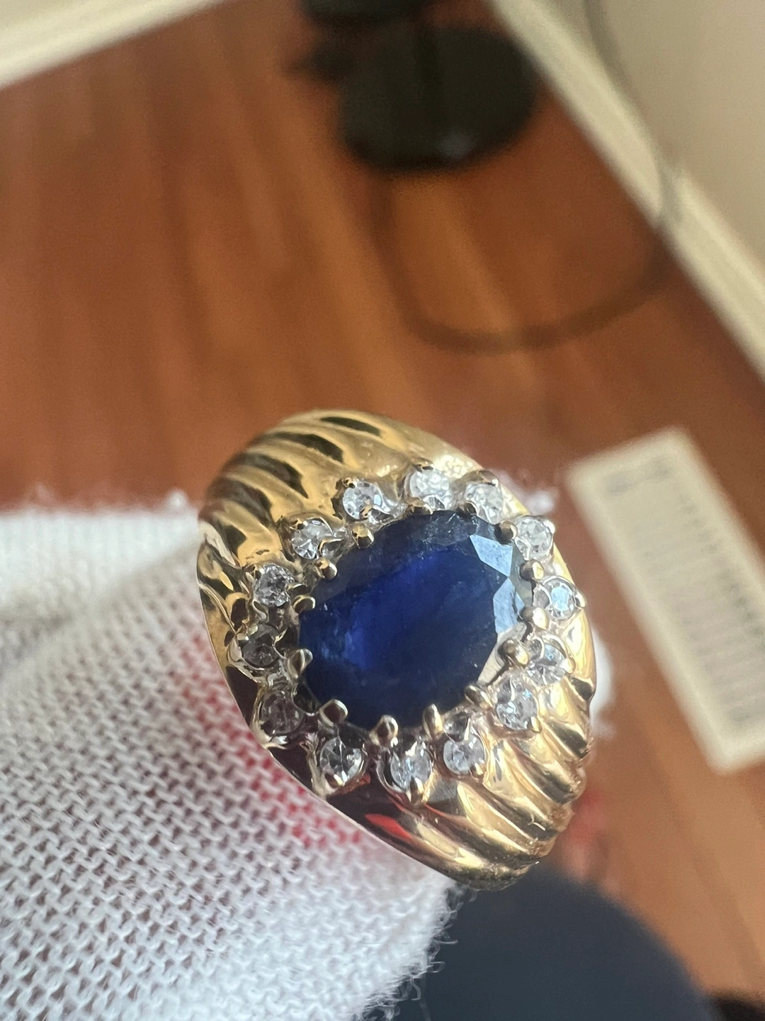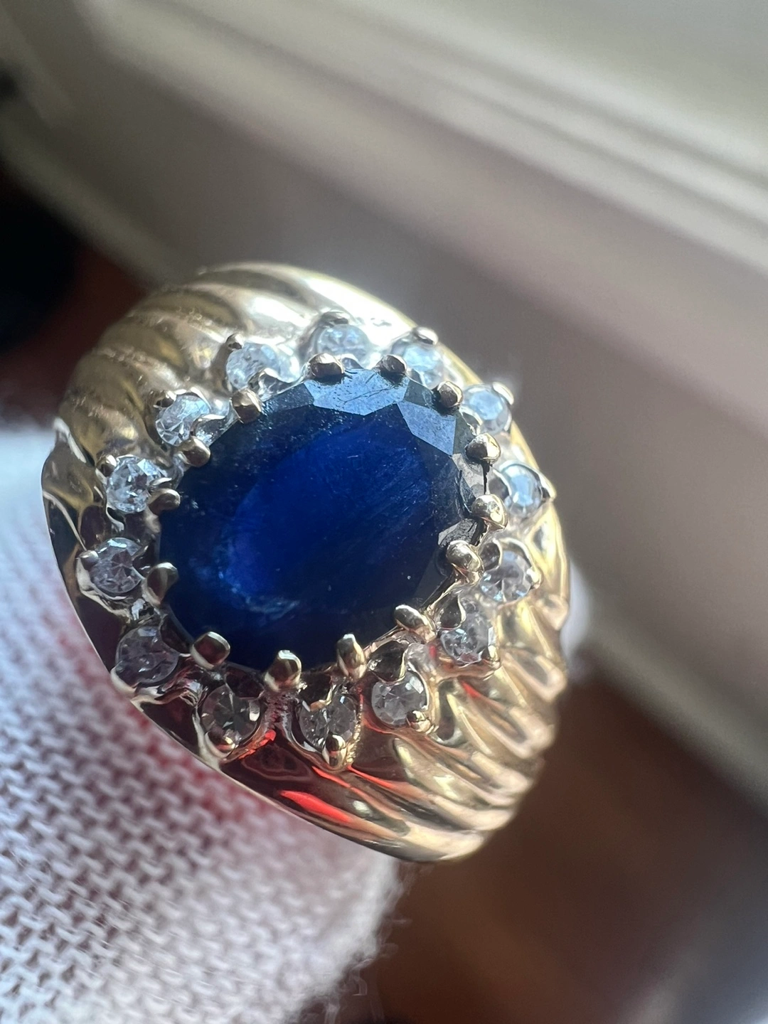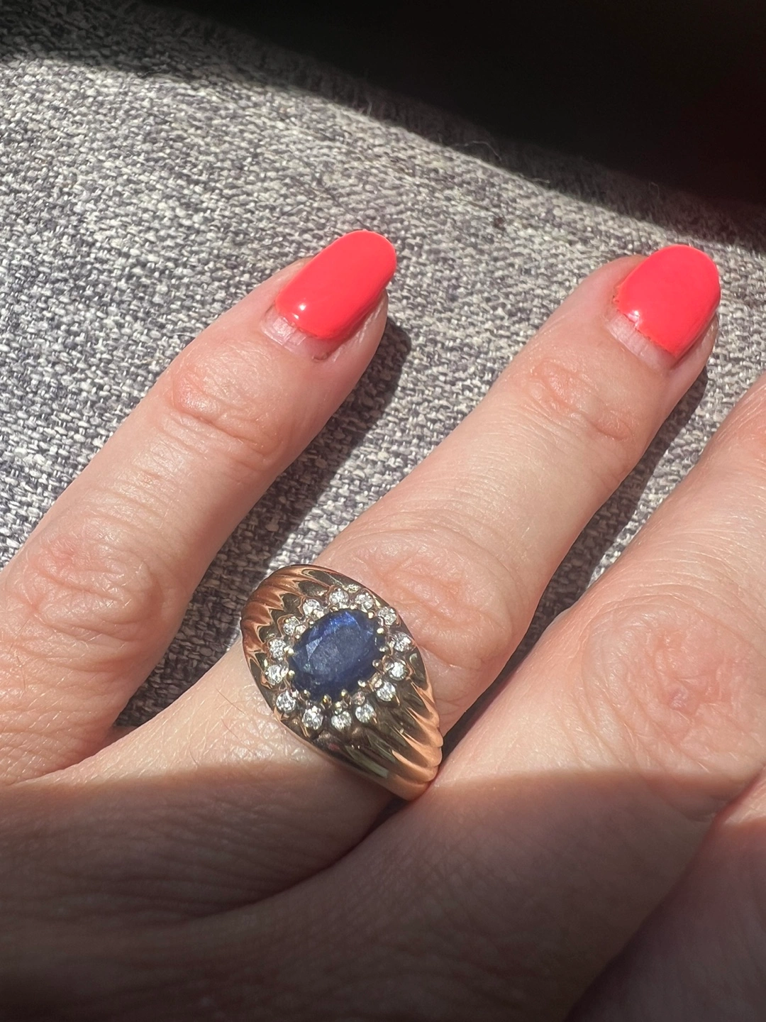Ring with a blue stone and a cluster of diamonds. A beautiful ring like this would be perfect to wear on a date. Size 6.5-7