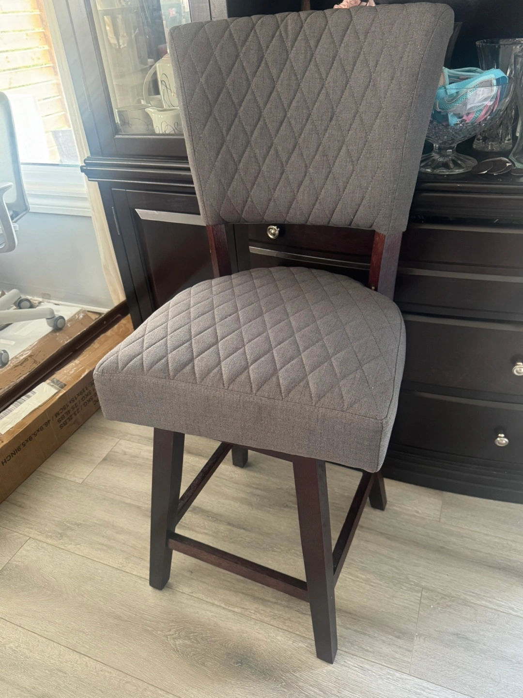 Swivel Bar Stool, Counter Height Stool with Wood Legs and Footrests for Dining Room, Dark Grey NEW NOT IN ORIGINAL BOX Overall Dimensions: 19.75"W x 22"D x 40.25"H. Weight Capacity: 264 lbs (seat), 66lbs (footrest). Easy to assemble. They feature thick cushions made of breathable linen-feel fabric. Our counter height bar stools also provide plenty of back support and superior seating comfort. Likewise, the legs with anti-slip foot pads are made of rubber wood, ensuring stability and safety. PICKUP IN COURTICE NEAR HWY 2 AND COURTICE RD all sales are final