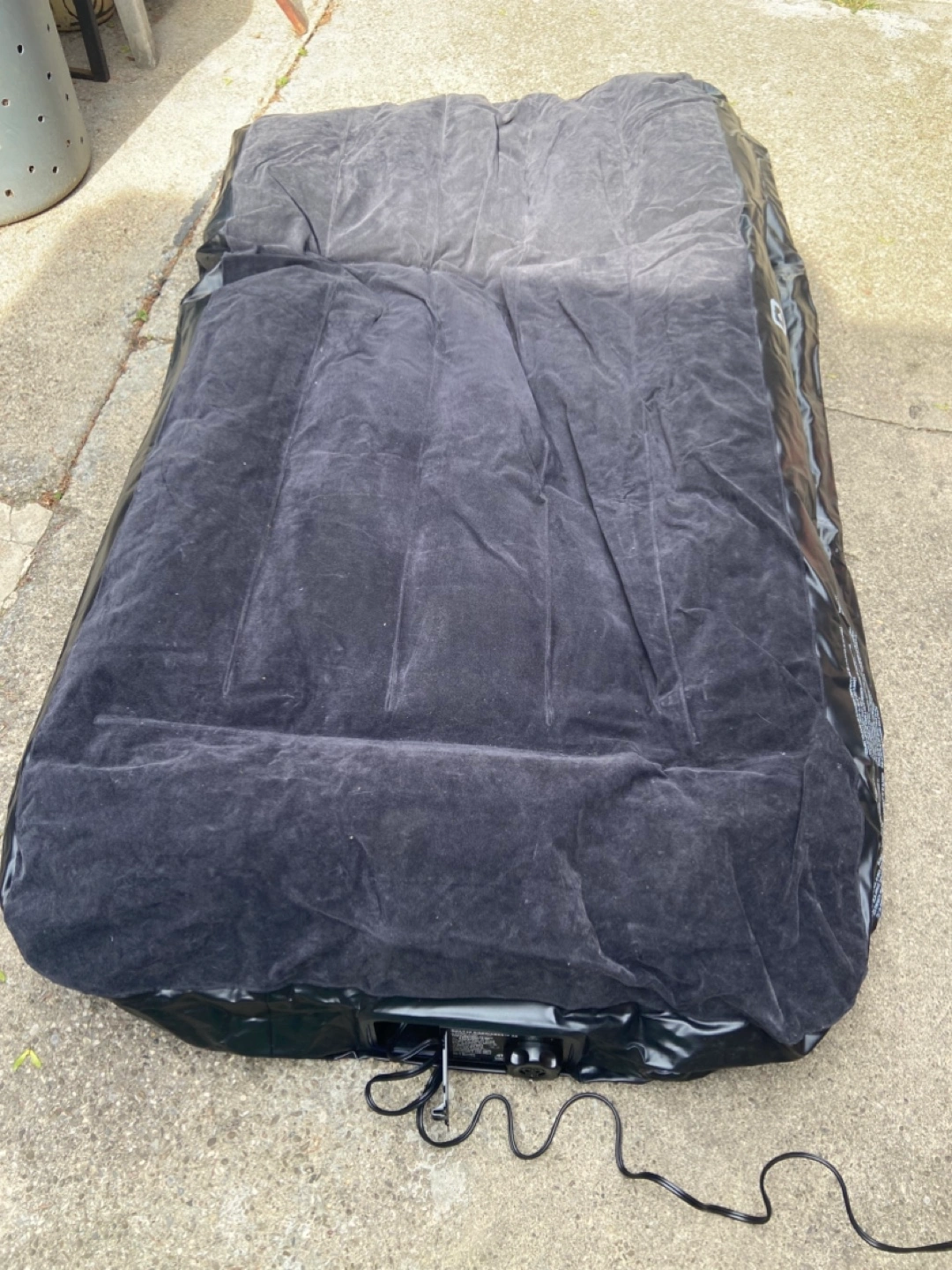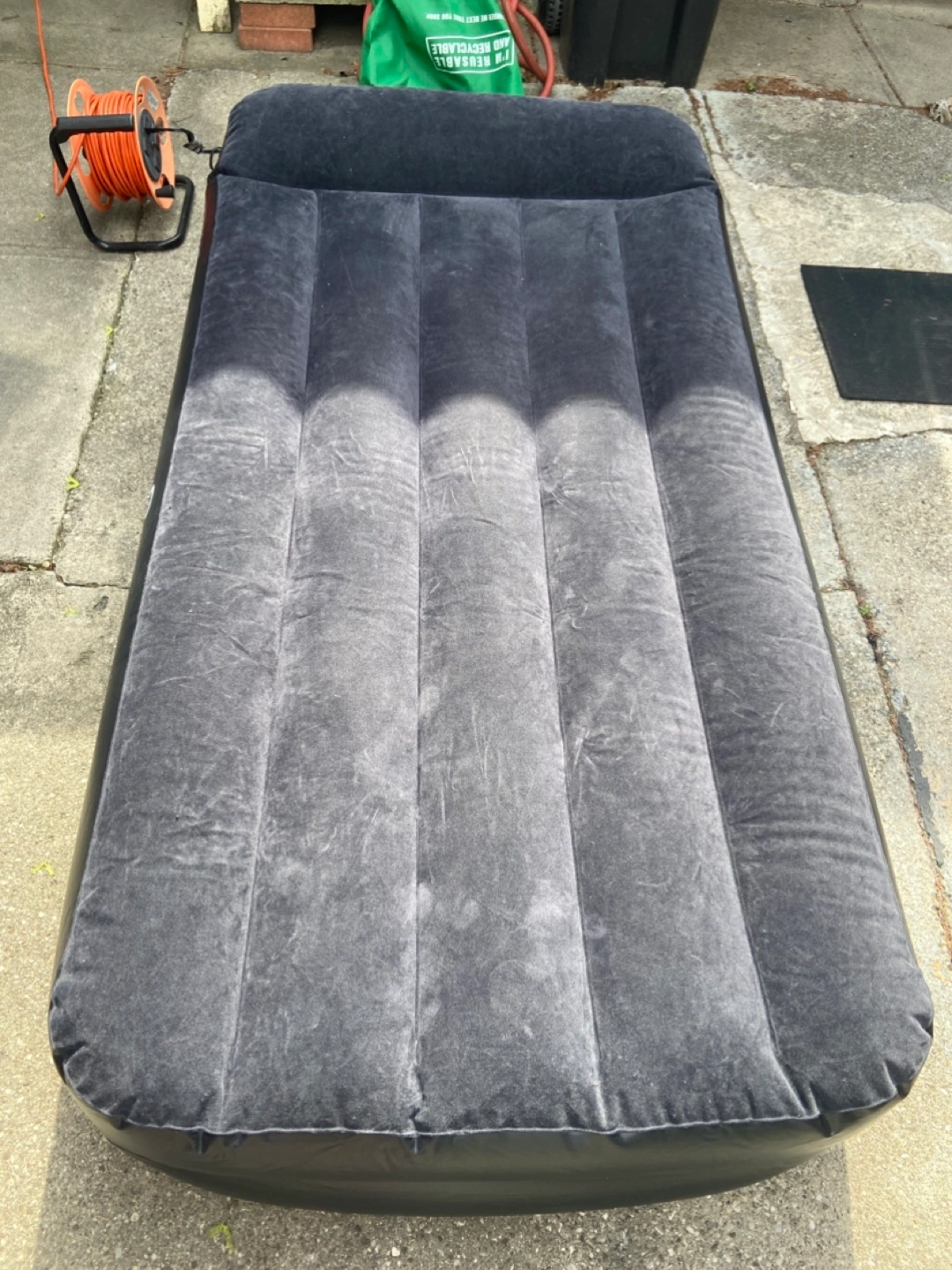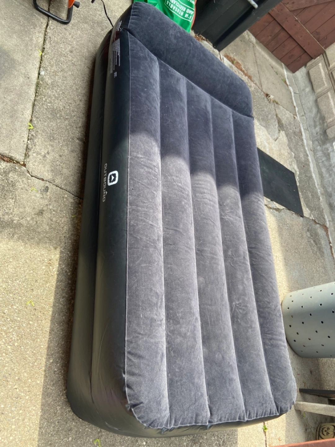 Outbound Twin Air Mattress Get ready for comfortable nights with this used Outbound air mattress, perfect for camping or guests! This twin size air mattress comes with a built-in Sidewinder AC electric pump for easy inflation and deflation. It’s in good condition and ready for its next adventure. Specifications: Condition- in good condition and shape. Has No Rips , No stains. Hardly used. Works perfectly! Nothing wrong with it. Colour- dark navy, black 2017-07-07 * Brand: Outbound * Size: twin * Pump: Built-in Sidewinder AC electric pump Twin size airbed with a soft flocked top for added comfort Sturdy coil beam construction ensures durability and support Comes with an integrated pillow for extra comfort Built-in pump connects to a 120V outlet for rapid inflation and deflation Quick inflation/deflation screw valve Includes a carry bag and repair patch Replacement Boston Valve Caps sold separately (079-7087) Dimensions: 75’’ x 38’’ x 18’’ (190.5 x 96.5 x 45.7 cm) Maximum user weight capacity: 330 lbs (150 kg) NOTE: It is normal that air beds will stretch and decrease in air pressure after the first several uses. Your air bed is not leaking, simply add air to your desired firmness and the air pressure will stabilize over several uses The Outbound Twin Double-High Inflatable Air Mattress with Built-In Pump & Pillow is perfect for camping, cottage trips, and even surprise house guests or sleepovers. This inflatable air mattress provides superior comfort with even weight distribution to prevent sagging, ensuring a restful night’s sleep. Its durable, water-resistant vinyl construction is built for outdoor use, while the flocked surface keeps you cool and well-ventilated, even without sheets. The mattress inflates and deflates quickly using its integrated pump that plugs into any standard outlet, making setup and storage a breeze. Cash Payment Only & Pick up Only No Refunds / Exchange No try ons, No trading, No holds. All purchases are Finally Sale From a Smoke Free home Fast pick up Confirmed Price-$50 Cash only Comes with original bag Selling as is Confirmed that it works Pick up- Only at TTC Station- Coxwell subway station Located In East York, Toronto Dreaming of a restful sleep? Grab this air mattress before it floats away! Just a friendly reminder: if the ad is up, it’s still available!