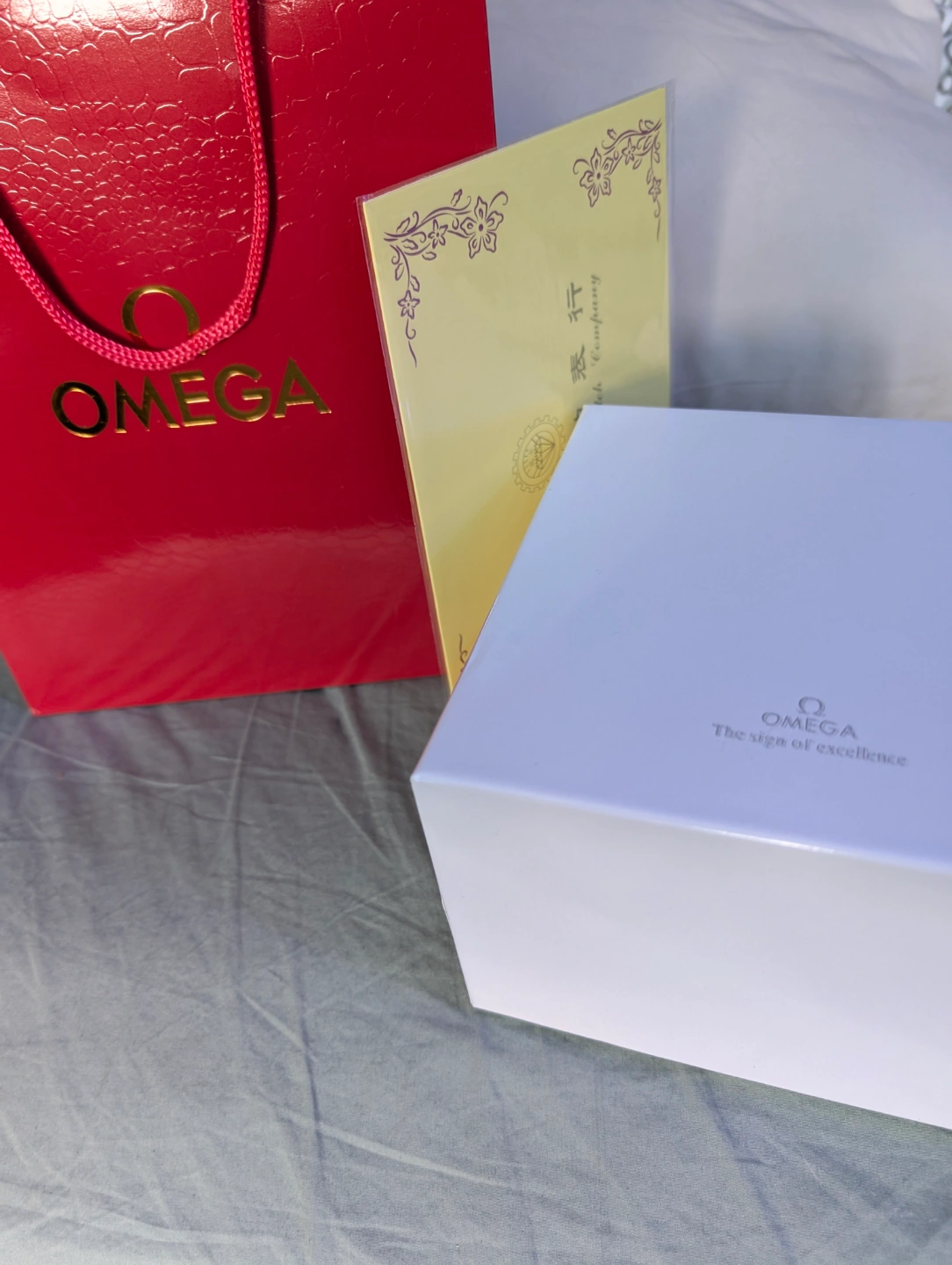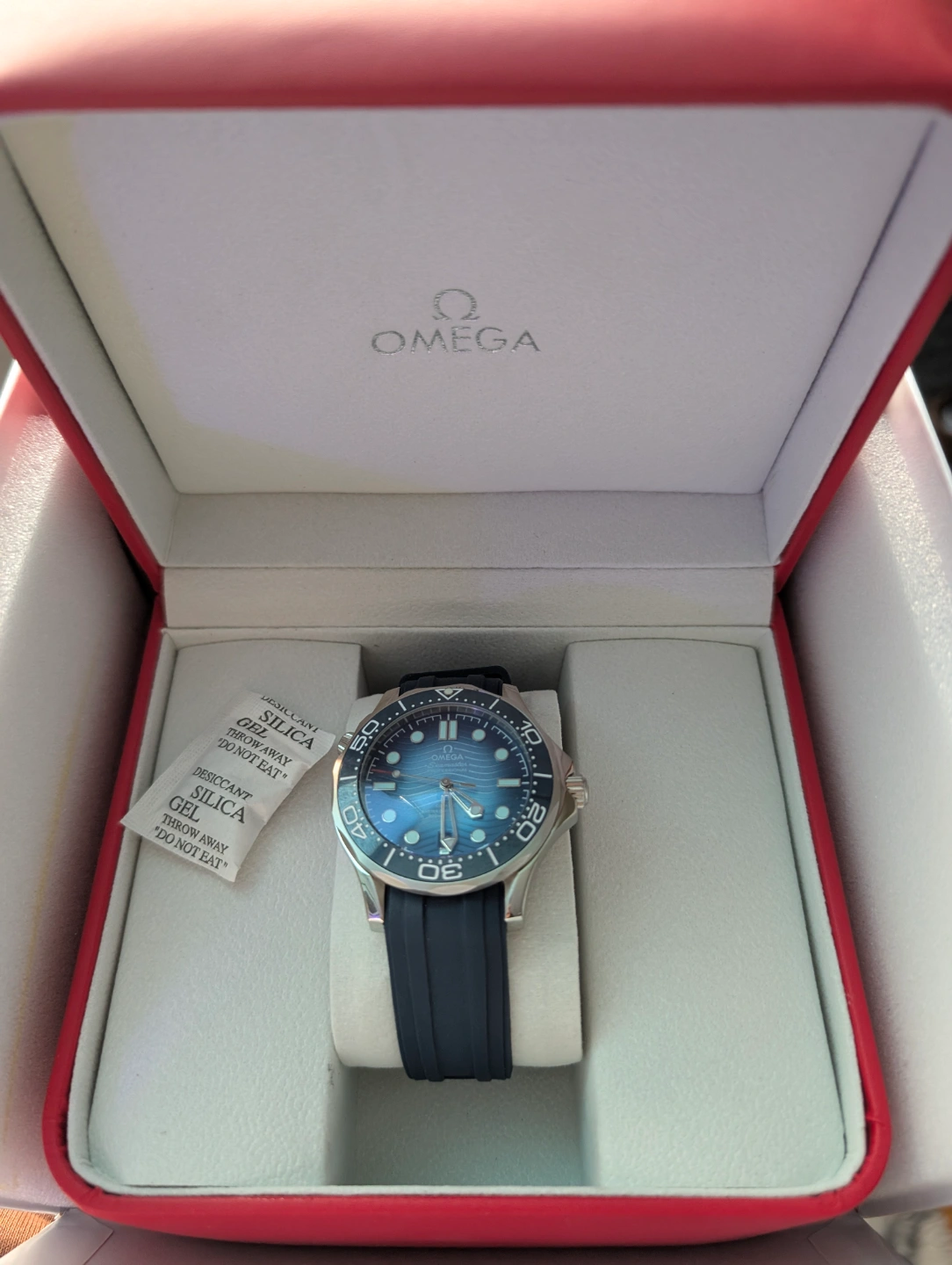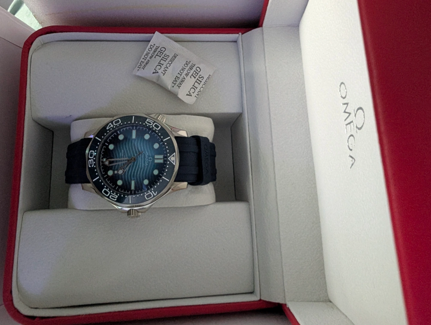Wristwatch with a dark blue strap and a blue dial. It sits in a case with a red exterior and white interior. Includes a shopping bag and documents. Wearing a beautiful watch like this can bring you peace of mind.