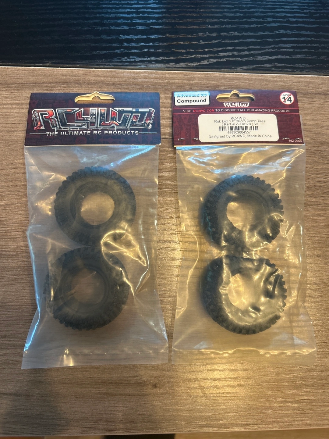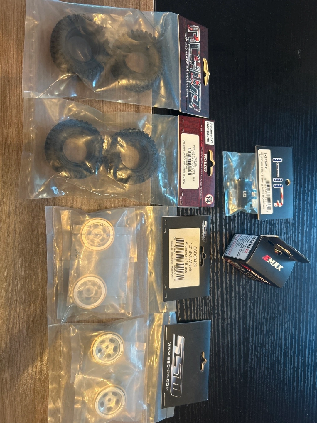 A collection of new RC car parts, including tires, wheels and servo mount. These components are waiting to find a good home. Axial SCX24 Scale