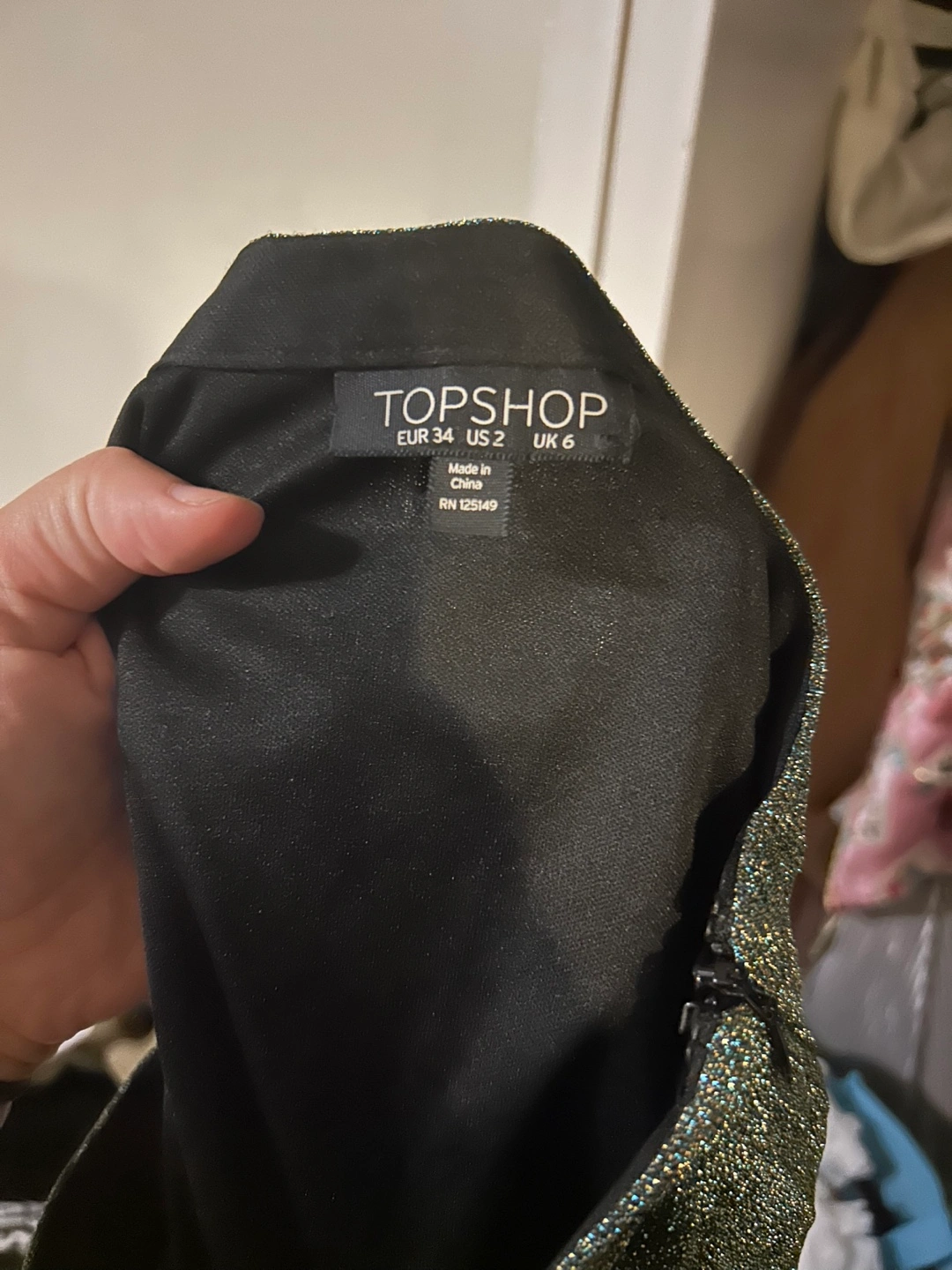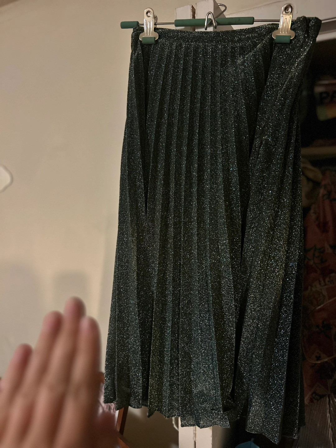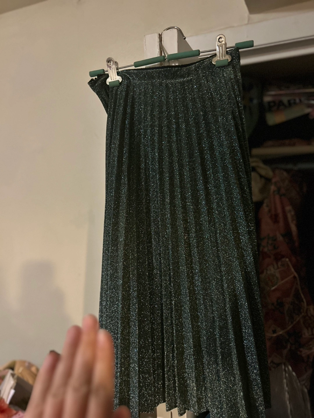 Pleated skirt. Metallic detailing. High-waisted. You can wear this skirt while enjoying a relaxing evening.