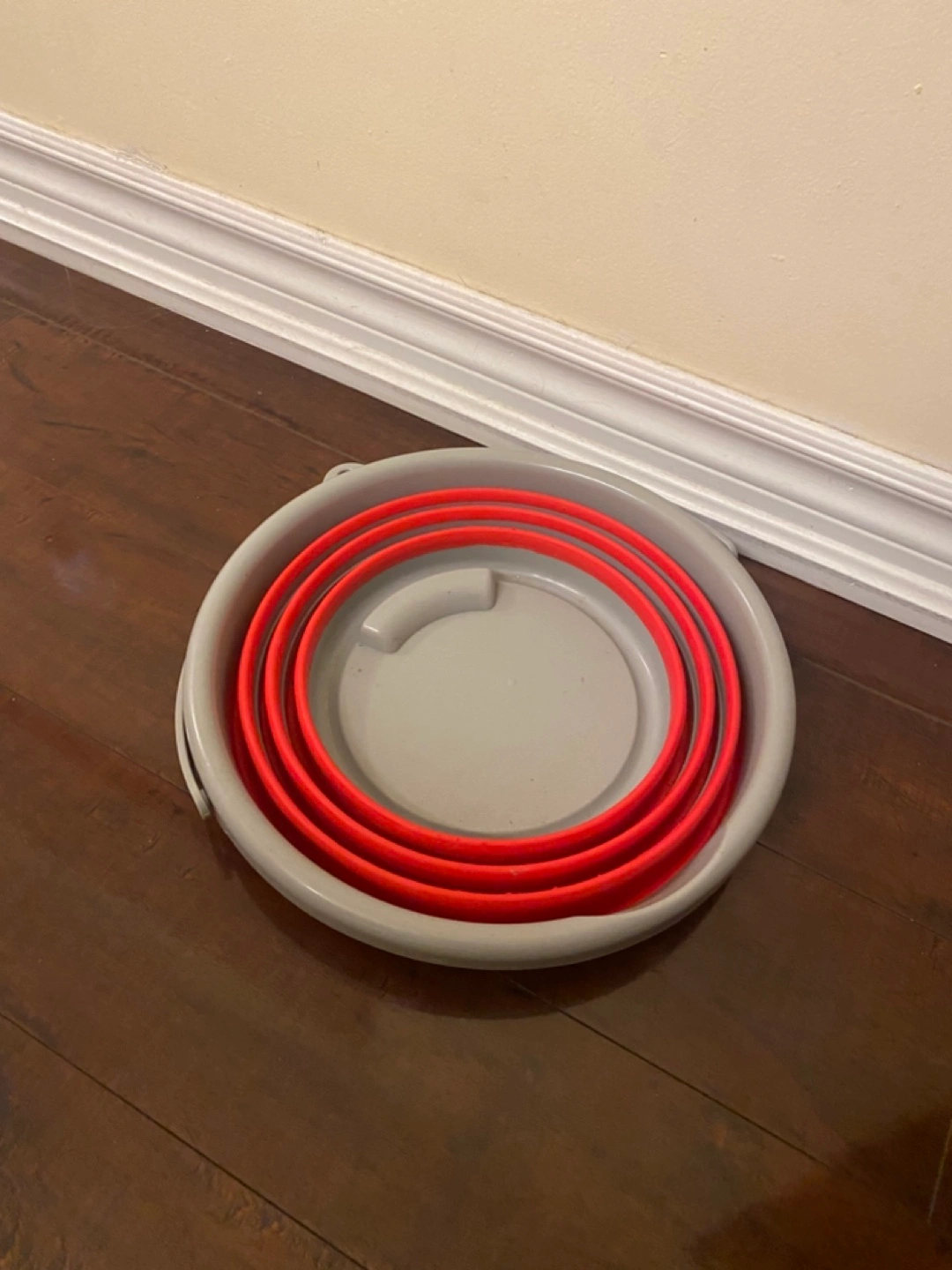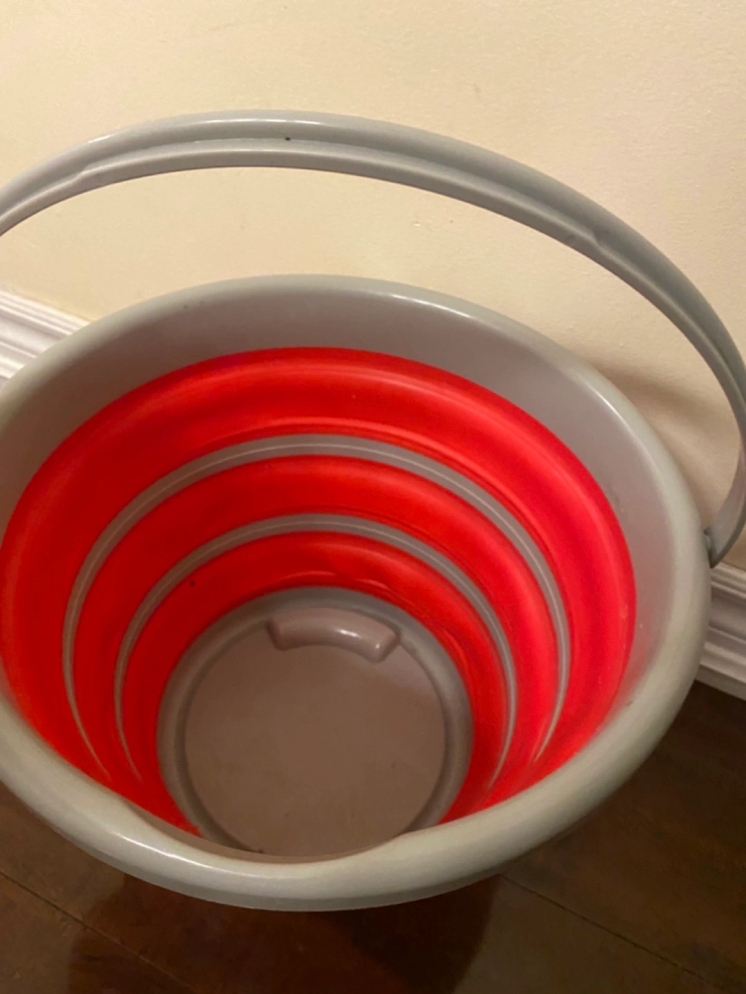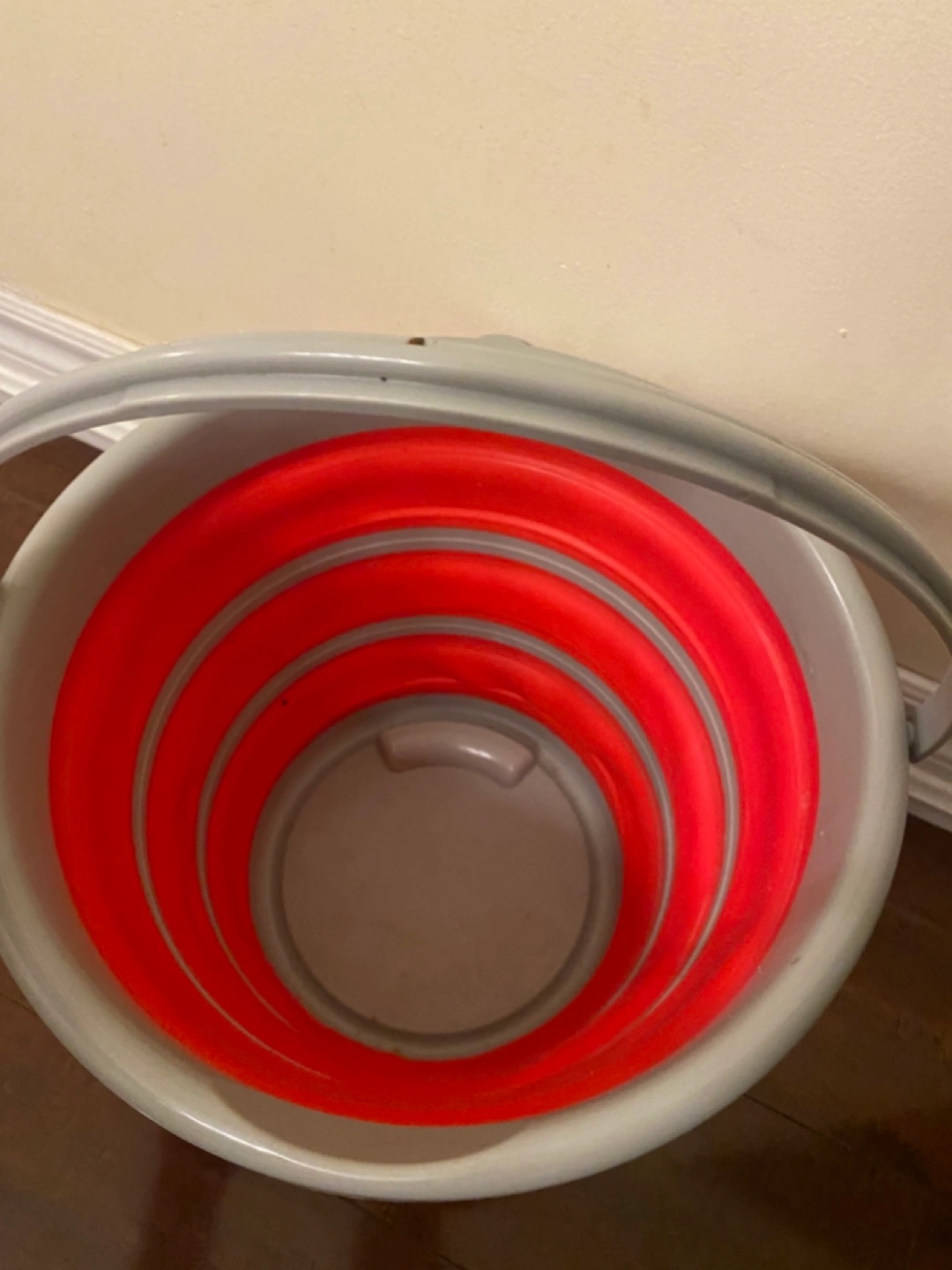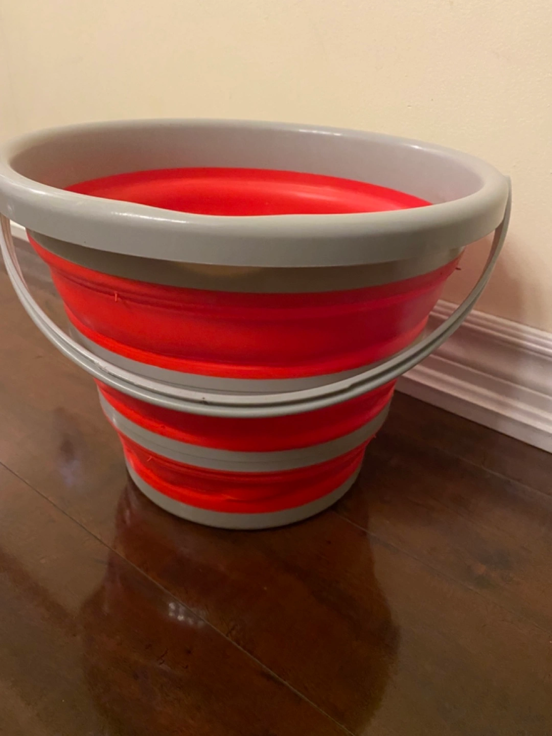 Bucket with a red and gray colour scheme. Has a foldable design. Equipped with a handle for carrying. A convenient bucket for everyday use.