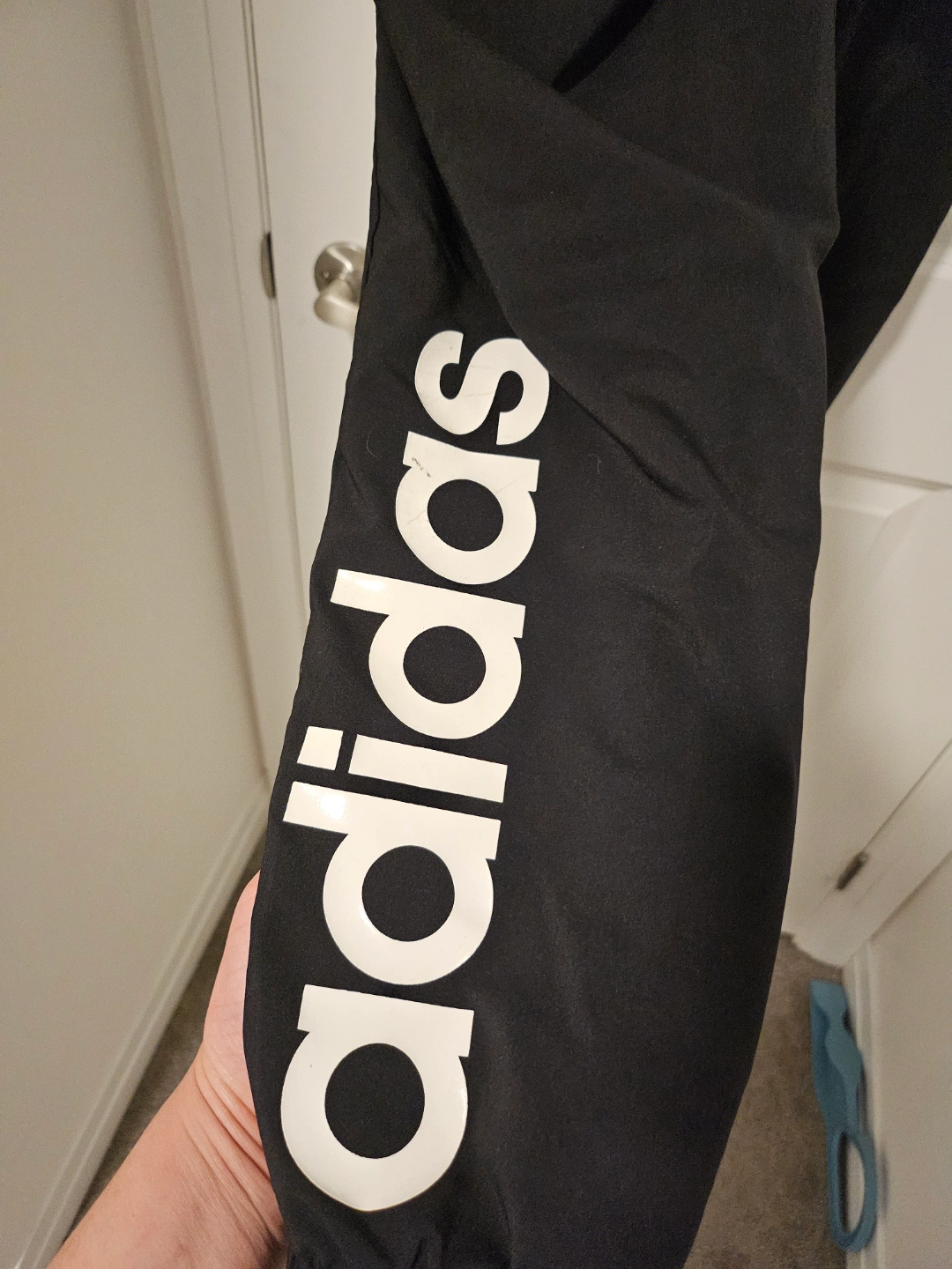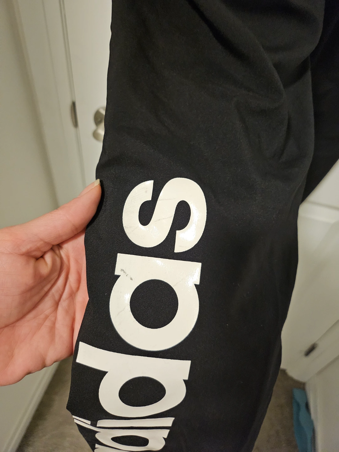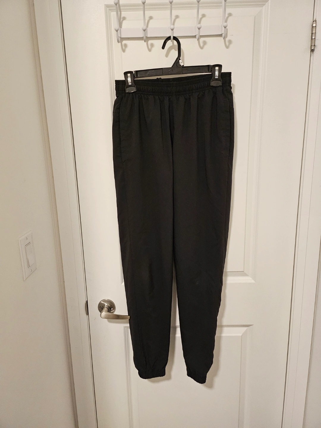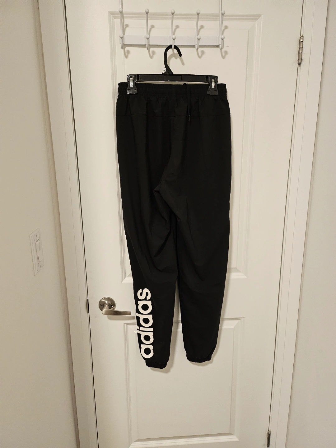 Black track pants. Cuffed ankles. Features pockets and an elastic waistband. Large white Adidas logo on the back of the leg. These pants are perfect for relaxing on a cool day. Excellent condition