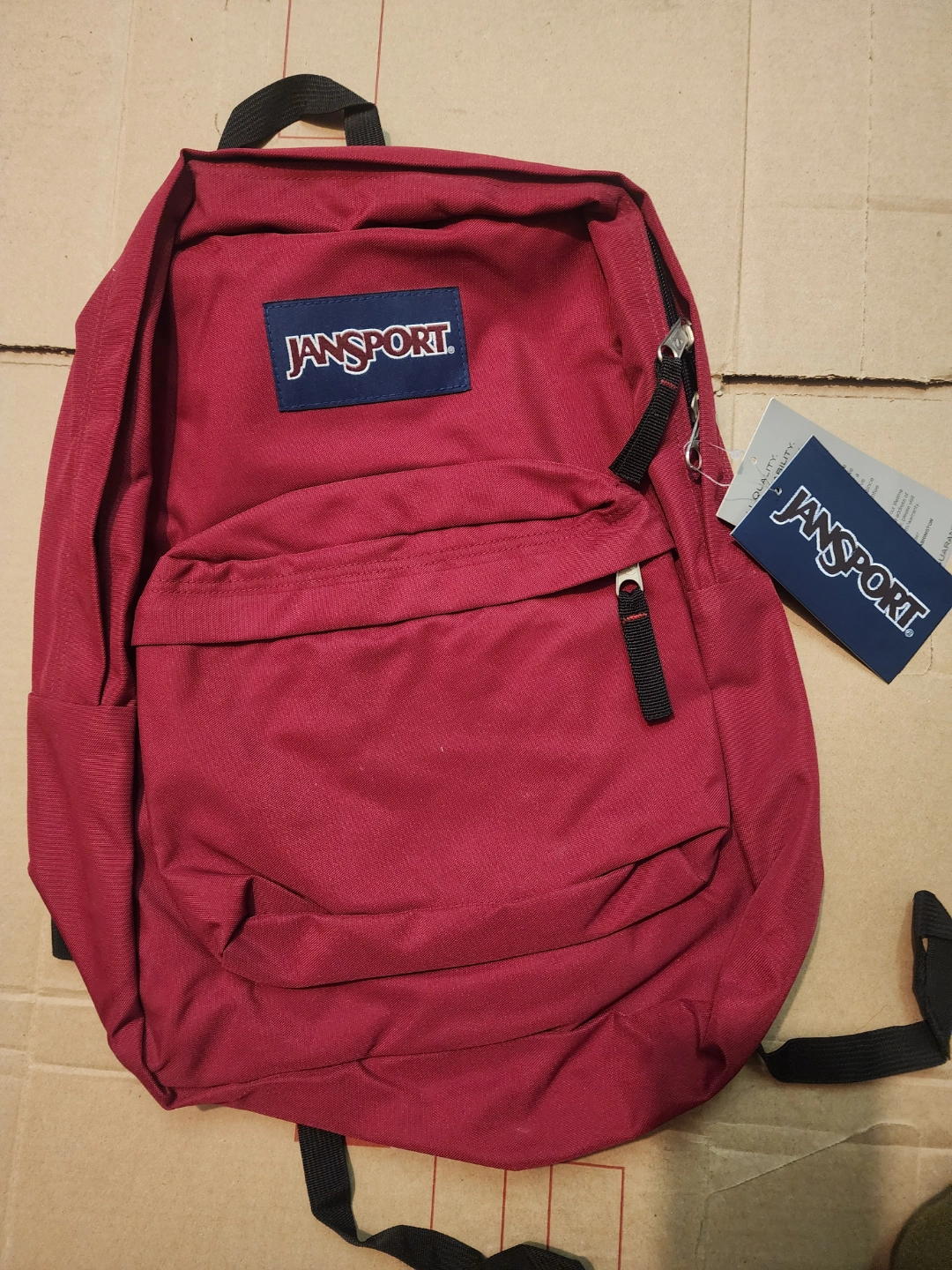 Maroon coloured backpack. Has a front pocket with a zipper. Features a carrying handle and adjustable straps. A great way to organize your belongings is with a backpack like this one.